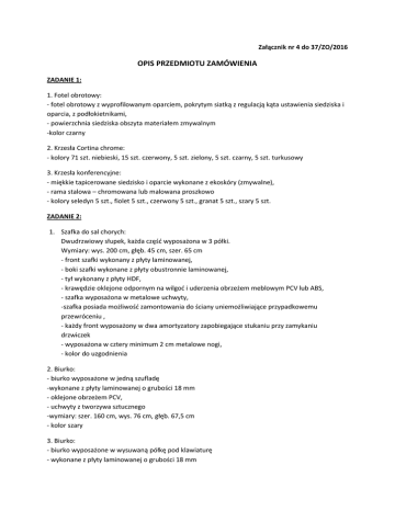 Załącznik nr 4 do 37/ZO/2016 OPIS PRZEDMIOTU ZAMÓWIENIA ZADANIE 1: 1. Fotel obrotowy: - fotel obrotowy z wyprofilowanym oparciem, pokrytym siatką z regulacją kąta ustawienia siedziska i oparcia, z podłokietnikami, - powierzchnia siedziska obszyta materiałem zmywalnym -kolor czarny 2. Krzesła Cortina chrome: - kolory 71 szt. niebieski, 15 szt. czerwony, 5 szt. zielony, 5 szt. czarny, 5 szt. turkusowy 3. Krzesła konferencyjne: - miękkie tapicerowane siedzisko i oparcie wykonane z ekoskóry (zmywalne), - rama stalowa – chromowana lub malowana proszkowo - kolory seledyn 5 szt., fiolet 5 szt., czerwony 5 szt., granat 5 szt., szary 5 szt. ZADANIE 2: 1. Szafka do sal chorych: Dwudrzwiowy słupek, każda część wyposażona w 3 półki. Wymiary: wys. 200 cm, głęb. 45 cm, szer. 65 cm - front szafki wykonany z płyty laminowanej, - boki szafki wykonane z płyty obustronnie laminowanej, - tył wykonany z płyty HDF, - krawędzie oklejone odpornym na wilgoć i uderzenia obrzeżem meblowym PCV lub ABS, - szafka wyposażona w metalowe uchwyty, -szafka posiada możliwość zamontowania do ściany uniemożliwiające przypadkowemu przewróceniu , - każdy front wyposażony w dwa amortyzatory zapobiegające stukaniu przy zamykaniu drzwiczek - wyposażona w cztery minimum 2 cm metalowe nogi, - kolor do uzgodnienia 2. Biurko: - biurko wyposażone w jedną szufladę -wykonane z płyty laminowanej o grubości 18 mm - oklejone obrzeżem PCV, - uchwyty z tworzywa sztucznego -wymiary: szer. 160 cm, wys. 76 cm, głęb. 67,5 cm - kolor szary 3. Biurko: - biurko wyposażone w wysuwaną półkę pod klawiaturę - wykonane z płyty laminowanej o grubości 18 mm - oklejone obrzeżem PCV, - uchwyty z tworzywa sztucznego -wymiary: szer. 160 cm, wys. 76 cm, głęb. 67,5 cm - kolor szary 4. Łącznik -wykonane z płyty laminowanej o grubości 18 mm - oklejone obrzeżem PCV, -wymiary: szer. 65 cm, wys. 76 cm, głęb. 65 cm - kolor szary 5. Kontener: -wykonane z płyty laminowanej o grubości 18 mm - oklejone obrzeżem PCV, - uchwyty z tworzywa sztucznego -wymiary: szer. 50 cm, wys.53 cm, głęb. 50 cm - kolor szary 6. Szafa biurowa: -szafa 4-drzwiowa, za dolnymi drzwiczkami znajduje się jedna półka, za górnymi zaś dwie -wykonane z płyty laminowanej o grubości 18 mm - oklejone obrzeżem PCV, - uchwyty z tworzywa sztucznego -wymiary: szer. 100 cm, wys. 194 cm, głęb. 40 cm - kolor szary 7. Kontener: - wykonane z płyty laminowanej o grubości 18 mm - oklejone obrzeżem PCV, - uchwyty z tworzywa sztucznego -wymiary: szer. 35 cm, wys. 70 cm, głęb. 50 cm - kolor szary 8. Ława: - wykonane z płyty laminowanej o grubości 18 mm - oklejone obrzeżem PCV, - posiada półkę pod blatem i stabilne cztery nogi, - wymiary: dł. 120 cm, szer. 60 cm, wys. 50 cm - kolor szary 9. Biurko: - wykonane z płyty laminowanej o grubości 18 mm - oklejone obrzeżem PCV, - wymiary: dł. 120 cm, szer. 60 cm, wys. 75 cm - z lewej strony szafka, pojedyncze drzwi, jedna półka w środku - kolor blat czarny, reszta biała 10. Szafa: - wykonana z płyty dwustronnie laminowanej o grubości 18 mm, - krawędzie pokryte taśma ABS, - trzy wnęki z przesuwnymi drzwiami na górze, - dwoje przesuwnych drzwi na dole, za którymi jest drążek na ubrania - trzecia wnęka to trzy szuflady oraz szafka z dwoma półkami w środku, - kolor olcha 11. Szafa: - szafa pokojowa dwudrzwiowa z nadstawką - wykonana z płyty laminowanej o grubości 18 mm, - zawiasy puszkowe, - uchwyty metalowe, - wymiary: wys. 200 cm + 50 cm nadstawka, szer. 120 cm, gł. 52 cm - ściana boczna wykonana z jednej płyty, - szafa dzielona wewnątrz na takie same dwie części, - w nadstawce jedna półka, - w części dolnej na dole dwie półki o wys. 25 cm oraz drążek stalowy owalny na wysokości 190 cm - kolor do uzgodnienia 12. Meble kuchenne: - wykonane z płyty laminowanej o grubości 18 mm, - blat grubości 38 mm, - wysokości szafek: wiszących: 72 cm, stojących 82 cm, pawlacza: 40 cm - głębokość szafek: wiszących: 30 cm, stojących: 50 cm - szerokości szefek: 2 szt. wiszących 60 cm, 2 szt. wiszących 80 cm, 1 szt. wisząca z ociekaczem 80 cm, 3 szt. pawlaczy 60 cm, 1 szt. stojąca 60 cm, 2 szt. stojące 80 cm, 1 szt. szafka stojąca z czterema równymi szufladami 60 cm, 1 szt. szafka z dwoma równymi szufladami 60 cm - uchwyty metalowe, - blaty: 1 szt. o dł. 60 cm, 1 szt. o dł. 160 cm, 1 szt. o dł. 120 cm, - krawędzie mebli oklejone odpornym na wilgoć i uderzenia obrzeżem meblowym PCV lub ABS - kolor szary 13. Stół kuchenny: - wymiary 100 x 80 cm, - regulowana wysokość nóg zapewniająca stabilność, - nogi epoksydowe/poliestrowe, powłoka proszkowa, - stopki z tworzywa polipropylenowego, - blat z płyty pilśniowej pokrytej farbą akrylową - rama z płyty wiórowej - krawędzie blatów oklejone odpornym na wilgoć i uderzenia obrzeżem meblowym PCV lub ABS - kolor szary 14. Krzesło kuchenne: - siedzisko wykonane z płyty MDF, - stabilna metalowa rama malowana proszkowo na kolor ALU, - krawędzie blatów oklejone odpornym na wilgoć i uderzenia obrzeżem meblowym PCV lub ABS - kolor szary 15. Taboret kuchenny: - siedzisko wykonane z płyty MDF, - stabilna metalowa rama malowana proszkowo na kolor ALU, - krawędzie blatów oklejone odpornym na wilgoć i uderzenia obrzeżem meblowym PCV lub ABS - kolor olcha 17. Szafa 80: - szafa dwudrzwiowa - wymiary: szer. 80 cm, wys. 180 cm, gł. 50 cm - wykonana z płyty laminowanej o grubości 18 mm, - krawędzie mebli oklejone odpornym na wilgoć i uderzenia obrzeżem meblowym PCV - z lewej strony półka u góry i drążek na ubrania, - z prawej strony cztery półki - kolor dąb sonoma 18. Szafa 100: - szafa dwudrzwiowa - wymiary: szer. 100 cm, wys. 200 cm, gł. 60 cm - wykonana z płyty laminowanej o grubości 18 mm, - krawędzie mebli oklejone odpornym na wilgoć i uderzenia obrzeżem meblowym PCV - z lewej strony półka u góry i drążek na ubrania, - z prawej strony cztery półki - kolor j