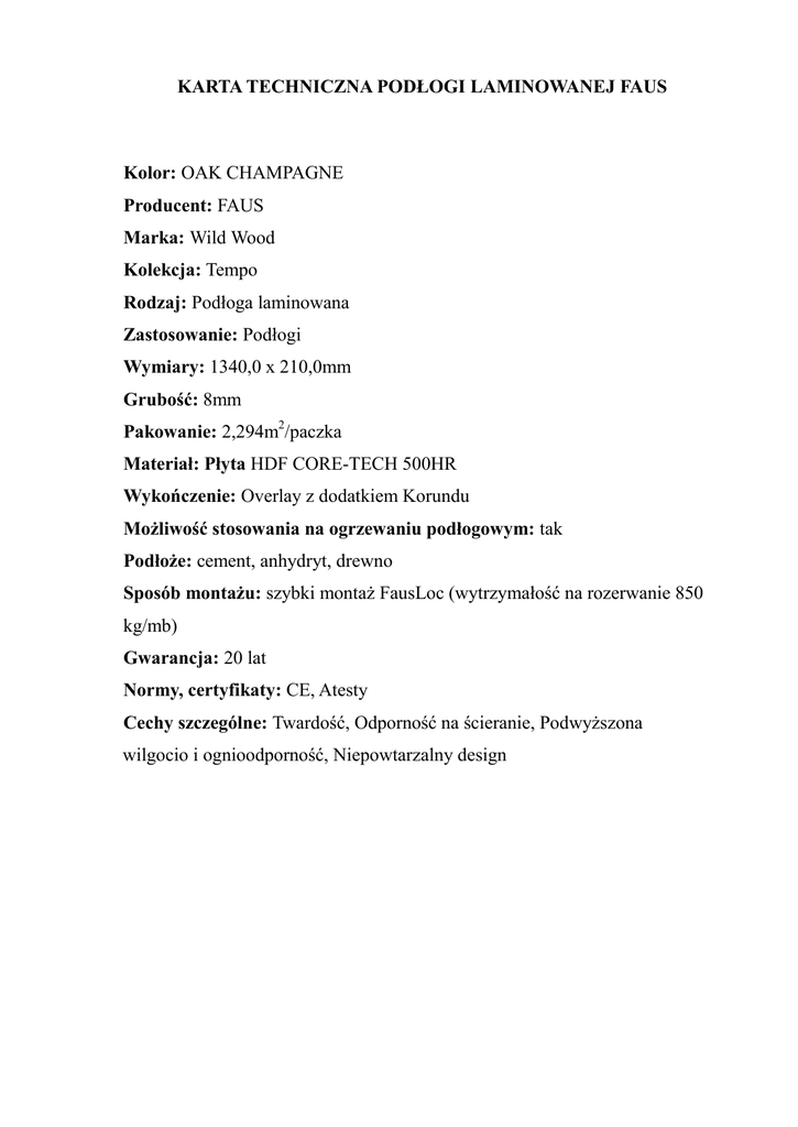 KARTA TECHNICZNA PODŁOGI LAMINOWANEJ FAUS Kolor: OAK CHAMPAGNE Producent: FAUS Marka: Wild Wood Kolekcja: Tempo Rodzaj: Podłoga laminowana Zastosowanie: Podłogi Wymiary: 1340,0 x 210,0mm Grubość: 8mm Pakowanie: 2,294m2/paczka Materiał: Płyta HDF CORE-TECH 500HR Wykończenie: Overlay z dodatkiem Korundu Możliwość stosowania na ogrzewaniu podłogowym: tak Podłoże: cement, anhydryt, drewno Sposób montażu: szybki montaż FausLoc (wytrzymałość na rozerwanie 850 kg/mb) Gwarancja: 20 lat Normy, certyfikaty: CE, Atesty Cechy szczególne: Twardość, Odporność na ścieranie, Podwyższona wilgocio i ognioodporność, Niepowtarzalny design