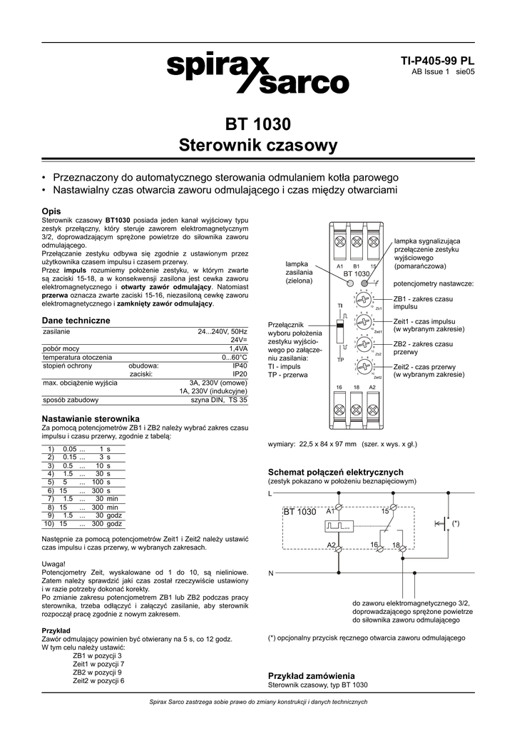 TI-P405-99 PL AB Issue 1 sie05 BT 1030 Sterownik czasowy • Przeznaczony do automatycznego sterowania odmulaniem kotła parowego • Nastawialny czas otwarcia zaworu odmulającego i czas między otwarciami Opis Sterownik czasowy BT1030 posiada jeden kanał wyjściowy typu zestyk przełączny, który steruje zaworem elektromagnetycznym 3/2, doprowadzającym sprężone powietrze do siłownika zaworu odmulającego. Przełączanie zestyku odbywa się zgodnie z ustawionym przez użytkownika czasem impulsu i czasem przerwy. Przez impuls rozumiemy położenie zestyku, w którym zwarte są zaciski 15-18, a w konsekwensji zasilona jest cewka zaworu elektromagnetycznego i otwarty zawór odmulający. Natomiast przerwa oznacza zwarte zaciski 15-16, niezasiloną cewkę zaworu elektromagnetycznego i zamknięty zawór odmulający. Dane techniczne zasilanie pobór mocy temperatura otoczenia stopień ochrony max. obciążenie wyjścia obudowa: zaciski: sposób zabudowy 24...240V, 50Hz 24V= 1,4VA 0...60°C IP40 IP20 3A, 230V (omowe) 1A, 230V (indukcyjne) szyna DIN, TS 35 lampka sygnalizująca przełączenie zestyku wyjściowego (pomarańczowa) lampka zasilania (zielona) potencjometry nastawcze: ZB1 - zakres czasu impulsu Zeit1 - czas impulsu (w wybranym zakresie) Przełącznik wyboru położenia zestyku wyjściowego po załączeniu zasilania: TI - impuls TP - przerwa ZB2 - zakres czasu przerwy Zeit2 - czas przerwy (w wybranym zakresie) Nastawianie sterownika Za pomocą potencjometrów ZB1 i ZB2 należy wybrać zakres czasu impulsu i czasu przerwy, zgodnie z tabelą: 1) 0.05 2) 0.15 3) 0.5 4) 1.5 5) 5 6) 15 7) 1.5 8) 15 9) 1.5 10) 15 ... ... ... ... ... ... ... ... ... ... 1 3 10 30 100 300 30 300 30 300 s s s s s s min min godz godz wymiary: 22,5 x 84 x 97 mm (szer. x wys. x gł.) Schemat połączeń elektrycznych (zestyk pokazano w położeniu beznapięciowym) (*) Następnie za pomocą potencjometrów Zeit1 i Zeit2 należy ustawić czas impulsu i czas przerwy, w wybranych zakresach. Uwaga! Potencjometry Zeit, wyskalowane od 1 do 10, są nieliniowe. Zatem należy sprawdzić jaki czas został rzeczywiście ustawiony i w razie potrzeby dokonać korekty. Po zmianie zakresu potencjometrem ZB1 lub ZB2 podczas pracy sterownika, trzeba odłączyć i załączyć zasilanie, aby sterownik rozpoczął pracę zgodnie z nowym zakresem. Przykład Zawór odmulający powinien być otwierany na 5 s, co 12 godz. W tym celu należy ustawić: ZB1 w pozycji 3 Zeit1 w pozycji 7 ZB2 w pozycji 9 Zeit2 w pozycji 6 do zaworu elektromagnetycznego 3/2, doprowadzającego sprężone powietrze do siłownika zaworu odmulającego (*) opcjonalny przycisk ręcznego otwarcia zaworu odmulającego Przykład zamówienia Sterownik czasowy, typ BT 1030 Spirax Sarco zastrzega sobie prawo do zmiany konstrukcji i danych technicznych
