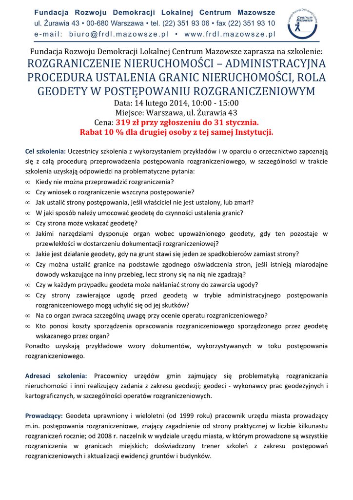 Fundacja Rozwoju Demokracji Lokalnej Centrum Mazowsze zaprasza na szkolenie: ROZGRANICZENIE NIERUCHOMOŚCI – ADMINISTRACYJNA PROCEDURA USTALENIA GRANIC NIERUCHOMOŚCI, ROLA GEODETY W POSTĘPOWANIU ROZGRANICZENIOWYM Data: 14 lutego 2014, 10:00 - 15:00 Miejsce: Warszawa, ul. Żurawia 43 Cena: 319 zł przy zgłoszeniu do 31 stycznia. Rabat 10 % dla drugiej osoby z tej samej Instytucji. Cel szkolenia: Uczestnicy szkolenia z wykorzystaniem przykładów i w oparciu o orzecznictwo zapoznają się z całą procedurą przeprowadzenia postępowania rozgraniczeniowego, w szczególności w trakcie szkolenia uzyskają odpowiedzi na problematyczne pytania: • Kiedy nie można przeprowadzić rozgraniczenia? • Czy wniosek o rozgraniczenie wszczyna postępowanie? • Jak ustalić strony postępowania, jeśli właściciel nie jest ustalony, lub zmarł? • W jaki sposób należy umocować geodetę do czynności ustalenia granic? • Czy strona może wskazać geodetę? • Jakimi narzędziami dysponuje organ wobec upoważnionego geodety, gdy ten pozostaje w przewlekłości w dostarczeniu dokumentacji rozgraniczeniowej? • Jakie jest działanie geodety, gdy na grunt stawi się jeden ze spadkobierców zamiast strony? • Czy można ustalić granice na podstawie zgodnego oświadczenia stron, jeśli istnieją miarodajne dowody wskazujące na inny przebieg, lecz strony się na nią nie zgadzają? • Czy w każdym przypadku geodeta może nakłaniać strony do zawarcia ugody? • Czy strony zawierające ugodę przed geodetą w trybie administracyjnego postępowania rozgraniczeniowego mogą uchylić się od jej skutków? • Na co organ zwraca szczególną uwagę przy ocenie operatu rozgraniczeniowego? • Kto ponosi koszty sporządzenia opracowania rozgraniczeniowego sporządzonego przez geodetę wskazanego przez organ? Ponadto uzyskają przykładowe wzory dokumentów, wykorzystywanych w toku postępowania rozgraniczeniowego. Adresaci szkolenia: Pracownicy urzędów gmin zajmujący się problematyką rozgraniczania nieruchomości i inni realizujący zadania z zakresu geodezji; geodeci - wykonawcy prac geodezyjnych i kartograficznych, w szczególności operatów rozgraniczeniowych. Prowadzący: Geodeta uprawniony i wieloletni (od 1999 roku) pracownik urzędu miasta prowadzący m.in. postępowania rozgraniczeniowe, znający zagadnienie od strony praktycznej w liczbie kilkunastu rozgraniczeń rocznie; od 2008 r. naczelnik w wydziale urzędu miasta, w którym prowadzone są wszystkie rozgraniczenia w granicach miejskich; doświadczony trener szkoleń z zakresu postępowań rozgraniczeniowych i aktualizacji ewidencji gruntów i budynków. Program szkolenia: 1. Wprowadzenie i zagadnienia ogólne 2. Rozpoczęcie procedury rozgraniczenia nieruchomości: • Nietypowy wnioskodawca rozgraniczenia: współwłaściciel, władający lub współwładający, posiadacz samoistny, • Ustalenie przedmiotu żądania, • Wszczęcie postępowania rozgraniczeniowego, • Terminy załatwiania spraw o rozgraniczenie. 3. Rola geodety w postępowaniu rozgraniczeniowym: • Wyznaczenie i upoważnienie geodety przez organ, • Kontrola terminowości działań geodety, • Dokumentacja. 4. Kontrola operatu rozgraniczeniowego powstałego w wyniku czynności geodety przeprowadzana przez organ pod względem formalno-prawnym: • Badanie dokumentów – analiza metryczna, • Wezwanie stron na grunt, • Wyniki poszukiwania znaków i śladów granicznych, • Protokół graniczny. 5. Ustalenie granic – kryteria warunkujące rodzaj wydawanej decyzji w postępowaniu rozgraniczeniowym: • Pkt. 11.1 protokołu granicznego – wznowienie znaków granicznych, • Pkt. 11.2 protokołu granicznego – ustalenie granic na podstawie dokumentów, • Pkt. 11.3 i 4 protokołu granicznego – ustalenie granic na podstawie oświadczenia stron, • Pkt. 11.5 protokołu granicznego – nie rozstrzygnięty spór graniczny, • Pkt. 11.6 protokołu granicznego – ugoda sądowa, • Utrwalenie znaków granicznych w oparciu o osnowę geodezyjną, • Poprawki w protokole, • Zakończenie postępowania przed organem administracyjnym. 6. Rozliczenie kosztów postępowania rozgraniczeniowego ZGŁOSZENIE ROZGRANICZENIE NIERUCHOMOŚCI – ADMINISTRACYJNA PROCEDURA USTALENIA GRANIC NIERUCHOMOŚCI, ROLA GEODETY W POSTĘPOWANIU ROZGRANICZENIOWYM. Data: 14 lutego 2014 , 10:00 - 15:00 Miejsce: Warszawa, ul. Żurawia 43 Cena: 319 zł przy zgłoszeniu do 31 stycznia. Rabat 10 % dla drugiej osoby z tej samej Instytucji. Instytucja: ........................................................................................................................... Adres: ................................................................................................................................. NIP: ..................................................................................................................................... L.p. Imię i nazwisko Wydział tel. e-mail 1.......................................................................................................................................... 2.......................................................................................................................................... 3.......................................................................................................................................... ........................................................... podpis i pieczątka osoby delegującej Zgłoszenie na szkolenie Zgłoszenia prosimy przesyłać do 7 lutego 2014 r. fax: (22) 351 93 10, e-mail: [email protected] lub wybrać opcje zapisu przez stronę www.frdl.mazowsze.pl Przy zgłoszeniu w ramach Forów prosimy o wpisanie w uwagach: „Zgłoszenie w ramach Forum (nazwa odpowiedniego Forum)”. Ewentualną rezygnację ze szkolenia można zgłosić najpóźniej na dwa dni przed szkoleniem. W przypadku niewykorzystania zgłoszonego uczestnictwa - Urząd będzie zobowiązany do sfina