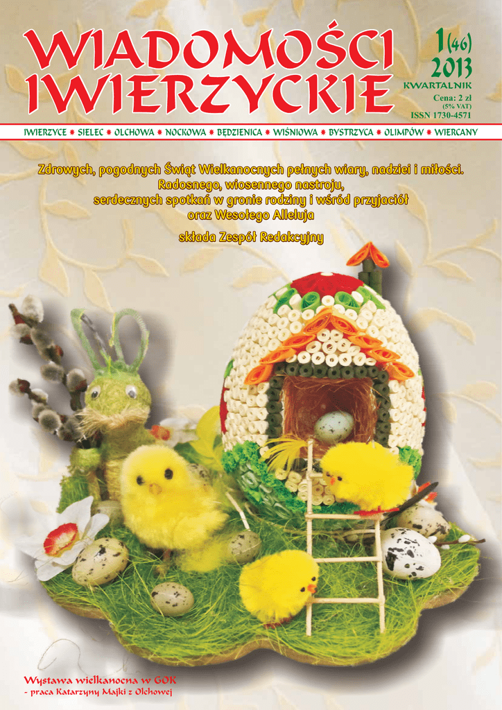 WIADOMOŚCI IWIERZYCKIE 1(46) 2013 KWARTALNIK Cena: 2 zł (5% VAT) ISSN 1730-4571 IWIERZYCE SIELEC OLCHOWA NOCKOWA BĘDZIENICA WIŚNIOWA BYSTRZYCA OLIMPÓW WIERCANY Zdrowych, pogodnych Świąt Wielkanocnych pełnych wiary, nadziei i miłości. Radosnego, wiosennego nastroju, serdecznych spotkań w gronie rodziny i wśród przyjaciół oraz Wesołego Alleluja składa Zespół Redakcyjny Wystawa wielkanocna w GOK - praca Katarzyny Majki z Olchowej Wojewódzki Zjazd Rady Kół Gospodyń Wiejskch w Gminie Iwierzyce Drodzy Czytelnicy, Mieszkañcy Gminy Iwierzyce Mimo wielu przeciwnoœci rok 2012 uda³o siê nam zamkn¹æ bardzo dobrym wynikiem w zakresie przeprowadzonych inwestycji. Bud¿et zosta³ zrealizowany zgodnie z jego zapisami. Nockowa, Wiercany, Wiœniowa, Bêdzienica wzbogaci³y siê o odnowione odcinki dróg gminnych, Iwierzyce zyska³y now¹ siedzibê przedszkola, a w Bystrzycy zlikwidowaliœmy osuwisko. Gminny Oœrodek Kultury w Wiercanach zyska³ now¹ zewnêtrzn¹ kryt¹ pod³ogê i dwa parkingi, a w Olimpowie wyremontowana zosta³a stara kuŸnia, staj¹c siê niemym œwiadkiem historii tej miejscowoœci. Po zakoñczeniu drugiego etapu modernizacji wodoci¹gu mieszkañcy wszystkich wsi zyskali lepsz¹ jakoœæ wody, podawan¹ we w³aœciwych normach technicznych. Gmina systematycznie sp³aca te¿ wczeœniej zaci¹gniête kredyty, aby w przysz³oœci móc siê finansowo przygotowaæ do realizacji budowy kanalizacji w kolejnych wsiach. W Olchowej praktycznie zakoñczono ju¿ uzgadnianie przebiegu kanalizacji, natomiast w Nockowej jeden z mieszkañców maj¹c w³asn¹ wizjê przebiegu kanalizacji nie zgodzi³ siê na jej przebieg po swojej dzia³ce i na chwilê obecn¹ skutecznie zablokowa³ kilkunastu s¹siadom przy³¹cz kanalizacyjny. Odcinek ten zostanie ponownie przeprojektowany. Nawarstwiaj¹ce siê jednak od d³u¿szego okresu nierozwi¹zane problemy, jak te¿ nowe wyzwania, które postawi³o przed nami ¿ycie oraz ustawodawca, zmieniaj¹c raz po raz przepisy prawne spowodowa³, ¿e z obaw¹ ale i nadziej¹ spogl¹daliœmy na 2013 Rok. Chcia³oby siê powiedzieæ, ¿e ka¿dy z nas interesuj¹cy siê chocia¿ trochê nasz¹ Ma³¹ Ojczyzn¹ próbowa³ zadaæ sobie pytanie, czy w Nowym 2013 Roku potrafimy sami siê rz¹dziæ i pokonywaæ trudnoœci?, czy podejmiemy takie decyzje, które doprowadz¹ do racjonalizacji sieci szkó³ na terenie Gminy Iwierzyce i pozwol¹ zaoszczêdziæ pieni¹dze, niezbêdne do realizacji inwestycji poprawiaj¹cych jakoœæ i standard ¿ycia mieszkañców? Dotychczasowa stagnacja w myœleniu i dzia³aniu pog³êbia³a jedynie niekorzystne tendencje, których kumulacja wymusi³a w koñcu konieczne zmiany. Na sesji w dniu 14. 01.2013 roku Rada Gminy podjê³a uchwa³ê o likwidacji od 1 wrzeœnia 2013roku trzech szkó³ podstawowych szeœcioklasowych w Bêdzienicy, Sielcu i Wiœniowej, co przyniesie dla bud¿etu gminy oszczêdnoœci rzêdu ok. 700 tys. z³ rocznie. W przypadku dostatecznej iloœci dzieci zostan¹ w tych miejscowoœciach utworzone filialne szko³y podstawowe trzyklasowe. Towarzysz¹ca tym racjonalnym dzia³aniom prawie dwuletnia kampania oszczerstw, skierowana pod moim adresem, czêœci radnych oraz kilkunastu rodzinom z terenu gminy znalaz³a swój epilog, gdy¿ sprawcy i twórcy tego bezzasadnego ataku zostali ustaleni przez organy œcigania. WIADOMOŒCI IWIERZYCKIE nr 1 (46) W tym miejscu dziêkujê wszystkim radnym, którzy nie ugiêli siê pod presj¹ œrodowiska zachowawczego i w poczuciu odpowiedzialnoœci za losy gminy zag³osowali za przyjêciem uchwa³ pozwalaj¹cych na przeprowadzenie dzia³añ racjonalizacyjnych w oœwiacie. Konsekwencj¹ przyjêtych dzia³añ oszczêdnoœciowych by³a pozytywna opinia do projektu bud¿etu wydana przez Regionaln¹ Izbê Obrachunkow¹ w Rzeszowie i jego uchwalenie w dniu 29.01.2013 roku przez Radê Gminy w Iwierzycach. Przyjêty bud¿et na 2013 rok jest obecnie realizowany. Mimo skromnych œrodków, jak co roku na wiosnê rozpoczniemy naprawy dróg gminnych o powierzchni bitumicznej, bêdziemy kopaæ rowy przydro¿ne i rowy melioracyjne, a w ramach funduszu so³eckiego wywieziemy kamieñ na drogi. Wspólnie z Rad¹ Gminy planujemy te¿ w tym roku odbudowê mostu w Nockowej przysió³ek B³onie oraz wykonanie ³¹cznika drogi pomiêdzy Olimpowem, a Bystrzyc¹, tak zwanego Madziarskiego Szlaku, który znacznie skróci dojazd nie tylko mieszkañcom gminy, ale te¿ drogê autobusu szkolnego. Stosowne zapisy ustaw o ochronie œrodowiska zmuszaj¹ nas jako jednostkê samorz¹du terytorialnego posiadaj¹c¹ kanalizacje i oczyszczalnie œcieków do nowoczesnego zagospodarowania odpadów poœciekowych, co wi¹¿e siê z zakupem nowej linii technologicznej do utylizacji tego odpadu. Konieczne do tego procesu urz¹dzenie zostanie zakupione w tym roku za blisko 400 tys. z³, które zostanie zamontowane w oczyszczalni œcieków w Iwierzycach. Brak tej inwestycji spowodowa³by w przysz³oœci wzrost odp³atnoœci za œcieki. Równie¿ inne dzia³ania, które podejmuje Urz¹d Gminy, nie s¹ widoczne, ale poœrednio oddzia³ywaj¹ na ¿ycie mieszkañców. Mam tu na myœli formalno-prawn¹ regulacjê wielu spraw, które wczeœniej nie by³y za³atwione. W ubieg³ym roku zosta³ uregulowany stan prawny kilkudziesiêciu dzia³ek s¹siaduj¹cych z drogami gminnymi, jak te¿ dzia³ek pod przepompownie œcieków i wody. Równie¿ w tym roku jako urz¹d planujemy w ramach posiadanych œrodków przeprowadziæ kolejn¹ formaln¹ regulacjê kilkudziesiêciu dzia³ek stykaj¹cych siê z drogami gminnymi. Jak wa¿na jest to kwestia wiedz¹ tylko Ci, których ta sprawa dotyczy. Aby uatrakcyjniæ Gminê pod wzglêdem inwestycyjnym 3 zostanie opracowana zmiana studium uwarunkowañ i kierunków zagospodarowania przestrzennego, a nastêpnie opracowany miejscowy plan zagospodarowania przestrzennego terenu Olchowa-Lipie, gdzie znajduje siê jedyny w Gminie teren pod budownictwo przemys³owe. Od 1 wrzeœnia 2013 roku wchodz