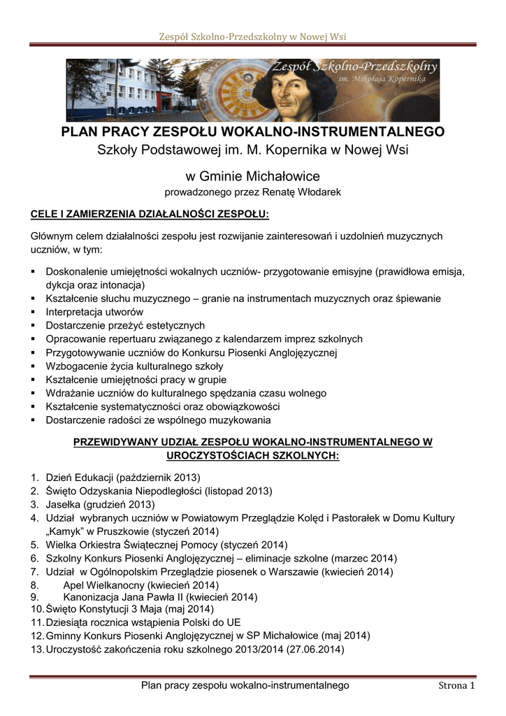 Zespół Szkolno-Przedszkolny w Nowej Wsi PLAN PRACY ZESPOŁU WOKALNO-INSTRUMENTALNEGO Szkoły Podstawowej im. M. Kopernika w Nowej Wsi w Gminie Michałowice prowadzonego przez Renatę Włodarek CELE I ZAMIERZENIA DZIAŁALNOŚCI ZESPOŁU: Głównym celem działalności zespołu jest rozwijanie zainteresowań i uzdolnień muzycznych uczniów, w tym: Doskonalenie umiejętności wokalnych uczniów- przygotowanie emisyjne (prawidłowa emisja, dykcja oraz intonacja) Kształcenie słuchu muzycznego – granie na instrumentach muzycznych oraz śpiewanie Interpretacja utworów Dostarczenie przeŜyć estetycznych Opracowanie repertuaru związanego z kalendarzem imprez szkolnych Przygotowywanie uczniów do Konkursu Piosenki Anglojęzycznej Wzbogacenie Ŝycia kulturalnego szkoły Kształcenie umiejętności pracy w grupie WdraŜanie uczniów do kulturalnego spędzania czasu wolnego Kształcenie systematyczności oraz obowiązkowości Dostarczenie radości ze wspólnego muzykowania PRZEWIDYWANY UDZIAŁ ZESPOŁU WOKALNO-INSTRUMENTALNEGO W UROCZYSTOŚCIACH SZKOLNYCH: 1. 2. 3. 4. Dzień Edukacji (październik 2013) Święto Odzyskania Niepodległości (listopad 2013) Jasełka (grudzień 2013) Udział wybranych uczniów w Powiatowym Przeglądzie Kolęd i Pastorałek w Domu Kultury „Kamyk” w Pruszkowie (styczeń 2014) 5. Wielka Orkiestra Świątecznej Pomocy (styczeń 2014) 6. Szkolny Konkurs Piosenki Anglojęzycznej – eliminacje szkolne (marzec 2014) 7. Udział w Ogólnopolskim Przeglądzie piosenek o Warszawie (kwiecień 2014) 8. Apel Wielkanocny (kwiecień 2014) 9. Kanonizacja Jana Pawła II (kwiecień 2014) 10. Święto Konstytucji 3 Maja (maj 2014) 11. Dziesiąta rocznica wstąpienia Polski do UE 12. Gminny Konkurs Piosenki Anglojęzycznej w SP Michałowice (maj 2014) 13. Uroczystość zakończenia roku szkolnego 2013/2014 (27.06.2014) Plan pracy zespołu wokalno-instrumentalnego Strona 1 HARMONOGRAM PRACY W OPARCIU O KALENDARZ IMPREZ SZKOLNYCH: WRZESIEŃ − ZałoŜenie zespołu wokalno-instrumentalnego z uczniów z klas czwartych, piątych oraz szóstych − Ćwiczenia emisyjno- artykulacyjne (poznanie zasad higieny głosu) − Nauka hymnu szkolnego oraz ćwiczenie hymnu państwowego − Nauka piosenek na uroczystość otwarcia nowej części szkoły PAŹDZIERNIK − − − − − Ćwiczenia rozszerzające skale głosu oraz wyrównanie barwy Utrwalanie piosenek na uroczystość otwarcia nowej części szkoły Występ z okazji ślubowania klas I oraz otwarcia nowej części szkoły Dobór piosenek na szkolny Konkurs Piosenki Anglojęzycznej Opracowanie repertuaru na uroczystość z okazji Święta Niepodległości LISTOPAD − − − − − − − Kształtowanie umiejętności wokalnych Poznawanie instrumentów szkolnych perkusyjnych Nauka pieśni i piosenek przeznaczonych na uroczystość Dnia Odzyskania Niepodległości Ćwiczenie grania i śpiewania piosenek na szkolny Konkurs Piosenki Anglojęzycznej Występ z okazji Święta Niepodległości Dobór repertuaru na Jasełka oraz na koncert WOŚP Ćwiczenie grania i śpiewania kolęd GRUDZIEŃ − − − − Nauka kolęd, pastorałek oraz piosenek związanych z tematyką Świąt BoŜego Narodzenia Ćwiczenie grania i śpiewania piosenek na szkolny Konkurs Piosenki Anglojęzycznej Nauka gry na szkolnych instrumentach perkusyjnych Występ podczas Wigilii szkolnej - Jasełka STYCZEŃ − − − − − − Ćwiczenia emisyjne Poznawanie instrumentów szkolnych perkusyjnych cd. Przygotowanie oraz występ na Przeglądzie Kolęd i Pastorałek Ćwiczenie grania i śpiewania piosenek na szkolny Konkurs Piosenki Anglojęzycznej Nauka piosenek mających na celu poszerzenie repertuaru zespołu Udział w koncercie WOŚP LUTY − − − − Ćwiczenia rytmiczne Nauka gry na szkolnych instrumentach perkusyjnych cd. Wybór oraz ćwiczenie piosenek o warszawie Słuchanie utworów w celu poszerzenia literatury muzycznej Plan pracy zespołu wokalno-instrumentalnego Strona 2 − Poznawanie utworów przygotowywanych na koncert Świąteczny – Wielkanocny − Udział w szkolnym Konkursie Piosenki Anglojęzycznej MARZEC − − − − − − − Ćwiczenia oddechowe Utrwalanie utworów na koncert Świąteczny – Wielkanocny Nauka piosenek o tematyce religijnej na Uroczystość Kanonizacji Jana Pawła II Utrwalanie piosenek o Warszawie Dobór repertuaru na Święto Ziemi oraz Święto Uchwalenia Konstytucji 3 Maja Śpiewnie kanonów melodycznych i wykonywanie kanonów rytmicznych Występ z okazji Świąt - Wielkanoc KWIECIEŃ − − − − − − Ćwiczenia wokalne Udział w Ogólnopolskim Przeglądzie Piosenki o Warszawie Ćwiczenie piosenek na Kanonizację Jana Pawła II Nauka piosenek związanych z Konstytucją 3 Maja Występ z okazji Rocznicy Uchwalenia Konstytucji 3 Maja Występ z okazji Święta Ziemi MAJ − Ćwiczenia oddechowe, rytmiczne oraz dykcyjne − Udział laureatów Szkolnego Konkursu Piosenki Anglojęzycznej w Gminnym Konkursie Piosenki Anglojęzycznej w SP Michałowice − Uroczystość z okazji dziesiątej rocznica wstąpienia Polski do UE − Dobór i ćwiczenia piosenek na uroczyste zakończenie roku szkolnego 2013/2014 CZERWIEC − − − − − Zajęcia emisyjne, ćwiczenia dykcji i intonacji Nauka utworów przeznaczonych na uroczyste zakończenie roku szkolnego Doskonalenie repertuaru Występ na uroczystym zakończeniu roku szkolnego 2013/2014 Podsumowanie pracy członków zespołu w roku szkolnego 2013/2014 Zespół wokalno-instrumentalny spotyka się raz w tygodniu na jedną godzinę lekcyjną. Zajęcia odbywają się systematycznie. Próby organizowane są w trojaki sposób: próba z poszczególnymi głosami/instrumentami, próba z całym zespołem oraz próba generalna przed występem. PRZEWIDYWANE OSIĄGNIĘCIA: − Aktywne uczestnictwo w Ŝyciu kulturalnym szkoły − Kształcenie głosu i umiejętność posługiwania się nim − Kształcenie umiejętności grania na instrumentach muzycznych Plan pracy zespołu woka