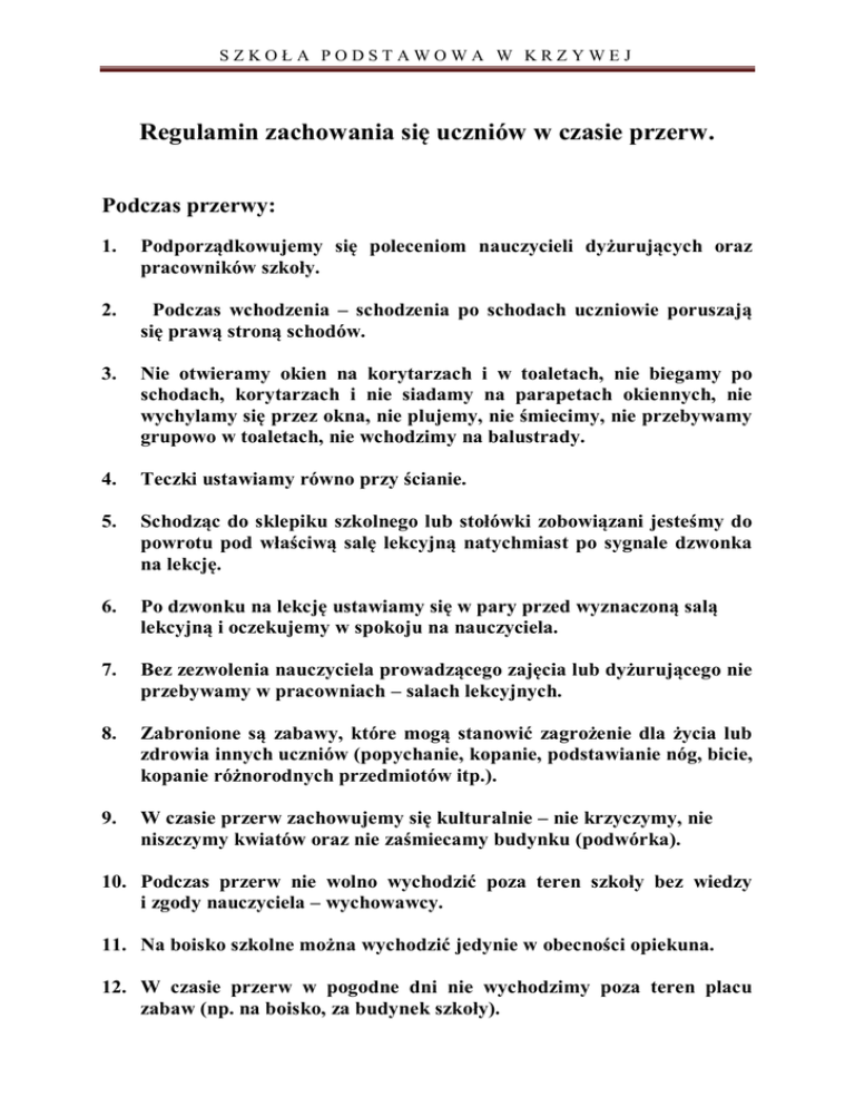 SZKOŁA PODSTAWOWA W KRZYWEJ Regulamin zachowania się uczniów w czasie przerw. Podczas przerwy: 1. Podporządkowujemy się poleceniom nauczycieli dyżurujących oraz pracowników szkoły. 2. Podczas wchodzenia – schodzenia po schodach uczniowie poruszają się prawą stroną schodów. 3. Nie otwieramy okien na korytarzach i w toaletach, nie biegamy po schodach, korytarzach i nie siadamy na parapetach okiennych, nie wychylamy się przez okna, nie plujemy, nie śmiecimy, nie przebywamy grupowo w toaletach, nie wchodzimy na balustrady. 4. Teczki ustawiamy równo przy ścianie. 5. Schodząc do sklepiku szkolnego lub stołówki zobowiązani jesteśmy do powrotu pod właściwą salę lekcyjną natychmiast po sygnale dzwonka na lekcję. 6. Po dzwonku na lekcję ustawiamy się w pary przed wyznaczoną salą lekcyjną i oczekujemy w spokoju na nauczyciela. 7. Bez zezwolenia nauczyciela prowadzącego zajęcia lub dyżurującego nie przebywamy w pracowniach – salach lekcyjnych. 8. Zabronione są zabawy, które mogą stanowić zagrożenie dla życia lub zdrowia innych uczniów (popychanie, kopanie, podstawianie nóg, bicie, kopanie różnorodnych przedmiotów itp.). 9. W czasie przerw zachowujemy się kulturalnie – nie krzyczymy, nie niszczymy kwiatów oraz nie zaśmiecamy budynku (podwórka). 10. Podczas przerw nie wolno wychodzić poza teren szkoły bez wiedzy i zgody nauczyciela – wychowawcy. 11. Na boisko szkolne można wychodzić jedynie w obecności opiekuna. 12. W czasie przerw w pogodne dni nie wychodzimy poza teren placu zabaw (np. na boisko, za budynek szkoły). SZKOŁA PODSTAWOWA W KRZYWEJ 13. Podczas przerw obiadowych do jadalni przechodzą tylko ci, którzy korzystają ze stołówki szkolnej na danej przerwie lekcyjnej. Kulturalnie ustawiają się w kolejce w oczekiwaniu na posiłek. 14. W toaletach nie wolno: jeść posiłków, palić papierosów, niszczyć armatury łazienkowej, chlapać wodą, wylewać mydła, uzupełniać zeszytów, przebywać w toaletach płci przeciwnej załatwiać żadnych spraw poza kwestiami higieny i potrzeb fizjologicznych. W CZASIE PRZERWY UCZEŃ MA PRAWO : ● ● ● ● ● ● odpocząć zjeść drugie śniadanie lub obiad na stołówce szkolnej skorzystać z toalety porozmawiać z kolegami dokonać zakupów w sklepiku szkolnym zwrócić się o pomoc do dyżurującego nauczyciela w trudnej sprawie\ W CZASIE PRZERW UCZEŃ NIE MOŻE: ● biegać po korytarzu ● krzyczeć, hałasować ● zaśmiecać terenu szkoły ● niszczyć mienia szkoły (pociągnięcie do odpowiedzialności finansowej rodziców, opiekunów) ● grać na korytarzu w: piłkę, gumę, berka itp. ● zaczepić kolegów, używać wobec nich przemocy (szarpanie, popychanie, kopanie, podstawianie nóg i inne o charakterze agresywnym) ● wykonywać elementów gimnastycznych np. stanie na rękach, przerzut bokiem, salta itp. ● jeździć na rowerach, hulajnogach itp. ● dokonywać zakupów w sklepiku szkolnym bez kolejki ● siedzieć na schodach, parapetach ● łamać zasad wychodzenia na podwórko ● wychodzić poza teren szkoły ● lekceważyć poleceń nauczyciela oraz innych pracowników szkoły