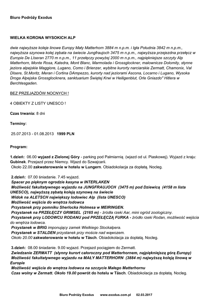 Biuro Podróży Exodus WIELKA KORONA WYSOKICH ALP dwie najwyższe koleje linowe Europy Mały Matterhorn 3884 m n.p.m. i Igła Południa 3842 m n.p.m., najwyższa szynowa kolej zębata na świecie Jungfraujoch 3475 m n.p.m., najwyższa przejezdna przełęcz w Europie De LIseran 2770 m n.p.m., 11 przełęczy powyżej 2000 m n.p.m., najpiękniejsze szczyty Alp Matterhorn, Monte Rosa, Katedra, Mont Blanc, Marmolada i Grossglockner, malownicze Dolomity, słynne jeziora alpejskie Maggiore, Lugano, Como i Brienzer, wybitne kurorty narciarskie Zermatt, Chamonix, Val DIsere, St.Moritz, Meran i Cortina DAmpezzo, kurorty nad jeziorami Ascona, Locarno i Lugano, Wysoka Droga Alpejska Grossglocknera, sanktuarium Świętej Krwi w Heiligenblut, Orle Gniazdo" Hitlera w Berchtesgaden. BEZ PRZEJAZDÓW NOCNYCH ! 4 OBIEKTY Z LISTY UNESCO ! Czas trwania: 8 dni Terminy: 25.07.2013 - 01.08.2013 1999 PLN Program: 1.dzień: 06.00 wyjazd z Zielonej Góry - parking pod Palmiarnią (wjazd od ul. Piaskowej). Wyjazd z kraju: Gubinek. Przejazd przez Niemcy. Wjazd do Szwajcarii. Około 22.00 zakwaterowanie w hotelu w Lungern. Obiadokolacja za dopłatą. Nocleg. 2.dzień: 07.00 śniadanie. 7.45 wyjazd. Spacer po pięknym ogrodzie kasyna w INTERLAKEN Możliwość fakultatywnego wyjazdu na JUNGFRAUJOCH (3475 m) pod Dziewicą (4158 m lista UNESCO), najwyższą zębatą koleją szynową na świecie Widok na ALETSCH największy lodowiec Alp (lista UNESCO) Możliwość wejścia do wnętrza lodowca Przystanek przy pomniku Sherlocka Holmesa w MEIRINGEN. Przystanek na PRZEŁĘCZY GRIMSEL (2165 m) - źródła rzeki Aar, mini ogród zoologiczny. Przystanek przy LODOWCU RODANU pod PRZEŁĘCZĄ FURKA - źródło rzeki Rodan, możliwość wejścia do wnętrza lodowca. Przystanek w BRIG imponujący zamek Wielkiego Stockalpera. Przystanek w STALDEN przystanek przy moście nad wąwozem. Około 20.00 zakwaterowanie w hotelu w Täsch. Obiadokolacja za dopłatą. Nocleg. 3.dzień: 08.00 śniadanie. 9.00 wyjazd. Przejazd pociągiem do Zermatt. Zwiedzanie ZERMATT (słynny kurort całoroczny pod Matterhornem, najpiękniejszą górą Europy) Możliwość fakultatywnego wyjazdu na MAŁY MATTERHORN (3884 m) najwyższą koleją linową w Europie Możliwość wejścia do wnętrza lodowca na szczycie Małego Matterhornu Czas wolny w Zermatt. Około 19.00 powrót do hotelu w Täsch. Obiadokolacja za dopłatą. Nocleg. Biuro Podróży Exodus www.exodus.com.pl 02.03.2017 4.dzień: 07.00 śniadanie. 7.45 wyjazd. Zwiedzanie SION (dawna stolica księstwa biskupiego) stare miasto. Przejazd przez PRZEŁĘCZ FORKLAZ (1527m) Wjazd do Francji. Spacer po CHAMONIX (kurort narciarski pod MONT BLANC) Możliwość fakultatywnego wyjazdu na IGŁĘ POŁUDNIA (3842 m) w masywie MONT BLANC Około 21.00 zakwaterowanie w hotelu w rejonie Albertville. Nocleg. 5.dzień: 07.00 śniadanie. 07.45 wyjazd. Przystanek na PRZEŁĘCZY DE LISERAN (2770 m !!! najwyższa przejezdna przełęcz w Europie !) Przystanek w VAL DISERE (słynna narciarska stacja klimatyczna) Przystanek na PRZEŁĘCZY MAŁY ST-BERNARD (2146 m) Wjazd do Włoch. Przystanek na PRZEŁĘCZ WIELKI ST-BERNARD (2469 m) Wjazd do Szwajcarii. Przystanek na PRZEŁĘCZY SIMPLON (2005 m) Przejazd górską wojskową DROGĄ NAPOLEONA Wjazd do Włoch. Około 21.00 zakwaterowanie w hotelu w rejonie Verbanii nad jeziora Maggiore. Nocleg. 6.dzień: 07.00 śniadanie. 07.45 wyjazd. Przejazd wybrzeżem JEZIORA MAGGIORE Wjazd do Szwajcarii. Spacer po ASCONIE (luksusowy kurort nad jeziorem Maggiore) Spacer po LOCARNO (luksusowy kurort nad jeziorem Maggiore) Spacer po LUGANO (luksusowy kurort nad jeziorem Lugano) Przejazd wybrzeżem JEZIORA LUGANO Wjazd do Włoch. Przejazd wybrzeżem JEZIORA COMO Wjazd do Szwajcarii. Spacer po ST.MORITZ (luksusowy kurort narciarski) Przystanek na PRZEŁĘCZY BERNINA (2328 m) widok na kolej retycką (lista UNESCO) Wjazd do Włoch. Przystanek na PRZEŁĘCZY DI STELVIO (2757 m !!!) Zwiedzanie MERANU ogród botaniczny przy zamku Trauttmansdorff, Kamienny Most. Około 21.00 zakwaterowanie w hotelu w rejonie Bolzano. Nocleg. 7.dzień: 07.00 śniadanie. 07.45 wyjazd. Przejazd przez DOLOMITY (lista UNESCO) Przystanek na PRZEŁĘCZY DI SELLA (2244 m) Przystanek na PRZEŁĘCZY PORDOI (2239 m) Spacer po CORTINA DAMPEZZO (Królowa włoskich Dolomitów, słynny kurort narciarski miejsce Olimpiady Zimowej 1956 roku) Przejazd WYSOKĄ DROGĄ ALPEJSKĄ GROSSGLOCKNERA Przystanek przy Sanktuarium Świętej Krwi w HEILIGENBLUT kościół pielgrzymkowy Św.Wincentego z fiolką krwi Chrystusa. Przystanek na wybitnym punkcie widokowym BALKON FRANCISZKA JÓZEFA widok na wielki lodowiec i na najwyższy szczyt Austrii i wschodnich Alp GROSSGLOCKNER (3798 m) - spotkanie z oswojonymi świstakami. Przystanek na PRZEŁĘCZY HOHTOR (2575 m) Około 21.00 zakwaterowanie w hotelu w rejonie Salzburga. Nocleg. Biuro Podróży Exodus www.exodus.com.pl 02.03.2017 8.dzień: 07.00 śniadanie. 07.45 wyjazd. Przystanek w BERCHTESGADEN miejsce po Berghof, Alpejskiej Rezydencji Adolfa Hitlera, bunkier Hitlera. Możliwość fakultatywnego wyjazdu mikrobusem i windą na ORLE GNIAZDO (Kehlstein 1835 m) Przejazd przez Austrię i Czechy. Wjazd do kraju: Zawidów. Około 23.00 rozwiązanie imprezy w Zielonej Górze parking pod Palmiarnią. W cenie: autokar: wysokopokładowy, klimatyzacja, WC, video, napoje zimne i gorące (płatne) około 3600 km. noclegi: 6 x hotele**/***, pokoje 2,3-osob. z łaz/WC + 1 x hotel Formule 1 pokoje 2-osobowe, łaz/WC na korytarzu. wyżywienie: 7 śniadań. pilot BP EXODUS ubezpieczenie NW, KL, bagaż. podatek VAT Dodatkowe opłaty: 4 obiadokolacji (na życzenie) 80 CHF (płatne za granicą). bilet do kolejki linowej na Mały Matterhorn około 70 CHF. bilet do kolejki szynowej na Jungfraujoch (50% zniżki) - około 90 CHF. bilet do kolejki linowej na Igłę Południa - około wejściówki do obiektów turystycznych około. Uwaga: przy długich przejazdach autokar zatrzymuje się na 15-minutowe postoje każdorazowo po ok