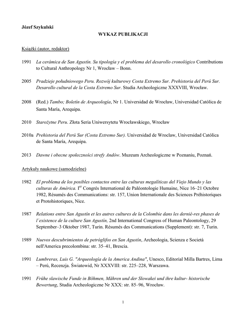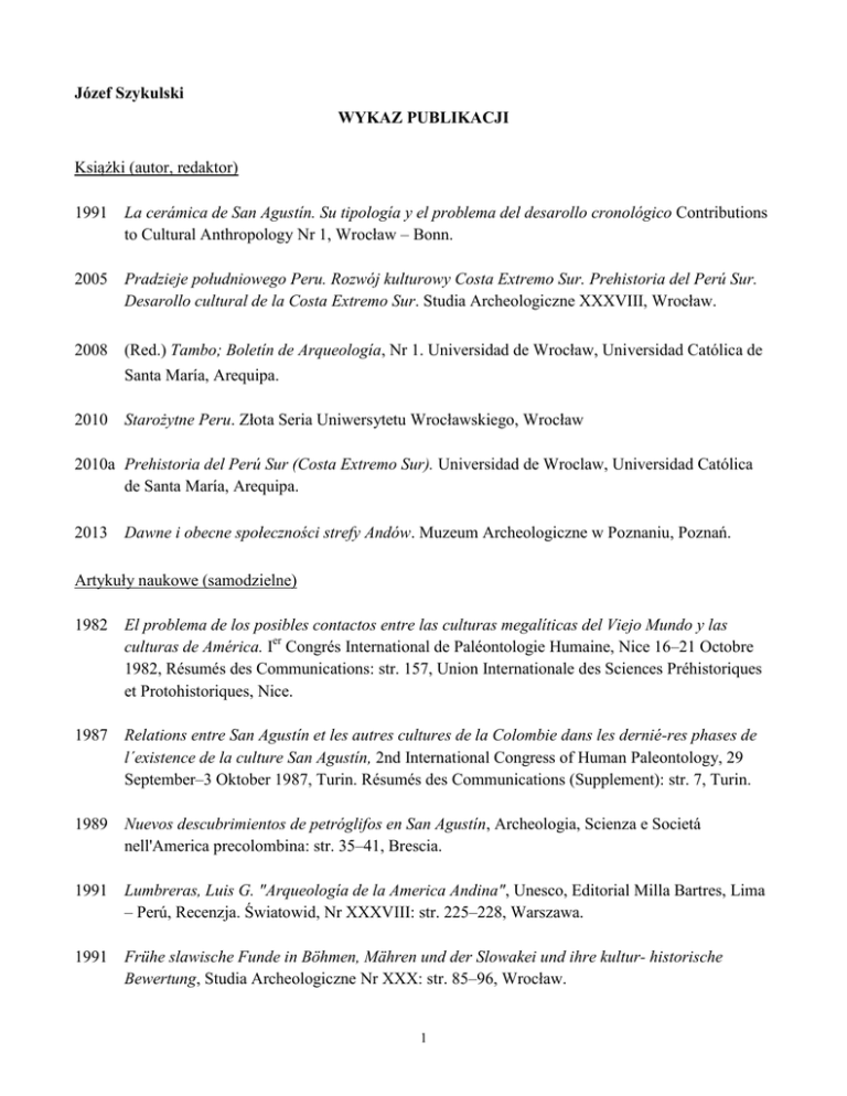 Józef Szykulski WYKAZ PUBLIKACJI Książki (autor, redaktor) 1991 La cerámica de San Agustín. Su tipología y el problema del desarollo cronológico Contributions to Cultural Anthropology Nr 1, Wrocław – Bonn. 2005 Pradzieje południowego Peru. Rozwój kulturowy Costa Extremo Sur. Prehistoria del Perú Sur. Desarollo cultural de la Costa Extremo Sur. Studia Archeologiczne XXXVIII, Wrocław. 2008 (Red.) Tambo; Boletín de Arqueología, Nr 1. Universidad de Wrocław, Universidad Católica de Santa María, Arequipa. 2010 Starożytne Peru. Złota Seria Uniwersytetu Wrocławskiego, Wrocław 2010a Prehistoria del Perú Sur (Costa Extremo Sur). Universidad de Wroclaw, Universidad Católica de Santa María, Arequipa. 2013 Dawne i obecne społeczności strefy Andów. Muzeum Archeologiczne w Poznaniu, Poznań. Artykuły naukowe (samodzielne) 1982 El problema de los posibles contactos entre las culturas megalíticas del Viejo Mundo y las culturas de América. Ier Congrés International de Paléontologie Humaine, Nice 16–21 Octobre 1982, Résumés des Communications: str. 157, Union Internationale des Sciences Préhistoriques et Protohistoriques, Nice. 1987 Relations entre San Agustín et les autres cultures de la Colombie dans les dernié-res phases de l´existence de la culture San Agustín, 2nd International Congress of Human Paleontology, 29 September–3 Oktober 1987, Turin. Résumés des Communications (Supplement): str. 7, Turin. 1989 Nuevos descubrimientos de petróglifos en San Agustín, Archeologia, Scienza e Societá nell'America precolombina: str. 35–41, Brescia. 1991 Lumbreras, Luis G. "Arqueología de la America Andina", Unesco, Editorial Milla Bartres, Lima – Perú, Recenzja. Światowid, Nr XXXVIII: str. 225–228, Warszawa. 1991 Frühe slawische Funde in Böhmen, Mähren und der Slowakei und ihre kultur- historische Bewertung, Studia Archeologiczne Nr XXX: str. 85–96, Wrocław. 1 1994 Centrum ceremonialne w La Venta jego rola i znaczenie, Światowid, Nr XXXVII: str. 53–65, Warszawa. 1994 Los trabajos arqueológicos en el Sector 2 del Fuerte, Samaipata,Dep. Santa Cruz de la SierraBolivia. Documentos de Trabajo, 15–4, Memorias del VI Congreso del FIELAC 22–26 de Junio de 1993 Varsovia: str. 54–75, Varsovia/Warszawa. 1995 Das Problem der chronologischen Entwicklung in der San Agustín Region, Przegląd Archeologiczny, Nr 43: str. 127–153, Wrocław. 1996 El sitio arqueológico Churajón y el problema de su cronología, Andes, Boletin de la Misión Arqueológica Andina, Nr 1: str. 201–220, Warszawa. 1996 Die kulturgeschichtliche Entwicklung im Departamento Arequipa in der Späten Zwischenperiode. Projektbericht, Kennwort: Proyecto Churajón (DFG Förderung), str. 1–48, Bonn. 1997 Evidencias de materiales Pre-Tiwanaku en la zona Churajón, Perú (Formativo sur-peruano?), 49 Congresso Internacional de Americanistas, Libro de resumenes, Pontificia Universidad Católica del Ecuador: str. 334, Quito. 1998 Churajón, nuevos datos sobre el Período de Transición en el Sur de Peru, Bonner Amerikanistische Studien (BAS), Nr 30: str. 291–320, Bonn. 1998a Investigaciones arqueológicas en Churajón, Dep. Arequipa – Perú. Informe preliminar de los trabajos de 1996/97: str. 1–52, Universidad Católica de Santa María, Arequipa–Bonn. 1998b Okres Przejściowy (Período de Transición) na obszarze południowego Peru w świetle badań archeologicznych w Churajón, Dep. Arequipa, Przegląd Archeologiczny, Nr 46: 89–100, Wrocław. 1999 Komunikat na temat badań archeologicznych realizowanych w latach 1994-1998 na terenie kompleksu archeologicznego Churajón, południowe Peru. Nauka Wrocławska; Biuletyn Informacyjny Oddziału Polskiej Akademii Nauk (PAN), Nr 9–10: str. 8–11, Wrocław. 2000 Investigaciones arqueológicas en Churajón, Departamento de Arequipa, Perú. Informe de los trabajos de 1998/1999. Universidad Católica de “Santa María”, Arequipa. 2000a Die Kultanlagen von Churajón (Südperu) und ihre kulturhistorische Bewertung, Rola Sacrum w kształtowaniu się relacji człowiek – środowisko. Spotkania Bytom- skie IV, Instytut Archeologii i Etnologii PAN, Oddział Wrocławski, str. 257–282, Wrocław. 2 2001 Wieże grobowe (chullpas) z obszaru kompleksu osadniczego w Churajón – Peru, oraz zagadnienie ich periodyzacji - Chullpas de Churajón (Departamento de Arequipa - Perú) y su periodización. Przegląd Archeologiczny, Nr 49: str. 137–146, Wrocław. 2001a Zagadnienie Kultury Mollo. Wyniki rozpoznania archeologicznego w pobliżu miejscwości Chumá, Departament La Paz, Boliwia – La problemática de la Cul-tura Mollo; Recorrido arqueológico en la Región de Chumá, Departamento de La Paz, Bolivia. Śląskie Sprawozdania Archeologiczne, Nr XLIII: str. 619–625, Wrocław. 2002 Przemiany obrządku pogrzebowego na obszarze południowego Peru w kontekście badań archeologicznych. Popiół i Kość. Funeraria Lednickie 4: str. 305–319, Sobótka – Wrocław. 2005a Ausgrabungen in Pretzsch, Burgenlandkreis. Archäologie in Sachsen-Anhalt, Band 3: 112–129. Landesamt für Denkmalpflege und Archäologie Sachsen-Anhalt, Landesmuseum für Vorgeschichte, Halle. 2008 Arqueología de Churajón, sur del Perú, Tambo Boletín de Arqueologia, Nr. 1: 179–205, Arequipa. 2008a Badania archeologiczne w obrębie Domkietz Sraβe, na Starym Mieście w Brandenburgu. Śląskie Spraw. Archeologiczne, T. L: 293–302, Wrocław. 2011 Arqueología Tiwanaku. Tiwanaku y el Año Nuevo Andino. IV Congreso Internacional, Universidad Alas Peruanas – Filial Arequipa: str. 115–127, Arequipa. 2013 The Andes Region: National identity and the problem of cultural patterns. Current Issues on Fine arts – Technology – Desing Training and Some Ways of Their Solution: str. 14–18, Улаанбаатар (Ułan Bator). 2013a Proyecto Tambo. Sociedades prehispánicas del Extremo Sur Peruano. Investigaciones de la Universidad de Wroclaw/Polonia en el Perú. Avances recient