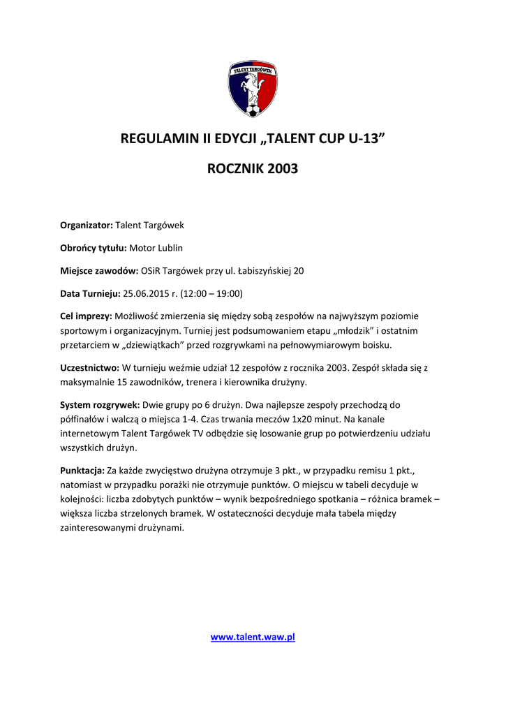 REGULAMIN II EDYCJI „TALENT CUP U-13” ROCZNIK 2003 Organizator: Talent Targówek Obrońcy tytułu: Motor Lublin Miejsce zawodów: OSiR Targówek przy ul. Łabiszyńskiej 20 Data Turnieju: 25.06.2015 r. (12:00 – 19:00) Cel imprezy: Możliwość zmierzenia się między sobą zespołów na najwyższym poziomie sportowym i organizacyjnym. Turniej jest podsumowaniem etapu „młodzik” i ostatnim przetarciem w „dziewiątkach” przed rozgrywkami na pełnowymiarowym boisku. Uczestnictwo: W turnieju weźmie udział 12 zespołów z rocznika 2003. Zespół składa się z maksymalnie 15 zawodników, trenera i kierownika drużyny. System rozgrywek: Dwie grupy po 6 drużyn. Dwa najlepsze zespoły przechodzą do półfinałów i walczą o miejsca 1-4. Czas trwania meczów 1x20 minut. Na kanale internetowym Talent Targówek TV odbędzie się losowanie grup po potwierdzeniu udziału wszystkich drużyn. Punktacja: Za każde zwycięstwo drużyna otrzymuje 3 pkt., w przypadku remisu 1 pkt., natomiast w przypadku porażki nie otrzymuje punktów. O miejscu w tabeli decyduje w kolejności: liczba zdobytych punktów – wynik bezpośredniego spotkania – różnica bramek – większa liczba strzelonych bramek. W ostateczności decyduje mała tabela między zainteresowanymi drużynami. www.talent.waw.pl NAGRODY: Dyplomy: otrzymuje każdy zespół, biorący udział w „Talent Cup” 2015/2016. Puchary: otrzymują wszystkie drużyny biorące udział w turnieju. Za I miejsce drużyna zdobywa duży puchar przechodni, który w przyszłym roku przywozi młodszy rocznik, otrzymują jednocześnie możliwość bezpłatnego udziału. Zespół, który zdał puchar zostanie wygrawerowany przed następną edycją „Talent Cup U-13” Medale: Za I miejsce zawodnicy otrzymują złote medale, za II miejsce srebrne, za miejsce III brązowe. Upominki: otrzymują wszyscy zawodnicy, biorący udział w „Talent Cup” 2015/2016 Król strzelców Turnieju: zostaje zawodnik, który strzelił w całym turnieju najwięcej bramek. W przypadku takiej samej liczby goli wygrywa ten, który zajął wyższe miejsce w końcowej klasyfikacji drużyny. Najlepszy bramkarz Turnieju: zostaje zawodnik wyróżniony przez organizatorów. Najlepszy zawodnik Turnieju: zostaje zawodnik wyróżniony przez organizatorów. Ponadto planowane są nagrody rzeczowe dla najlepszych zespołów, wszystkich trenerów a także wyróżnienia dla najlepszych zawodników każdej z drużyn. www.talent.waw.pl ZASADY GRY: Boisko: pełnowymiarowe boisko do piłki nożnej z nową sztuczną nawierzchnią / bramki do piłki nożnej 2x5 metrów. Liczba zawodników: 8+bramkarz Zmiany zawodników: system hokejowy przy środkowej strefie boiska. Piłka: zawody rozgrywane są piłką numer 4. Rzut karny: wykonywany z odległości 9 metrów. Stałe fragmenty gry: zawodnicy drużyny broniącej muszą znajdować się w odległości 7 metrów od piłki. Strój: drużyny zobowiązane są ubrać się w jednolity strój i obuwie sportowe. Kary: za rażące przewinienia zawodnik może być usunięty z boiska na karę 2-5 minut lub zdyskwalifikowany z Turnieju. Wszystkich zawodników obowiązuje posiadanie legitymacji szkolnych oraz aktualnych badań lekarskich. Pozostałe przepisy zgodne z wymogami ustalonymi przez PZPN i MZPN. SPRAWY ORGANIZACYJNE: - decyzje w sprawach spornych, nieujętych w regulaminie podejmuje organizator, - organizator nie ubezpiecza zawodników i nie ponosi odpowiedzialności za szkody lub wypadki losowe poniesione przez uczestników Turnieju, - organizator nie bierze odpowiedzialności za rzeczy pozostawione w szatni, - organizator zapewnia napoje chłodzące dla zawodników poszczególnych drużyn, - organizator zapewnia opiekę medyczną podczas trwania Turnieju, - organizator zapewnia relację z Turnieju na stronie internetowej www.talent.waw.pl, youtube.com: TT-TV oraz Facebook’u. - dopuszcza się możliwość zmiany w regulaminie przed rozpoczęciem Turnieju. www.talent.waw.pl INFORMACJE DODATKOWE: Stefa zawodników: W celu utrzymania porządku organizacyjnego w szatniach mogą znajdować się TYLKO zawodnicy, trenerzy i kierownicy drużyn – każdy sztab szkoleniowy otrzyma od organizatora identyfikatory. Osoby, które ich nie posiadają nie będą mogły poruszać się w strefie zawodników. Rodziców zapraszamy na trybuny! Strefa rodziców: Podczas całego Turnieju dostępny będzie bufet z jedzeniem i piciem. Ostrzeżenie: Rodzice, spożywający alkohol będą natychmiastowo wydalani z obiektu sportowego. Spiker: będzie informował o najbliższych meczach, strzelcach bramek oraz rezultatach zakończonych spotkań. Grupy i drużyny: pełny harmonogram Turnieju zostanie wysłany na e-mail każdej zgłoszonej drużyny na minimum miesiąc przed rozpoczęciem zawodów. Ponadto wszystkie informacje dotyczące „Talent Cup” dostępne będą na stronie internetowej oraz Facebooku. W przypadku pytań zapraszamy: Kontakt telefoniczny: 517-017-532 Bogumił Bonisławski Kontakt e-mail: [email protected] Strona internetowa: www.talent.waw.pl Facebook: www.facebook.com/TalentTargowek Wpisowe: 300 zł (płatne do 31.03.2016 r.) na konto Talent Targówek: Bank Pekao S.A. 29 1240 1082 1111 0010 5701 9078 www.talent.waw.pl Wszelkie prawa zastrzeżone ©