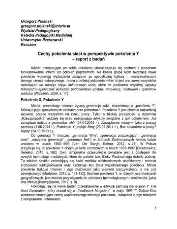 Grzegorz Polański [email protected] Wydział Pedagogiczny Katedra Pedagogiki Medialnej Uniwersytet Rzeszowski Rzeszów Cechy pokolenia sieci w perspektywie pokolenia Y – raport z badań Każde, następujące po sobie pokolenie charakteryzuje się cechami i sposobem funkcjonowania innymi od pokoleń poprzednich. Na każdą grupę ludzi tworzącą nowe pokolenie wpływają wydarzenia związane ze specyficzną kulturą i uwarunkowaniami danego okresu historycznego. Jedna z definicji pokolenia mówi, iż jest ono sumą wszystkich należących do danego kręgu kulturowego osób, które na podstawie wspólnej sytuacji historyczno-społecznej wykazują podobieństwo postaw, motywacji, nastawień i systemów wartości [Wrzesień, 2009, s. 17]. Pokolenie X, Pokolenie Y Media, prezentując obecnie żyjącą generację ludzi, wspominają o „pokoleniu Y”. Mówią o jego specyficznych cechach oraz potrzebach. Pokolenie Y jest obecnie najbardziej aktywne, przede wszystkim na rynku pracy. Tylko w bliskiej przeszłości w dzienniku „Rzeczpospolita” ukazały się m.in. następujące artykuły związane z tym pokoleniem: Jak zarządzać ludźmi z generation whY (27.04.2014 r.), Zarządzenie młodymi tylko z pozycji partnera (1.06.2014 r.), Pokolenie Y podbija firmy (23.02.2014 r.), Bez smartfona w pracy? Nigdy! (24.10.2013 r.). Do generacji Y (inaczej: „generacja Why”, „generacja poszukująca”, „generacja sieci”, „następna generacja”, „generacja Net”) w Stanach Zjednoczonych należą ludzie urodzeni w latach 1980-1996 [Ven Der Bergh, Behrer, 2012, s. 21]. W Polsce przyjmuje się, iż pokolenie Y obejmuje ludzi urodzonych w latach 1983-1997 [Oleszkowicz, Senejko, 2013, s. 192]. Owo temporalne przesunięcie związane jest z dostępem do nowych technologii medialnych, które do państw tzw. Bloku Wschodniego dotarło później. To właśnie szybko zmieniający się świat mediów elektronicznych współtworzy i zmienia środowisko funkcjonowania oraz kształtuje styl życia współczesnego pokolenia. Młode pokolenie traktuje Internet i jego możliwości jako element rzeczywistości, a nie coś zewnętrznego [Morbitzer, 2012, s. 131-132]. Sednem pokolenia Y, w różnych szerokościach geograficznych, jest właśnie przywiązanie do zdobyczy technologicznych i możliwości, jakie one oferują [Niewęgłowski, 2012, s. 9]. Powołując się na wyniki badań przedstawione w artykule Defining Generation Y. The Next Generation, który ukazał się w „Youthwork Magazine”, w maju 1997, T. Goban-Klas wymienia następujące cechy współczesnego młodego pokolenia, związane z jego relacjami z komputerem i Internetem: 1 To pokolenie, któremu puls bije szybko. Bombardowani obrazami mają stałą, niesłabnącą potrzebę odbierania nowych wrażeń. Zdalna kontrola, np. pilota od telewizora i innych urządzeń, najlepiej symbolizuje ich rzeczywistość: zmiana jest stała, a koncentracja uwagi kaprysem. Nic ich nie szokuje, są zmęczeni stale napływającym strumieniem informacji, lecz nie potrafią bez niego żyć. Wychowani na przekazie telewizyjnym w znacznym stopniu się wobec niej uodpornili, a zwłaszcza na jego siłę perswazyjną. Nic nie robi na nich większego wrażenia. Mają nieograniczony dostęp do środków masowej informacji i zasobów informacji, są lepiej poinformowani niż ich poprzednicy. Są bardziej świadomi problemów świata. Nie ufają dorosłym, a w dziedzinach multimedialnych ich wiedza przekracza wiedzę nauczycieli. Jest to pokolenie prefiguratywne (Margaret Mead). Następuje odwrócenie ról: dzieci są nauczycielami rodziców; syn uczy ojca jak obsługiwać komputer, magnetowid, telefon komórkowy, pomaga mu buszować w Internecie [Goban-Klas, 2002, s. 46]. Osoby, które urodziły się w latach 1965-1979, według autorów amerykańskich to „pokolenie X” (inaczej „generacja obojętna”, „pokolenie widmo”). Nazwa „pokolenie X” została spopularyzowana dzięki książce Douglasa Couplanda Pokolenie X. Opowieści na czas przyspieszonej kultury, która opisuje losy pokolenia, które nie chciało być określane żadną etykietą – „Nazywajcie nas po prostu X”. Litera X stała się synonimem całej generacji oraz stworzyła nazwę następnego pokolenia Y. Głównymi cechami „pokolenia widmo” mają być indywidualizm i pesymizm, które są odpowiedzią na chaos współczesności [van den Bergh, Behrer, 2012, s. 22]. W niniejszym tekście nazwa „pokolenie Y” jest tożsama z nazwą „pokolenie sieci”, którą posługuje się Don Tapscott. Cechy pokolenia Y według Dona Tapscotta Don Tapscott w książce Cyfrowa dorosłość. Jak pokolenie sieci zmienia nasz świat dokonał charakterystyki generacji Y. Autor wymieniona jej cechy, postawy i charakterystyczne zachowania, a ponadto nazywa je normami. Należą do nich: wolność, dopasowanie do swoich potrzeb, baczna obserwacja, wiarygodność, współpraca, rozrywka, szybkie tempo, innowacyjność. Na tych właściwościach opiera się charakterystyka pokolenia Y, szczególnie w odniesieniu do jego nawyków medialnych [Tapscott, 2010, s. 138-175]. Oto krótki opis wymienionych cech pokolenia sieci. 1. Wolność – młode pokolenie spodziewa się możliwości wyboru w każdej dziedzinie życia. Dzięki wszechobecnej sieci może uzyskać odpowiedź na każde postawione pytanie w dowolnym momencie. Zastanawiając się nad zakupem danego produktu, młody człowiek otrzymuje niezliczoną ilość opinii na jego temat od internautów. Aż 83% badanych odpowiada, że wiedzą dokładnie, co chcą kupić, zanim wybiorą się na zakupy. Wymagają również możliwości zwrotu lub wymiany produktu w razie podjęcia złego wyboru. Różnorodność, która dla pokolenia X jest uciążliwa, przez pokolenie Y jest uwielbiana. Pokolenie Y spodziewa się możliwości wyboru, gdzie i kiedy będzie pracować; wykorzystuje nowe media, aby uwolnić się od tradycyjnej przestrzeni biurowej 2 i regulamin