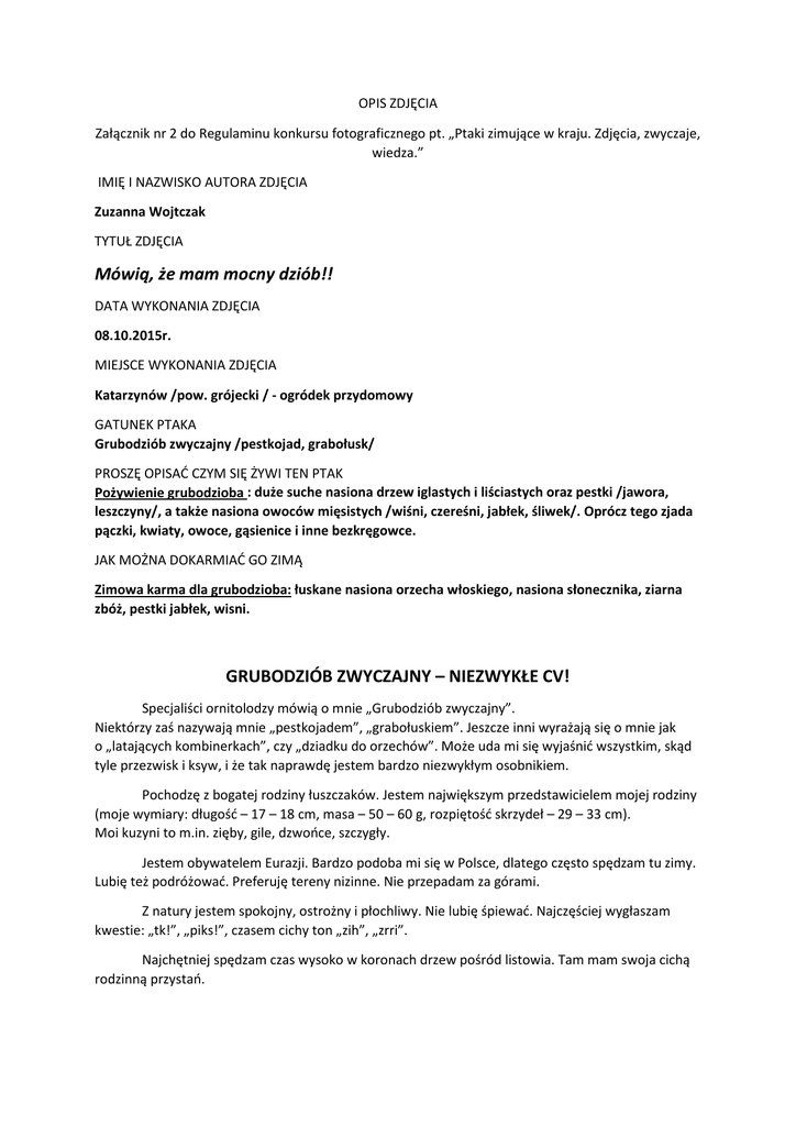 OPIS ZDJĘCIA Załącznik nr 2 do Regulaminu konkursu fotograficznego pt. „Ptaki zimujące w kraju. Zdjęcia, zwyczaje, wiedza.” IMIĘ I NAZWISKO AUTORA ZDJĘCIA Zuzanna Wojtczak TYTUŁ ZDJĘCIA Mówią, że mam mocny dziób!! DATA WYKONANIA ZDJĘCIA 08.10.2015r. MIEJSCE WYKONANIA ZDJĘCIA Katarzynów /pow. grójecki / - ogródek przydomowy GATUNEK PTAKA Grubodziób zwyczajny /pestkojad, grabołusk/ PROSZĘ OPISAĆ CZYM SIĘ ŻYWI TEN PTAK Pożywienie grubodzioba : duże suche nasiona drzew iglastych i liściastych oraz pestki /jawora, leszczyny/, a także nasiona owoców mięsistych /wiśni, czereśni, jabłek, śliwek/. Oprócz tego zjada pączki, kwiaty, owoce, gąsienice i inne bezkręgowce. JAK MOŻNA DOKARMIAĆ GO ZIMĄ Zimowa karma dla grubodzioba: łuskane nasiona orzecha włoskiego, nasiona słonecznika, ziarna zbóż, pestki jabłek, wisni. GRUBODZIÓB ZWYCZAJNY – NIEZWYKŁE CV! Specjaliści ornitolodzy mówią o mnie „Grubodziób zwyczajny”. Niektórzy zaś nazywają mnie „pestkojadem”, „grabołuskiem”. Jeszcze inni wyrażają się o mnie jak o „latających kombinerkach”, czy „dziadku do orzechów”. Może uda mi się wyjaśnić wszystkim, skąd tyle przezwisk i ksyw, i że tak naprawdę jestem bardzo niezwykłym osobnikiem. Pochodzę z bogatej rodziny łuszczaków. Jestem największym przedstawicielem mojej rodziny (moje wymiary: długość – 17 – 18 cm, masa – 50 – 60 g, rozpiętość skrzydeł – 29 – 33 cm). Moi kuzyni to m.in. zięby, gile, dzwońce, szczygły. Jestem obywatelem Eurazji. Bardzo podoba mi się w Polsce, dlatego często spędzam tu zimy. Lubię też podróżować. Preferuję tereny nizinne. Nie przepadam za górami. Z natury jestem spokojny, ostrożny i płochliwy. Nie lubię śpiewać. Najczęściej wygłaszam kwestie: „tk!”, „piks!”, czasem cichy ton „zih”, „zrri”. Najchętniej spędzam czas wysoko w koronach drzew pośród listowia. Tam mam swoja cichą rodzinną przystań. Skoro o rodzinie mowa, to jestem monogamistą. Taką mam dewizę życiową! Potrafię zabiegać o względy mojej partnerki – stroszę piórka, składam jej hołd poprzez ukłony, nie zapominam też o karmieniu godowym. Dbam też o swój wygląd. Generalnie uważam, że jestem dość barwny i elegancki, choć trudno nazwać mnie przystojniakiem! Mam dość krępą sylwetkę z dużą i masywną głową oraz krótkim ogonem. Szaty me są beżowobrązowe z czarnym przodem twarzy, szarym karkiem i brązowym grzbietem. Na skrzydłach mam białobeżowe pasy, a koniec mojego ogona jest biały. Pierś i boki ciała lśnią pomarańczowo. I najważniejsze – moja największa duma, mój znak szczególny: NIEZWYKLE SILNY DZIÓB!!! Nie dość, że jego barwa zmienia się w zależności od pory roku, to jeszcze ta ogromna siła i spryt w nim tkwiące! Bynajmniej nie używam go tylko do ozdoby! Wykorzystuję go niemal codziennie do zdobywania pokarmu, czyli rozłupywania nasion. I to takich twardych nasion, że moim znajomym nawet do głowy by nie przyszło się do tego zabierać! A ja? No cóż? Pięć sekund i gotowe! Tyle czasu potrzebuję na rozłupanie pestki. To mój życiowy rekord! Moje szczęki wytwarzają wtedy nacisk rzędu 50 kilogramów! Mógłbym przez nieuwagę (Twoją!) zranić Ci palec. Ale spokojnie – jak już wcześniej wspomniałem - wykorzystuję swój zgryz głównie w celach pokojowych – do zaspokojenia podstawowych potrzeb życiowych, czyli wypełnienia ptasiego żołądka! Ściskam i rozłupuję tym imadłem pestki wiśni, czereśni, zgniatam pestki słonecznika, łuskam nasiona buka, grabu. Wszystko to dla mnie pestka! Otóż i dlatego, moim skromnym zdaniem,JESTEM GRUBODZIOBEM NIEZWYKŁYM! Polecam swoją sylwetkę specjalnej ochronie! Źródła: 1. Dariusz Graszka – Petrykowski. „Ptaki” . KDC. Warszawa 2005 2. Gottfried Amann. „Ptaki”. Oficyna Wydawnicza Multico. Warszawa 1995 3. Pl.wikipedia.org