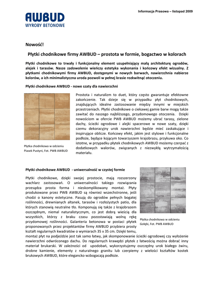 Informacja Prasowa – listopad 2009 Nowość! Płytki chodnikowe firmy AWBUD – prostota w formie, bogactwo w kolorach Płytki chodnikowe to trwały i funkcjonalny element uzupełniający małą architekturę ogrodów, alejek i tarasów. Nasze zadowolenie wieńczy estetyka wykonania i końcowy efekt wizualny. Z płytkami chodnikowymi firmy AWBUD, dostępnymi w nowych barwach, nawierzchnia nabierze kolorów, a ich minimalistyczna uroda pozwoli w pełnej krasie rozkwitnąć otoczeniu. Płytki chodnikowe AWBUD - nowe szaty dla nawierzchni Płytka chodnikowa w odcieniu Piasek Pustyni, Fot. PWB AWBUD Prostota i naturalizm to duet, który często gwarantuje efektowne zakończenie. Tak dzieje się w przypadku płyt chodnikowych, znajdujących idealne zastosowanie między innymi w miejskich przestrzeniach. Płytki chodnikowe o ciekawej gamie barw mogą także zawitać do naszego najbliższego, przydomowego otoczenia. Dzięki nowościom w ofercie PWB AWBUD możemy ubrać tarasy, zielone dachy, ścieżki ogrodowe i alejki spacerowe w nowe szaty, dzięki czemu dekoracyjny urok nawierzchni będzie mieć zaskakujące i inspirujące oblicze. Końcowy efekt, jakim jest stylowe i funkcjonalne podłoże, będące kojącym towarzyszem krajobrazu, przykuwa oko. Co istotne, w przypadku płytek chodnikowych AWBUD możemy czerpać z dodatkowych walorów, związanych z niezwykłą wytrzymałością materiału. Płytki chodnikowe AWBUD - uniwersalność w czystej formie Płytki chodnikowe, dzięki swojej prostocie, mają rozszerzony wachlarz zastosowań. O uniwersalności takiego rozwiązania przesądza prosta forma i nieskomplikowany montaż. Płyty produkowane przez PWB AWBUD są również wszechstronne, jeśli chodzi o kanony estetyczne. Pasują do ogrodów pełnych bogatej roślinności, drewnianych altanek, tarasów i rozłożystych patio, dla których stanowią neutralne tło. Komponują się także z krajobrazem oszczędnym, niemal naturalistycznym, co jest dobrą wieścią dla wszystkich, którzy z braku czasu pozostawiają wolną rękę Płytka chodnikowa w odcieniu przydomowej roślinności. Galanteria betonowa w postaci płytek Gołębi, Fot. PWB AWBUD proponowanych przez projektantów firmy AWBUD przybiera prosty kształt regularnych kwadratów o wymiarach 35 x 35 cm. Dzięki temu, montaż płyt na podjeździe jest tak samo łatwy, jak skomponowanie ścieżki ogrodowej czy wyłożenie nawierzchni odwróconego dachu. Do regularnych krawędzi płytek z łatwością można dobrać inny materiał brukarski. W zależności od upodobań, wykorzystujemy oszczędny urok białego żwiru, drobne kamienie, elementy z naturalnego granitu lub czerpiemy z wielości kształtów kostek brukowych AWBUD, które elegancko wzbogacają podłoże. Informacja Prasowa – listopad 2009 Płytki chodnikowe AWBUD w nowych barwach - kolorystyczne wariacje pod stopami Firma PWB AWBUD zadbała, aby płytki chodnikowe były naprawdę inspirującym elementem otoczenia. Minimalistyczna przestrzeń nabierze życia pod dotknięciem palety barw i faktur, które oferuje producent. Do gamy podstawowych kolorów: szary, czerwony, karmelowy, brązowy, czarny, dołączono linię melanży – Safari, Piasek Pustyni, Kasztan, Gołębi, które świetlistymi tonacjami oddają urok czterech pór roku. Płyty w kolorze Safari błyszczą rdzawym blaskiem spalonego słońcem lądu. Melanżowa nawierzchnia w barwie Kasztanu wprowadzi nas w świat jesiennej różnorodności przyrody. Z kolei uroda płyt chodnikowych w kolorze Gołębim i Piasku Pustyni zachwyca szarym odcieniem przywołującym chłodną grację zimy lub Płytka chodnikowa w odcieniu ciepło pierwszych wiosennych promieni słońca. Każda z płyt Safari, Fot. PWB AWBUD chodnikowych typu melanż stanowi więc indywidualną ucztę kolorystyczną, w której nieregularność barw dodaje subtelności klasycznej formie kwadratu. W ofercie płytek chodnikowych firmy AWBUD możemy zatem wybierać spośród barw jaskrawych, zgaszonych, a nawet przenikających się, aby doskonale dopasować ich żywiołowość do bujności przestrzeni. Moc szlachetności Jedną z największych zalet płyt chodnikowych jest ich niezwykle funkcjonalna natura. Nienasiąkliwe, mrozoodporne i antypoślizgowe, są doskonałym podłożem dla tarasów. Dodatkowo, ze względu na wytrzymałość na ścieranie i obciążenia, warto wyłożyć nimi przestrzeń sąsiadującą z garażem. Wszystkie modele płyt chodnikowych marki AWBUD opierają swą siłę na 5 cm grubości, dzięki czemu mogą unieść ciężar do 5 ton. Ich moc zostaje spotęgowana w zaawansowanym technologicznie procesie produkcyjnym. Na życzenie inwestora, firma AWBUD oferuje również płyty chodnikowe płukane, które powstają w wyniku wymycia drobin kruszywa. Uzyskana w ten sposób szlachetność i różnorodność faktury, gwarantuje nie tylko trwałość, ale i urok naturalnego surowca kamiennego. Galanteria betonowa PWB AWBUD może dodatkowo poszczycić się pełną zgodnością z wymogami normy EN ISO 9001: 2000. Płyty betonowe oraz płukane firmy AWBUD są niezawodnymi pomocnikami w projektowaniu eleganckich i przede wszystkim trwałych powierzchni. Ich minimalistyczna forma i pomysłowe szaty kolorystyczne zaskakująco wkomponowują się w chłodniejszą estetykę domów nowoczesnych, ogrodów o rustykalnym uroku oraz różnego rodzaju tarasów, a także coraz popularniejszych w Polsce dachów odwróconych. Dzięki płytkom chodnikowym firmy AWBUD w nowych barwach teraz każda przestrzeń zyska dodatkowe walory estetyczne i funkcjonalne. Płyty chodnikowe, w kolorach: PIASEK PUSTYNI, SAFARI, KASZTAN, GOŁĘBI, SZARY, CZERWONY, KARMELOWY, BRĄZOWY, CZARNY, Wymiary: 35 cm x 35 cm, Grubość: 5 cm, Cena 8,54 zł/szt brutto, 7 zł/szt netto Produkcja Wyrobów Betonowych AWBUD Informacja Prasowa – listopad 2009 42-443 Fugasówka/Zawiercie, ul.Reja 4 www.awbud.pl Firma Awbud powstała w 1989 r. z inicjatywy jej obecnego prezesa i głównego a