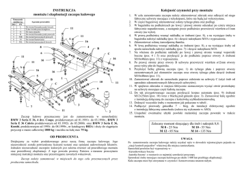 INSTRUKCJA montaŜu i eksploatacji zaczepu kulowego Oznaczenie zacisku wg ISO PN 1 L 2 + 3 31 4 R 5 58R 6 54 7 58L Kolejność czynności przy montaŜu 1. 2. 3. Łączenie przewodów Do świateł kierunku jazdy lewych Tylne światła przeciwmgłowe Do masy pojazdu Do świateł kierunku jazdy prawych Do świateł pozycyjnych prawych Do świateł hamowania Do świateł pozycyjnych lewych 11 4. 11 A 16 4 8 5. 6. B 6 11 16 16 11 7. C 8. A 16 9. 16 5 1 B 10. 10 C 11 11. 9 12. 13. 14. 3 7 11 2 Zaczep kulowy przeznaczony jest do zamontowania w samochodzie: BMW 3 Seria E 36, 4 drz. Coupe, produkowanym od 01.1991r. do 03.1998r., BMW 3 Seria E 36 Cabrio produkowanym od 03.1992r. do 03.2000r. oraz BMW 3 Seria E 36, Kombi, produkowanym od 1995r. do 08.1999r., nr katalogowy B02A i słuŜy do ciągnięcia przyczep o masie całkowitej 1800 kg i nacisku na kulę max 75 kg. OD PRODUCENTA Dziękujemy za wybór produkowanego przez naszą firmę zaczepu kulowego. Jego niezawodność została potwierdzona licznymi testami oraz opiniami zadowolonych klientów. JednakŜe niezawodność zaczepów kulowych jest zaleŜna równieŜ od prawidłowego montaŜu oraz prawidłowej eksploatacji. Z tego powodu prosimy Państwa o staranne przeczytanie niniejszej instrukcji montaŜu oraz przestrzeganie zawartych wskazówek. Zaczep naleŜy zamontować w miejscach do tego celu przeznaczonych przez producenta samochodu. 15. W celu zamontowania zaczepu naleŜy zdemontować zderzak oraz odkręcić od niego fabryczne uchwyty mocujące z teleskopami, które nie będą juŜ wykorzystane. W części bagaŜowej zdemontować osłony tylnego płata oraz podłogi. W bagaŜniku na podłuŜnicach po lewej i prawej stronie odszukać po cztery miejsca fabrycznie napunktowane, a następnie przez podłuŜnice przewiercić wiertłem ø11mm otwory (na wylot). W prawą podłuŜnicę wsunąć nakładkę ze śrubami (poz. 8), a na wystające śruby w bagaŜniku nałoŜyć nakładkę (poz. 6) i skręcić nakrętkami M10 z wyposaŜenia. Zdemontować osłonę Ŝaroodporną tłumika. W lewą podłuŜnicę wsunąć nakładkę ze śrubami (poz. 8), a na wystające śruby od spodu samochodu nałoŜyć nakładkę (poz. 7) i skręcić nakrętkami M10. Na włoŜone do podłuŜnic nakładki po lewej i prawej stronie wsunąć wsporniki boczne (poz. 4 i 5) oraz przykręcić je do podłuŜnic poprzez otwory A śrubami M10x40mm (poz. 11) z wyposaŜenia. Po prawej stronie przez otwory B uchwytu przewiercić wiertłem ø12mm otwory przez tylny płat do bagaŜnika. PrzyłoŜyć belkę główną zaczepu (poz. 1) do tylnego płata i poprzez otwory zamontowanych juŜ elementów zaczepu oraz otwory tylnego płata skręcić śrubami M10x40mm (poz. 11). Zamontować zderzak do samochodu poprzez załoŜenie na uchwyty C (uŜyć śrub od uprzednio zdemontowanych fabrycznych uchwytów). W spojlerze zderzaka w miejscu fabrycznie zaznaczonym wyciąć otwór prostokątny na uchwyty mocujące część kulistą zaczepu. Do tak przygotowanego zaczepu przykręcić korpus automatu (poz. 9) śrubami M12x25mm (poz. 10) wraz z blachą pod gniazdo (poz. 3). Zamocować kulę zgodnie z instrukcją dołączaną do zaczepu z końcówką szybkodemontowalną. Dokręcić wszystkie śruby z momentem jak pokazano w tabeli . Podłączyć przewody gniazdka 7 – bieg. do instalacji elektrycznej zgodnie z instrukcją fabryczną samochodu (zaleca się wykonanie w ASO). Uzupełnić ewentualne ubytki powłoki malarskiej zaczepu powstałe w trakcie montaŜu. Zalecany moment skręcający dla śrub i nakrętek 8,8: M 8 - 25 Nm M 10 - 55 Nm M 12 - 85 Nm M 14 - 135 Nm UWAGA Po zamontowaniu zaczepu kulowego naleŜy uzyskać wpis w dowodzie rejestracyjnym pojazdu na „stacji kontroli pojazdów” właściwej dla miejsca zamieszkania. Samochód powinien być wyposaŜony w : -kierunkowskazy boczne -lusterka boczne o rozstawie co najmniej szerokości przyczepy Sprawdzać śruby mocujące zaczepu kulowego po około 1 000 km przebiegu eksploatacji. Kula zaczepu musi być utrzymana w czystości i konserwowana smarem stałym. PPUH AUTO-HAK Sp.J. WyposaŜenie zaczepu: Produkcja Zaczepów Kulowych Henryk & Zbigniew Nejman 76-200 SŁUPSK ul. Słoneczna 16K tel/fax (059) 8-414-414; 8-414-413 e-mail: [email protected] www. autohak.com.pl Zaczep kulowy bez wyposaŜenia elektrycznego B02A Klasa: A50-X Nr kat. Przeznaczony do zamontowania w samochodzie: KARTA GWARANCYJNA Producent udziela gwarancji niniejszą kartą gwarancyjną na okres 24 miesięcy licząc od dnia zakupu zaczepu kulowegodo samochodu: BMW 3 Seria E 36, 4 drz. Coupe produkowanego od 01.1991r. do 03.1998r. BMW 3 Seria E 36, Kombi produkowanego od 1995r. do 08.1999r. BMW 3 Seria E 36, Cabrio produkowanego od 03.1992r. do 03.2000r. Data produkcji .............................. Data zakupu............................................. Zakres gwarancji obejmuje wyłącznie wady jakościowe wynikające z winy producenta. Gwarancja nie obejmuje natomiast uszkodzeń zawinionych przez nabywcę, wynikających z niewłaściwego montaŜu, uŜytkowania lub konserwacji, uszkodzeń mechanicznych, normalnego zuŜycia podczas eksploatacji itp. Gwarancja udzielona na zakupiony towar nie wyłącza, nie ogranicza ani nie zawiesza uprawnień kupującego wynikających z niezgodności towaru z umową. Reklamacje naleŜy zgłaszać w punkcie sprzedaŜy, składając jednocześnie kartę gwarancyjną. Usunięcie "wady" następuje po stwierdzeniu przez punkt sprzedaŜy wspólnie z producentem słuszności złoŜonej reklamacji. Reklamacja powinna być załatwiona w ciągu 14 dni od dnia uznania reklamacji. Karta gwarancyjna jest niewaŜna jeŜeli nie jest wypełniona i podpisana. Data zgłoszenia reklamacji: ................................................................... Producent: BMW Model: SERIA 3 (E36) Typ: 4drz., COUPE produkowanym od 01.1991r. do 03.1998r. Typ: CABRIO produkowanym od 03.1992r. do 03.2000r. Typ: KOMBI produkowanym od 1995r. do 08.1999r. Dane techniczne: War