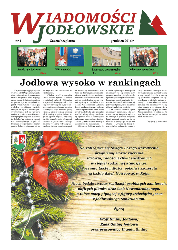 nr 1 Gazeta bezpłatna Anioły są w Jodłowej str. 6 Wójt na medal grudzień 2016 r. str. 5 Przewiązka cieszy nie tylko oko str. 4 Jodłowianie u prezydenta str. 5 Jodłowa wysoko w rankingach Kto pamięta jak wyglądała Jodłowa przed laty ? Dzięki unijnym dotacjom gmina zmienia się z miesiąca na miesiąc. Oczywiście nadal przyciąga urodą natury, jednak mieszkańcom na pewno żyje się wygodniej niż przed 10 laty. Gmina Jodłowa pod względem pozyskiwania pieniędzy unijnych na wydatki inwestycyjne i wydatki bieżące jest na pierwszym miejscu w powiecie w rankingu wykonanym przez tygodnik „Obserwator Lokalny” na podstawie czasopisma samorządowego „Wspólnota”. Natomiast w województwie podkarpackim Jodłowa uplasowała się na 12 miejscu na 180 samorządów. To wielki sukces. W Polsce na 2875 samorządów Gmina Jodłowa zajmuje 155 miejsce w wydatkach bieżących i 346 miejsce w wydatkach inwestycyjnych. - Należy zwrócić uwagę na to, że w rankingu wzięte są pod uwagę wszystkie samorządy a więc zarówno gminy wiejskie, miejsko-wiejskie, miejskie jak i powiaty a gmina Jodłowa to gmina typowo wiejska , więc żeby bardziej szczegółowo to zobrazować uważam, że przy robieniu rankingu powinny być wzięte pod uwagę dochody na jednego mieszkańca, gdyż nie możemy się porównywać z miastami czy dużymi gminami miejskimi - tym bardziej, że mamy najniższy podatek rolny w województwie, a odważę się powiedzieć że jest on również najniższy w całej Polsce – powiedział Wiadomościom Dębickim Robert Mucha, wójt gminy Jodłowa. - Można byłoby zrobić wiele więcej inwestycji, ale trzeba mieć pieniądze na wkład własny, dlatego staraliśmy się wybierać wraz z samorządem jodłowskim, pracownikami i mieszkańcami projekty najwyższej rangi i najważniejsze dla naszej gminy. Wójt gminy Jodłowa uważa, że o wielu wykonanych inwestycjach mieszkańcy już zapomnieli. Żeby pozyskać tak duże pieniądze trzeba było brać pod uwagę zrównoważenie budżetu po stronie dochodów i wydatków. Pomimo tak wielu inwestycji Jodłowa jest gminą, która ma jedno z niższych zadłużeń w powiecie. - O dobrych rzeczach szybko mieszkańcy zapominają, ale gdy rozpocznie się kampania wyborcza to opozycja w pierwszej kolejności będzie zadawać pytanie, na ile zadłużyliśmy gminę – prorokuje wójt Mucha. - Uważam, że dzisiaj nie ma gmin bez zadłużenia, ponieważ chcąc realizować inwestycje musimy mieć pieniądze na wkład własny a przy naszych dochodach musimy się posiłkować kredytami. Tak wysoka lokata to nie tylko zasługa samorządu i pracowników, nie można pominąć tutaj mieszkańców, którzy płacą podatki a my staramy się je wykorzystać jak najlepiej potrafimy. Niezaprzeczalnym dowodem na to są wykonane inwestycje i nie można z tym polemizować. Czytaj więcej na stronie 2 Samorz ąd 2 C.d. ze strony 1 Jodłowa wysoko w rankingach W okresie, za który wykonany został ranking w gminie Jodłowa dzięki pozyskanym funduszom unijnym udało się wykonać m.in. w ramach Programu Rozwoju Obszarów Wiejskich na lata 2007-2013 przebudowę rynku w Jodłowej wraz z oświetleniem drogi powiatowej. Wartość zadania wyniosła 606 000 zł, dofinansowanie 50 proc. kosztów kwalifikowanych. W ramach Programu Rozwoju Obszarów Wiejskich na lata 2007-2013 wybudowano centrum kulturalno -sportowe z zapleczem dla OSP w Dębowej. Wartość zadania wyniosła 530 000 zł, dofinansowanie 50 proc. kosztów kwalifikowanych. Poza tym w ramach Programu Rozwoju Obszarów Wiejskich na lata 2007-2013 zakupiono samochód do selektywnej zbiórki odpadów, na który przeznaczono 248 270 zł, dofinansowanie 75 proc. kosztów kwalifikowanych. W ramach Programu Rozwoju Obszarów Wiejskich na lata 2007-2013 w budynku Urzędu Gminy i Banku Spółdzielczego wymieniono stolarkę okienną, docieplono ściany wraz z no ściany wraz z elewacją i modernizacją kotłowni (etap II. Całkowita wartość inwestycji 508 522 zł, dofinansowanie 85 proc. kosztów kwalifikowanych. W budynku Szkoły Podstawowej Nr 3 w Jodłowej wymieniono okna (etap I), docieplono ściany wraz z elewacją i modernizacją kotłowni (etap II) - całkowita wartość inwestycji 427 107 zł, dofinansowanie 85 proc. kosztów kwalifikowanych. Także w budynku Szkoły Podstawowej im. Partyzantów AK w Dębowej – wymieniono okna (etap I), docieplono ściany wraz z elewacją i modernizacją kotłowni (etap II) . Wartość inwestycji 369 294 zł, dofinansowanie 85 proc. Poza tym w budynku Szkoły Podstawowej w Dęborzynie wykonano nadbudowę dachu, wymieniono okna i drzwi, docieplono ściany wraz z elewacją. Inwestycja pochłonęła 347 357 zł, dofinansowanie to 85 proc. W centrum kształcenia w Jodłowej zrealizowano projekt o wartości 111 948 zł „wioska internetowa -kształcenie na odległość na terenach wiejskich” elewacją. Wartość inwestycji wyniosła 275 904 zł, dofinansowanie 85 proc. kosztów kwalifikowanych. Wybudowano parking wraz z oświe- sfinansowany w 100 proc. z pieniędzy Europejskiego Funduszu Społecznego. Wykonano także roboty budowlane obejmujące docieplenie tleniem w Jodłowej za 452 086 zł a dofinansowanie to 50 proc. kosztów kwalifikowanych. W ramach Programu Rozwoju Obszarów Wiejskich na lata 2007-2013 wybudowano także boisko szkolne wraz ze świetlicą i parkingiem w Jodłowej Górnej za 763 579 zł, dofinansowanie to 75 proc. kosztów kwalifikowanych. W ramach tego programu zakupiono samochód ratowniczo-gaśniczy dla OSP Jodłowa. Wartość zadania 698 924 zł, dofinansowanie 85 proc. kosztów kwalifikowanych. Poza tym w budynku Szkoły Podstawowej Nr 2 im. M. Konopnickiej w Jodłowej wymieniono okna (etap I), docieplo- ścian zewnętrznych budynku Szkoły Podstawowej Nr 2 im M. Konopnickiej w Jodłowej wraz z robotami towarzyszącymi. Wartość inwestycji to 242 250 zł, dofinansowanie 85 proc. Wójt zwraca uwagę, że wykonano również roboty budowl