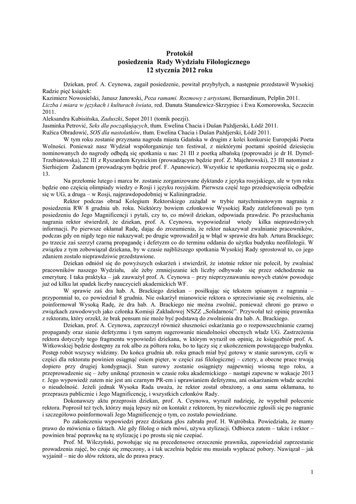 Protokół posiedzenia Rady Wydziału Filologicznego 12 stycznia 2012 roku Dziekan, prof. A. Ceynowa, zagaił posiedzenie, powitał przybyłych, a następnie przedstawił Wysokiej Radzie pięć ksiąŜek: Kazimierz Nowosielski, Janusz Janowski, Poza ramami. Rozmowy z artystami, Bernardinum, Pelplin 2011. Liczba i miara w językach i kulturach świata, red. Danuta Stanulewicz-Skrzypiec i Ewa Komorowska, Szczecin 2011. Aleksandra Kubisińska, Zaduszki, Sopot 2011 (tomik poezji). Jasminka Petrović, Seks dla początkujących, tłum. Ewelina Chacia i Dušan Paždjerski, Łódź 2011. Ružica Obradowić, SOS dla nastolatków, tłum. Ewelina Chacia i Dušan Paždjerski, Łódź 2011. W tym roku zostanie przyznana nagroda miasta Gdańska w drugim z kolei konkursie Europejski Poeta Wolności. PoniewaŜ nasz Wydział współorganizuje ten festiwal, z niektórymi poetami spośród dziesięciu nominowanych do nagrody odbędą się spotkania u nas: 21 III z poetką albańską (poprowadzi je dr H. DymelTrzebiatowska), 22 III z Ryszardem Krynickim (prowadzącym będzie prof. Z. Majchrowski), 23 III natomiast z Sierhiejem śadanem (prowadzącym będzie prof. F. Apanowicz). Wszystkie te spotkania rozpoczną się o godz. 13. Na przełomie lutego i marca br. zostanie zorganizowane dyktando z języka rosyjskiego, ale w tym roku będzie ono częścią olimpiady wiedzy o Rosji i języku rosyjskim. Pierwsza część tego przedsięwzięcia odbędzie się w UG, a druga – w Rosji, najprawdopodobniej w Kaliningradzie. Rektor podczas obrad Kolegium Rektorskiego zaŜądał w trybie natychmiastowym nagrania z posiedzenia RW 8 grudnia ub. roku. Niektórzy bowiem członkowie Wysokiej Rady zatelefonowali po tym posiedzeniu do Jego Magnificencji i pytali, czy to, co mówił dziekan, odpowiada prawdzie. Po przesłuchania nagrania rektor stwierdził, Ŝe dziekan, prof. A. Ceynowa, wypowiedział wtedy kilka nieprawdziwych informacji. Po pierwsze okłamał Radę, dając do zrozumienia, Ŝe rektor nakazywał zwalnianie pracowników, podczas gdy on nigdy tego nie nakazywał; po drugie wprowadził ją w błąd w sprawie dra hab. Artura Brackiego; po trzecie zaś szerzył czarną propagandę i defetyzm co do terminu oddania do uŜytku budynku neofilologii. W związku z tym zobowiązał dziekana, by w czasie najbliŜszego spotkania Wysokiej Rady sprostował to, co jego zdaniem zostało nieprawdziwie przedstawione. Dziekan odniósł się do powyŜszych oskarŜeń i stwierdził, Ŝe istotnie rektor nie polecił, by zwalniać pracowników naszego Wydziału, ale Ŝeby zmniejszanie ich liczby odbywało się przez odchodzenie na emeryturę. I taka praktyka – jak zauwaŜył prof. A. Ceynowa – przy nieprzyznawaniu nowych etatów powoduje juŜ od kilku lat spadek liczby nauczycieli akademickich WF. W sprawie zaś dra hab. A. Brackiego dziekan – posiłkując się tekstem spisanym z nagrania – przypomniał to, co powiedział 8 grudnia. Nie oskarŜył mianowicie rektora o sprzeciwianie się zwolnieniu, ale poinformował Wysoką Radę, Ŝe dra hab. A. Brackiego nie moŜna zwolnić, poniewaŜ chroni go prawo o związkach zawodowych jako członka Komisji Zakładowej NSZZ „Solidarność”. Przywołał teŜ opinię prawnika z rektoratu, który orzekł, Ŝe brak pensum nie moŜe być podstawą do zwolnienia dra hab. A. Brackiego. Dziekan, prof. A. Ceynowa, zaprzeczył równieŜ słuszności oskarŜania go o rozpowszechnianie czarnej propagandy oraz sianie defetyzmu i tym samym sugerowanie nieudolności obecnych władz UG. ZastrzeŜenia rektora dotyczyły tego fragmentu wypowiedzi dziekana, w którym wyraził on opinię, Ŝe księgozbiór prof. A. Witkowskiej będzie dostępny za rok albo za półtora roku, bo to łączy się z ukończeniem powstającego budynku. Postęp robót wszyscy widzimy. Do końca grudnia ub. roku gmach miał być gotowy w stanie surowym, czyli w części dla rektoratu powinien osiągnąć osiem pięter, w części zaś filologicznej – cztery, a obecne prace trwają dopiero przy drugiej kondygnacji. Stan surowy zostanie osiągnięty najpewniej wiosną tego roku, a przeprowadzenie się – Ŝeby uniknąć przenosin w czasie roku akademickiego – nastąpi zapewne w wakacje 2013 r. Jego wypowiedź zatem nie jest ani czarnym PR-em i uprawianiem defetyzmu, ani oskarŜaniem władz uczelni o nieudolność. JeŜeli jednak Wysoka Rada uwaŜa, Ŝe rektor został obraŜony, a ona sama okłamana, to przeprasza publicznie i Jego Magnificencję, i wszystkich członków Rady. Dokonawszy aktu przeprosin dziekan, prof. A. Ceynowa, wyraził nadzieję, Ŝe wypełnił polecenie rektora. Poprosił teŜ tych, którzy mają lepszy niŜ on kontakt z rektorem, by niezwłocznie zgłosili się po nagranie i szczegółowo poinformowali Jego Magnificencję o tym, co zostało powiedziane. Po zakończeniu wypowiedzi przez dziekana głos zabrała prof. H. Wątróbska. Powiedziała, Ŝe mamy prawo do mówienia o faktach. Ale gdy filolog o nich mówi, uŜywa stylizacji. Odbiorca zatem – takŜe i rektor – powinien brać poprawkę na tę stylizację i po prostu się nie czepiać. Prof. M. Wilczyński, powołując się na precedensowe orzeczenie prawnika, zapowiedział zaprzestanie prowadzenia zajęć, bo czuje się zmęczony, a i tak uczelnia będzie mu musiała wypłacać pobory. Nawiązał – jak wyjaśnił – nie do słów rektora, ale do prawa pracy. 1 Po wstępnej części dziekan przeszedł do zatwierdzenia porządku posiedzenia. PoniewaŜ nikt nie zgłosił uwag do tego porządku, odbyło się głosowanie nad jego przyjęciem. Skład RW 114 osób, w tym 80 pracowników samodzielnych; obecnych 72 osoby, w tym 59 pracowników samodzielnych. W głosowaniu jawnym wszystkich członków RW porządek posiedzenia został jednogłośnie przyjęty. Porządek posiedzenia: 1. Sprawy personalne. 2. Nagrody ministra i odznaczenia państwowe. 3. Zarządzenie Dziekana Wydziału Filologicznego w sprawie zmiany składu Wydziałowego Zespołu ds. Za