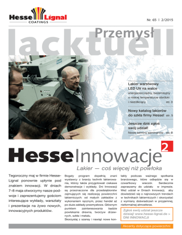 Nr. 65 | 2/2015 COAT I N G S Przemysł Lakier warstwowy LED UV na walce energooszczędny, bezemisyjny o niskiej temperaturze obróbki i nieżółknący str. 3 Nowy katalog lakierów do szkła firmy Hesse! str. 5 Jeszcze dziś zgłoś swój udział! Nowe terminy seminariów str. 8 Hesse Innowacje Lakier — coś więcej niż powłoka Tegoroczny maj w firmie HesseLignal ponownie upłynie pod znakiem innowacji. W dniach 7–8 maja otworzymy nasze podwoje i zaprezentujemy gościom interesujące wykłady, warsztaty i prezentacje na żywo nowych, innowacyjnych produktów. Bogaty program dopełnią znani wystawcy z branży technik lakierowania, którzy także przygotowali ciekawe demonstracje i wykłady. Dni Innowacji są przeznaczone dla przedsiębiorstw zajmujących się realizacją powierzchni lakierniczych: od małych zakładów z wykonaniem ręcznym, przez handel aż po duże zakłady przemysłowe. Głównym punktem zainteresowania będzie powlekanie drewna, tworzyw drzewnych, szkła i metalu. Skorzystaj z szansy i nawiąż nowe kon- takty podczas ważnego spotkania branżowego, które odbędzie się w czwartkowy wieczór. Serdecznie zapraszamy do udziału w imprezie. Weź udział w Dniach Innowacji, aby dowiedzieć się o najnowszych trendach w technikach lakierniczych i skorzystać z wymiany doświadczeń w przyjemnej, nieformalnej atmosferze. Zgłoś swój udział jeszcze dzisiaj! www.hesse-lignal.de > DNI INNOWACJI Akcenty dotyczące powierzchni PRODUKTY Drodzy Czytelnicy, Dni Innowacji są coraz bliżej, dlatego cały zespół firmy Hesse dokłada starań, aby już po raz drugi zorganizować tę ważną imprezę branżową na najwyższym poziomie. Również niniejsze wydanie magazynu lacktuell ma na celu informowanie naszych klientów na bieżąco o obecnie realizowanych interesujących projektach — bo innowacjami w firmie Hesse zajmujemy się każdego dnia, a nie tylko raz w roku podczas Dni Innowacji. Główne cele naszego działu badań i rozwoju to opracowywanie przyjaznych dla środowiska rozwiązań, które oszczędzają zasoby i jednocześnie zapewniają Wam, drodzy Czytelnicy, korzyści w procesach obróbki. W tej kwestii mamy ponownie kilka nowości do zaoferowania. Warto tu wymienić m.in. nowy wodny lakier barwny Hesse-HydroSpeed-Color, opracowany specjalnie dla obróbki przemysłowej. Charakteryzuje się on krótkim czasem schnięcia i uzyskania przez element powlekany przydatności do układania w sztapli. Kolejną nowością jest nowa generacja lakierów utwardzanych urządzeniami UV LED. Mimo że polityczne zawirowania w Europie, spowodowane kryzysem na linii Rosja-Ukraina i wysokim zadłużeniem Grecji, wpływają na ograniczenie ważnego dla niemieckiej gospodarki eksportu, firma Hesse nadal konsekwentnie stawia na innowacje. Z pozdrowieniem, Jens Hesse 2 lacktuell Przemysł 2/2015 Można już składować powlekane elementy czy trzeba jeszcze czekać? Szukasz przyjaznego systemu jednokomponentowych lakierów barwnych HYDRO, który możesz zastosować w swoim zakładzie? Musisz tylko zabezpieczać powierzchnię lub lakierować płaszczyzny które będą normalnie obciążone? Nie chcesz lub nie możesz użyć do lakierowania linii UV a zależy ci bardzo na czasie? Zatem przetestuj nasz nowy szybkoschnący lakier HYDRO-SPEEDCOLOR HB 65255-(barwa). Ten system lakierów barwnych wyróżnia się znikomym skurczem, odpornością na zadrapania, doskonałą gładkością powierzchni i odpornością na reakcje ze złotem lub srebrem (biżuteria użytkowników). Obróbka jest oczywiście możliwa za pomocą pistoletu ze zbiornikiem, a także w procesach Airless lub Airmix (oba mogą być realizowane w sposób automatyczny!) bezpośrednio na większości gatunków drewna, na różnych wypełniaczach i oszlifowanych foliach. www.hesse-lignal.de W ramach swojej klasy produktów lakiery HYDRO SPEED-COLOR wyróżniają się wyjątkowo szybkim schnięciem. Ponadto materiał można także suszyć w sposób wymuszony. W praktyce podczas suszenia tego materiału stosuje się suszarnie z cyrkulacją powietrza o temperaturze do 40°C i długości cyklu poniżej 30 minut. Dzięki temu zastosowanie nowego rozwiązania warto rozważyć w produkcji seryjnej. Stosując wydajniejsze metody suszenia (OIR, NIR, MOS itp.) można jeszcze bardziej skrócić długości cykli obróbki. Brzmi interesująco? Zatem skontaktuj się z nami. Mamy optymalne rozwiązanie dla Twoich wyzwań związanych z lakierowaniem. PRODUKTY Lakier warstwowy na walce, utwardzany LED UV — energooszczędny, bezemisyjny, o niskiej temperaturze obróbki i nieżółknący. W poprzednich wydaniach magazynu lacktuell ogólnie informowaliśmy o technice utwardzania UVLED. Do zalet nowego rozwiązania należy zaliczyć oszczędności w kwestii zużycia energii, brak emisji np. ozonu, a także brak konieczności podgrzania substratu. Dlatego podczas użytkowania urządzeń UV-LED w połączeniu z promieniowaniem UV-C można zrezygnować z odciągu w module promiennika. W przypadku kombinacji z chłodzeniem wodnym agregatu operator zyskuje stanowisko pracy o znacznie niższym poziomie hałasu. Ale czy korzyści w zakresie oszczędności energii i redukcji hałasu lub innych emisji idą w parze z zadowalającymi właściwościami wykonanej powłoki? Tylko jeden produkt lakierniczy spełnia oczekiwania użytkowników i jednocześnie oferuje korzyści nowej technologii. Mamy zaszczyt zaprezentować jednego z przedstawicieli rozwiązań z tej serii: lakier warstwowy Hesse LED UV UE 70005 do nakładania walcami Jedną z najważniejszych cech wyróżniających ten lakier na tle dotychczasowej oferty rynkowej jest absolutna odporność na światło. Produkty konkurencyjne wykazują tutaj mocne zażółcenia, które znacznie zawężają obszar zastosowania. Lakier UE 70005 jest pod tym względem wyjątkowy. Produkt można nanosić od jednej do czterech warstw w ilości 10-30 g/m² za pomocą walców z twardej gumy/gładkich na wszystkie s