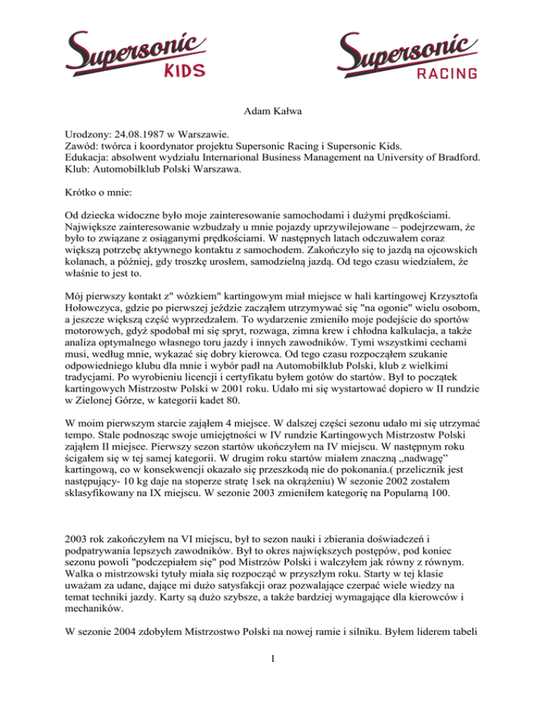 Adam Kałwa Urodzony: 24.08.1987 w Warszawie. Zawód: twórca i koordynator projektu Supersonic Racing i Supersonic Kids. Edukacja: absolwent wydziału Internarional Business Management na University of Bradford. Klub: Automobilklub Polski Warszawa. Krótko o mnie: Od dziecka widoczne było moje zainteresowanie samochodami i dużymi prędkościami. Największe zainteresowanie wzbudzały u mnie pojazdy uprzywilejowane – podejrzewam, że było to związane z osiąganymi prędkościami. W następnych latach odczuwałem coraz większą potrzebę aktywnego kontaktu z samochodem. Zakończyło się to jazdą na ojcowskich kolanach, a później, gdy troszkę urosłem, samodzielną jazdą. Od tego czasu wiedziałem, że właśnie to jest to. Mój pierwszy kontakt z" wózkiem" kartingowym miał miejsce w hali kartingowej Krzysztofa Hołowczyca, gdzie po pierwszej jeździe zacząłem utrzymywać się "na ogonie" wielu osobom, a jeszcze większą część wyprzedzałem. To wydarzenie zmieniło moje podejście do sportów motorowych, gdyż spodobał mi się spryt, rozwaga, zimna krew i chłodna kalkulacja, a także analiza optymalnego własnego toru jazdy i innych zawodników. Tymi wszystkimi cechami musi, według mnie, wykazać się dobry kierowca. Od tego czasu rozpocząłem szukanie odpowiedniego klubu dla mnie i wybór padł na Automobilklub Polski, klub z wielkimi tradycjami. Po wyrobieniu licencji i certyfikatu byłem gotów do startów. Był to początek kartingowych Mistrzostw Polski w 2001 roku. Udało mi się wystartować dopiero w II rundzie w Zielonej Górze, w kategorii kadet 80. W moim pierwszym starcie zająłem 4 miejsce. W dalszej części sezonu udało mi się utrzymać tempo. Stale podnosząc swoje umiejętności w IV rundzie Kartingowych Mistrzostw Polski zająłem II miejsce. Pierwszy sezon startów ukończyłem na IV miejscu. W następnym roku ścigałem się w tej samej kategorii. W drugim roku startów miałem znaczną „nadwagę” kartingową, co w konsekwencji okazało się przeszkodą nie do pokonania.( przelicznik jest następujący- 10 kg daje na stoperze stratę 1sek na okrążeniu) W sezonie 2002 zostałem sklasyfikowany na IX miejscu. W sezonie 2003 zmieniłem kategorię na Popularną 100. 2003 rok zakończyłem na VI miejscu, był to sezon nauki i zbierania doświadczeń i podpatrywania lepszych zawodników. Był to okres największych postępów, pod koniec sezonu powoli "podczepiałem się" pod Mistrzów Polski i walczyłem jak równy z równym. Walka o mistrzowski tytuły miała się rozpocząć w przyszłym roku. Starty w tej klasie uważam za udane, dające mi dużo satysfakcji oraz pozwalające czerpać wiele wiedzy na temat techniki jazdy. Karty są dużo szybsze, a także bardziej wymagające dla kierowców i mechaników. W sezonie 2004 zdobyłem Mistrzostwo Polski na nowej ramie i silniku. Byłem liderem tabeli 1 już od połowy sezonu, jednak moja przewaga nad 2. zawodnikiem była nieznaczna. Ostateczny wynik miał rozstrzygnąć się dopiero w ostatnim wyścigu w sezonie. Startując z ostatniej pozycji musiałem dokonać rzeczy prawie niemożliwej do zrobienia, aby myśleć o tytule mistrzowskim musiałem być drugi. Wyprzedzając średnio jednego zawodnika na okrążeniu, na dwa okrążenia przed metą dogoniłem jadącego na drugiej pozycji zawodnika. Ten umiejętnie stopował mnie, aż do ostatniego zakrętu zawodów, na którym to wyprzedziłem konkurenta stając się Mistrzem Polski. 2005 roku starty zakończyłem na 3. miejscu. Był to sezon zaciętej walki zarówno z konkurencją, jak i ze sprzętem. Od pierwszej rundy utrzymywałem się w ścisłej czołówce, potwierdziłem swoje umiejętności i formę na mistrzowskim poziomie. W sezonie 2006 zmieniłem kategorię na Intercontinental A (ICA). Był to rok nauki charakterystyki nowego silnika, oraz walki ze swoimi słabościami, gdyż na większości zawodów albo walczyliśmy ze sprzętem, z kontuzjami, albo z chorobami. Dlatego z sukcesów i zwycięstw cieszyliśmy się bardziej niż zwykle, tak jak z wygranej w Biłgoraju w II rundzie KMP 04.06 2006. Szczególnie w pamięci zapadł mi finałowy bieg w Koszalinie w VI rundzie KMP. Wyścig został przeprowadzony po obfitej letniej burzy, w takich warunkach istotne są umiejętności kierowcy, spryt i ustawienia ramy. Mniejsze znaczenie ma moc silnika, na tych zawodach zająłem II miejsce za zawodnikiem startującym w pełnym cyklu silniejszej od rodzimej ligi niemieckiej. Uważam to za duży sukces, udało nam się zdeklasować konkurencje dublując 6 zawodnika ze stawki 15 kierowców. Sezon ukończyłem na 4. miejscu, tracąc jedynie 1 punkt do 3. zawodnika. W sezonie 2007 w kategorii ICA chcieliśmy walczyć o Mistrzostwo Polski. W przerwie zimowej z przykrością obserwowałem decyzje władz polskiego sportu kartingowego, jak i międzynarodowych organizacji. W myśl nowych przepisów kategoria ICA przestaje startować w czempionatach kontynentalnych i światowym, co za tym idzie, spada zainteresowanie zawodników tą kategorią. W konsekwencji miesiąc przed rozpoczęciem sezonu 2007 w kategorii ICA w Polsce starty planowało jedynie 3 zawodników. Stając przed ciężką decyzją postanowiłem w sezonie 2007 ponownie zmienić kategorię na Rok 125. Wiązało się to z nauką charakterystyki sprzętu na 2 tygodnie przed startami. Puchar Rok 125 jest czempionatem markowym, patronat nad jej rozgrywkami mają fabryki sprzętu kartingowego takie jak: Vortex (producent silników), czy znana z formuły 1 firma Bridgestone. Obecność liczących się koncernów daje zawodnikom i sponsorom bezpieczeństwo regulaminowe, a co za tym idzie jednolity międzynarodowy regulamin daje możliwość startów na całym Świecie. Starty w tej kategorii uważam za rozwojowe. Najlepsi zawodnicy z lig krajowych dostają zaproszenie na nieoficjalne mistrzostwa świata w tej kategorii. Po sezonie 2006 takie zawody odbyły się na włoskim torze w Lonato. Sezon 2007