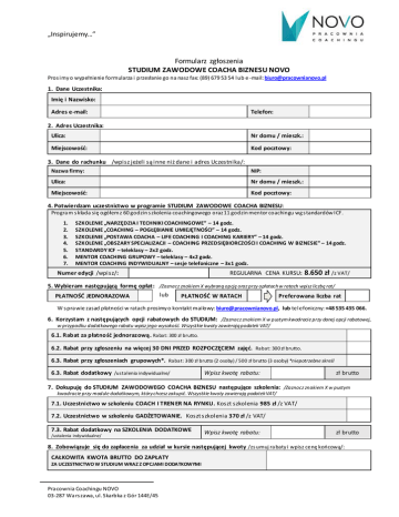 „Inspirujemy…” Formularz zgłoszenia STUDIUM ZAWODOWE COACHA BIZNESU NOVO Pros i my o wypełnienie formularza i przesłanie go na nasz fax: (89) 679 53 54 l ub e -mail: [email protected] 1. Dane Uczestnika: Imię i Nazwisko: Adres e-mail: Telefon: 2. Adres Uczestnika: Ulica: Nr domu / mieszk.: Miejscowość: Kod pocztowy: 3. Dane do rachunku /wpisz jeżeli są inne niż dane i adres Uczestnika/: Nazwa firmy: NIP: Ulica: Nr domu / mieszk.: Miejscowość: Kod pocztowy: 4. Potwierdzam uczestnictwo w programie STUDIUM ZAWODOWE COACHA BIZNESU: Progra m s kłada się ogółem z 60 godzin s zkolenia coachingowego oraz 11 godzin mentor coachingu wg s tandardów ICF. 1. 2. 3. 4. 5. 6. 7. SZKOLENIE „NARZĘDZIA I TECHNIKI COACHINGOWE” – 14 godz. SZKOLENIE „COACHING – POGŁĘBIANIE UMIEJĘTNOŚCI” – 14 godz. SZKOLENIE „POSTAWA COACHA – LIFE COACHING I COACHING KARIERY” – 14 godz. SZKOLENIE „OBSZARY SPECJALIZACJI – COACHING PRZEDSIĘBIORCZOŚCI I COACHING W BIZNESIE” – 14 godz. STANDARDY ICF – teleklasy – 2x2 godz. MENTOR COACHING GRUPOWY – teleklasy – 4x2 godz. MENTOR COACHING INDYWIDUALNY – sesje telefoniczne – 3x1 godz. Numer edycji /wpisz/: REGULARNA CENA KURSU: 8.650 zł /z VAT/ 5. Wybieram następującą formę opłat: /Zaznacz znakiem X wybraną opcję oraz przy opłatach w ratach wpisz liczbę rat/ lub PŁATNOŚĆ JEDNORAZOWA PŁATNOŚĆ W RATACH Preferowana liczba rat W s pra wie zasad płatności w ratach prosimy o kontakt mailowy: [email protected], lub tel efoniczny: +48 535 435 066. 6. Korzystam z następujących opcji rabatowych do STUDIUM: /Zaznacz znakiem X w pustym kwadracie przy danej opcji rabatowej, w przypadku dodatkowego rabatu wpisz jego wysokość. Wszystkie kwoty zawierają podatek VAT/ 6.1. Rabat za płatność jednorazową. Rabat: 300 zł brutto. 6.2. Rabat przy zgłoszeniu na więcej 30 DNI PRZED ROZPOCZĘCIEM zajęć. Rabat: 300 zł brutto. 6.3. Rabat przy zgłoszeniach grupowych*. Rabat: 300 zł brutto (2 osoby) / 500 zł brutto (3 osoby) *niepotrzebne skreśl 6.3. Rabat dodatkowy /ustalenia indywidualne/ Wpisz kwotę rabatu: zł brutto 7. Dokupuję do STUDIUM ZAWODOWEGO COACHA BIZNESU następujące szkolenia: /Zaznacz znakiem X w pustym kwadracie przy module dodatkowym, który chcesz zakupić. Wszystkie kwoty zawierają podatek VAT/ 7.1. Uczestnictwo w szkoleniu COACH I TREN ER NA RYNKU. Koszt szkolenia 985 zł /z VAT/ 7.2. Uczestnictwo w szkoleniu GADŻETOWANIE. Koszt szkolenia 370 zł /z VAT/ 7.3. Rabat dodatkowy na SZKOLENIA DODATKOWE /ustalenia indywidualne/ Wpisz kwotę rabatu: zł brutto 8. Zobowiązuje się do zapłacenia za udział w kursie następującej kwoty /zs umuj ra baty i wpisz cenę końcową/: CAŁKOWITA KWOTA BRUTTO DO ZAPŁATY ZA UCZESTNICTWO W STUDIUM WRAZ Z OPCJAMI DODATKOWYMI Pra cownia Coachingu NOVO 03-287 Wa rs zawa, ul. Skarbka z Gór 144E/45 „Inspirujemy…” WARUNKI UCZESTNICTWA Akceptuję poniższe warunki uczestnictwa: I. Potwierdzenie uczestnictwa 1. Przesłanie Formularza zgłoszenia traktowane jest jako akceptacja warunków udziału w programie Studium Zawodowe Coacha Biznesu oraz zgoda na wystawienie faktury za uczestnictwo w programie. 2. Ostateczne potwierdzenie uczestnictwa w programie następuje po zaksięgowaniu na koncie NOVO sp. z o.o. pełnej należności za kurs, a w przypadku rozbicia należności na raty – po zaksięgowaniu pierwszej raty. Wpłaty należy dokonać na konto w mBanku, numer konta: 78 1140 2004 0000 3602 7510 6185. Faktura zostanie wystawiona najpóźniej do 15 dnia kolejnego miesiąca, w którym nastąpiło zaksięgowanie środków na koncie. Faktura zostanie przesyłana pocztą elektroniczną na adres podany w formularzu zgłoszenia. W przypadku konieczności wystawienia faktury w formie papierowej i przesłania jej pocztą tradycyjną, doliczamy opłatę w wysokości 7 zł brutto. 3. W przypadku rozbicia należności na raty uczestnik zobowiązuje się dokonywać spłat termin owo. Nieuczestniczenie w którymkolwiek ze zjazdów nie zwalnia uczestnika z obowiązku uiszczenia opłat. 4. W przypadku płatności na raty, harmonogram płatności zostanie potwierdzony w oddzielnym e-mailu. II. Warunki uczestnictwa i ukończenia programu 5. Maksymalna ilość uczestników biorących udział w programie to 18 osób, w sesji mentor coachingu grupowego 10 osób, chyba że prowadzi ją dwóch akredytowanych coachów. 6. Uczestnik jest zobowiązany do przestrzegania zasady „wszystko albo nic” zgodnie, z którą nie może brać udziału we fragmencie zajęć, lecz jest zobowiązany do punktualnego przychodzenia na zajęcia i uczestnictwa w pełnym wymiarze godzin danego szkolenia. Ponad 3 godzinna nieobecność na szkoleniu jest równoznac zna z koniecznością powtórzenia tego s zkolenia. Koszt ponownego uczestnictwa w szkoleniu wynosi 500 zł brutto. W sytuacji nieobecności na sesj ach mentor coachingu grupowego lub indywidualnego nie przewiduje się możliwości odrabiania sesji. Termin sesji mentor coachingu indywidualnego uzgadnia się z Uczestnikiem. 7. Warunkiem ukończenia programu i uzyskania Dyplomu Studium Zawodowego Coacha Biznesu jest uczestnictwo we wszystkich czterech szkoleniach i uregulowanie wszystkich płatności względem NOVO sp. z o.o.. Udział w sesjach mentor coachingu nie jest obowiązkowy. 8. Warunkiem uzyskania Certyfikatu Coacha Biznesu NOVO jest ukończenie programu i uzyskanie dyplomu Studium Zawodowego Coacha Biznesu oraz dodatkowo odbycie minimum 3 z 4 sesji mentor coachingu grupowego, odbycie 3 indywidualnych sesji coachingu indywidualnego oraz zaliczenie egzaminu końcowego. 9. Uczestnik, który nie uczestniczył we wszystkich czterech szkoleniach w ramach programu, uzyskuje zaświadczenie o uczestnictwie w wybranych szkoleniach Studium Zawodowego Coacha Biznesu w wymiarze czasowym zgodnym z jego rzeczywistą obecnością na zajęciach. III. Rezygnacja z uczestnictwa w programie 10. Odwołanie uczestnictwa w programie następuje 