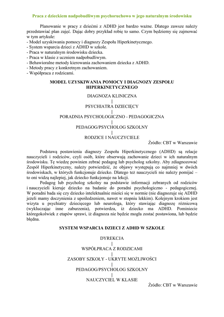 Praca z dzieckiem nadpobudliwym psychoruchowo w jego naturalnym środowisku Planowanie w pracy z dziećmi z ADHD jest bardzo ważne. Dlatego zawsze należy przedstawiać plan zajęć. Dając dobry przykład robię to samo. Czym będziemy się zajmować w tym artykule: - Model uzyskiwania pomocy i diagnozy Zespołu Hiperkinetycznego. - System wsparcia dzieci z ADHD w szkole. - Praca w naturalnym środowisku dziecka. - Praca w klasie z uczniem nadpobudliwym. - Behawioralne metody kierowania zachowaniem dziecka z ADHD. - Metody pracy z konkretnym zachowaniem. - Współpraca z rodzicami. MODEL UZYSKIWANIA POMOCY I DIAGNOZY ZESPOŁU HIPERKINETYCZNEGO DIAGNOZA KLINICZNA | PSYCHIATRA DZIECIĘCY | PORADNIA PSYCHOLOGICZNO - PEDAGOGICZNA | PEDAGOG/PSYCHOLOG SZKOLNY | RODZICE I NAUCZYCIELE Źródło: CBT w Warszawie Podstawą postawienia diagnozy Zespołu Hiperkinetycznego (ADHD) są relacje nauczycieli i rodziców, czyli osób, które obserwują zachowanie dzieci w ich naturalnym środowisku. Tę wiedzę powinien zebrać pedagog lub psycholog szkolny. Aby zdiagnozować Zespół Hiperkinetyczny, należy potwierdzić, że objawy występują co najmniej w dwóch środowiskach, w których funkcjonuje dziecko. Dlatego też nauczycieli nie należy pomijać – to oni widzą najlepiej, jak dziecko funkcjonuje na lekcji. Pedagog lub psycholog szkolny na podstawie informacji zebranych od rodziców i nauczycieli kieruje dziecko na badanie do poradni psychologiczno - pedagogicznej. W poradni bada się czy dziecko intelektualnie mieści się w normie (nie diagnozuje się ADHD jeżeli mamy doczynienia z upośledzeniem, nawet w stopniu lekkim). Kolejnym krokiem jest wizyta u psychiatry dziecięcego lub neurologa, który stawiając diagnozę różnicową (wykluczając inne zaburzenia), potwierdza, iż dziecko ma ADHD. Pominiecie któregokolwiek z etapów sprawi, iż diagnoza nie będzie mogła zostać postawiona, lub będzie błędna. SYSTEM WSPARCIA DZIECI Z ADHD W SZKOLE DYREKCJA | WSPÓŁPRACA Z RODZICAMI | ZASOBY SZKOŁY - UKRYTE MOŻLIWOŚCI | PEDAGOG/PSYCHOLOG SZKOLNY | NAUCZYCIEL W KLASIE Źródło: CBT w Warszawie W szkole z dzieckiem z ADHD pracuje przede wszystkim nauczyciel - to on ma najcięższe zadanie. Nauczyciel za pomocą behawioralnych metod kieruje zachowaniem dziecka. Odsyłanie dziecka z ADHD do gabinetu psychologa, pedagoga czy nawet dyrektora nie ma sensu (ponieważ dziecko musi nauczyć się właściwego zachowania w klasie a nie gabinecie). Jednak nauczyciel nie jest w szkole sam. Wsparciem dla nauczyciela mają być pedagog i psycholog szkolny, którzy działają w tym systemie jako trenerzy, lub doradcy - pomagają zaplanować nauczycielowi pracę z dzieckiem, podsuwają pomysły na rozwiązanie trudnych sytuacji itp. Nie angażują się bezpośrednio w pracę z dzieckiem - raczej koncentrują się na współpracy z rodzicami (ale także na zasadzie doradzania, układania strategii postępowania etc.). Bardzo często w szkołach niewykorzystane są tzw. ukryte zasoby/możliwości. Przykładowo pani woźna nawiązująca dobre kontakty z dziećmi, może na jakiś czas podczas lekcji przejąć opiekę nad dzieckiem, które musi wyjść z klasy (może być to także pani bibliotekarka, czy jakikolwiek inny pracownik szkoły). Ukryte zasoby szkoły, to np. wykorzystanie sali gimnastycznej czy siłowni podczas przerw, po to aby dzieci wyładowały nadmiar energii we właściwy z naszego punktu widzenia sposób. Dla starszych dzieci (które nie mają już dużych potrzeb ruchowych) można otworzyć salę komputerową większość dzieci z ADHD uwielbia pracę z komputerem. W trakcie przerw musimy pamiętać o tym, że dzieci z ADHD mają trudności ze zorganizowaniem sobie czasu wolnego i jeśli my im czegoś nie zaproponujemy, to mogą pojawić się problemy. Kolejny poziom wsparcia dziecka z ADHD w szkole, to współpraca z rodzicami. Współpraca ta nie zawsze jest możliwa, jednak jeżeli rodzic jest chętny to oczywiście należy to wykorzystać. Przede wszystkim umówić się, co robi szkoła (np. nauczyciele dopilnowują, aby zadanie domowe uczeń miał zawsze zapisane w zeszycie) a co robią rodzice (np. odrabiają codziennie o ustalonej porze zadania domowe z dzieckiem). Rolą szkoły jest także wsparcie rodziców i podsuwanie im nie tylko informacji na temat ADHD, ale także rozwiązań pewnych problemów. Przykładowo, jeśli rodzice nie mogą z dzieckiem odrabiać lekcji, szkoła mogłaby pomóc w zorganizowaniu pomocy studentów - wolontariuszy, którzy w ramach praktyk wspomagaliby rodziców. Zadaniem dyrekcji w tym całym systemie jest przede wszystkim taka organizacja prawa szkolnego, która ułatwiałaby pracę z dziećmi z ADHD - np. w formie zmiany dyżurów nauczycieli na przerwach, aby część z nich mogła czuwać nad bezpieczeństwem dzieci w otwartej sali gimnastycznej, siłowni czy sali komputerowej. Także stworzenie ogólnoszkolnego systemu konsekwencji piętnujących niewłaściwe zachowania (np. całkowite odmówienie przez ucznia wykonywania poleceń nauczyciela na lekcji) to rola dyrekcji we współpracy z radą pedagogiczną. Rolą dyrekcji jest także kierowanie nauczycieli na szkolenia, na których będą oni zapoznawać się metodami pracy z uczniem nadpobudliwym. Warto pamiętać o tym, iż szkoła nie jest sama - istnieją instytucje, które można i należy poprosić o pomoc w rozwiązaniu problemów, z którymi sama placówka już sobie nie radzi (np. poradnie psychologiczno - pedagogiczne, czy ośrodki doskonalenia nauczycieli). PRACA Z DZIECKIEM W JEGO NATURALNYM ŚRODOWISKU Praca z dzieckiem nadpobudliwym odbywa się "TU I TERAZ", czyli w jego naturalnym środowisku, tzn. tam, gdzie w danej chwili znajduje się dziecko - w domu, w szkole, na basenie, na wycieczcie etc. Korekcja zachowania może odbywać się TYLKO na bieżąco. Gabinet pedagoga, czy psychologa nie jest miejscem, w którym można cokolwiek osiągnąć. Także nauczanie indywidualne n