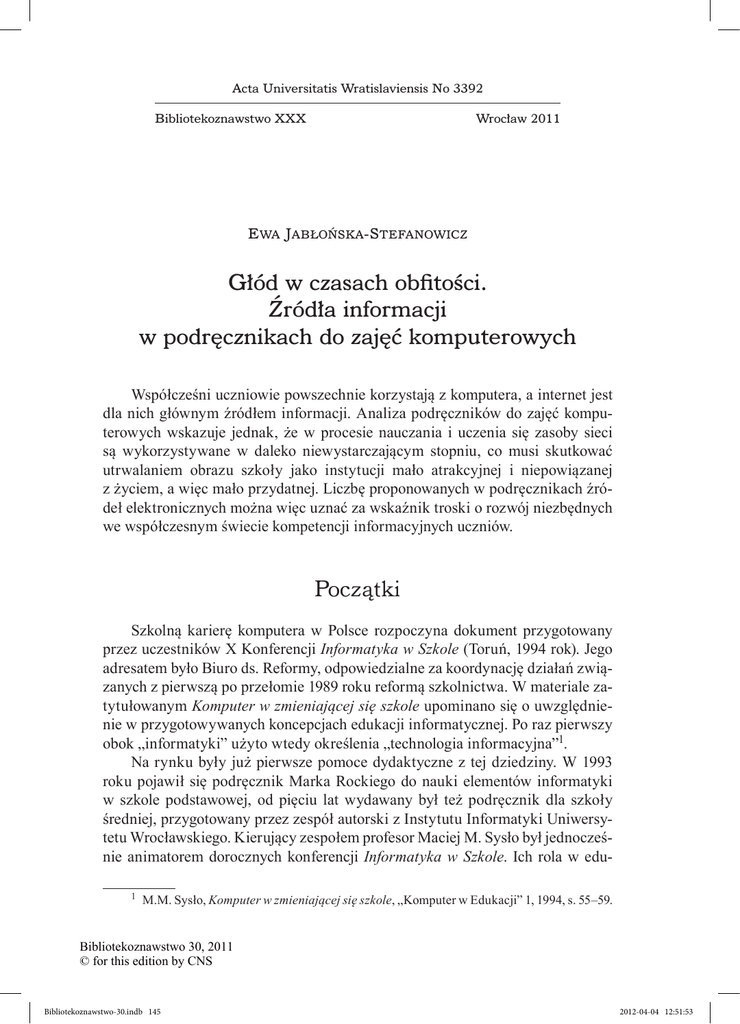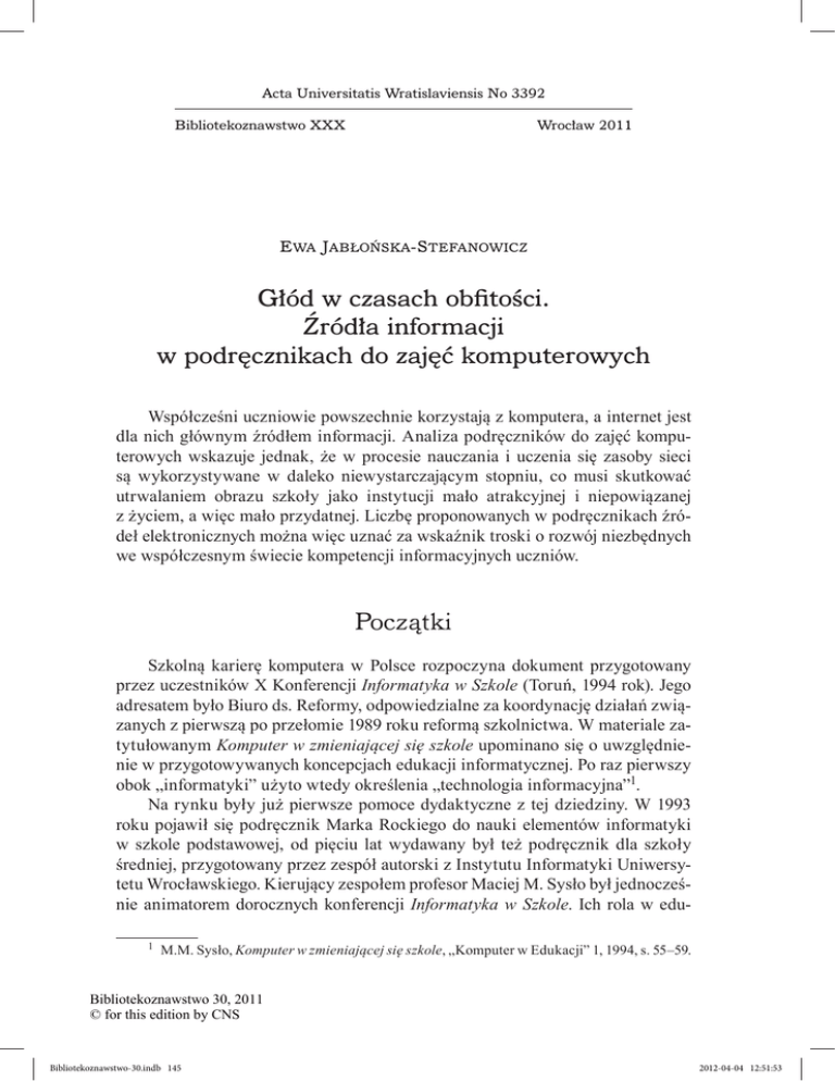 Acta Universitatis Wratislaviensis No 3392 Bibliotekoznawstwo XXX Wrocław 2011 Ewa Jabłońska-Stefanowicz Głód w czasach obfitości. Źródła informacji w podręcznikach do zajęć komputerowych Współcześni uczniowie powszechnie korzystają z komputera, a internet jest dla nich głównym źródłem informacji. Analiza podręczników do zajęć komputerowych wskazuje jednak, że w procesie nauczania i uczenia się zasoby sieci są wykorzystywane w daleko niewystarczającym stopniu, co musi skutkować utrwalaniem obrazu szkoły jako instytucji mało atrakcyjnej i niepowiązanej z życiem, a więc mało przydatnej. Liczbę proponowanych w podręcznikach źródeł elektronicznych można więc uznać za wskaźnik troski o rozwój niezbędnych we współczesnym świecie kompetencji informacyjnych uczniów. Początki Szkolną karierę komputera w Polsce rozpoczyna dokument przygotowany przez uczestników X Konferencji Informatyka w Szkole (Toruń, 1994 rok). Jego adresatem było Biuro ds. Reformy, odpowiedzialne za koordynację działań związanych z pierwszą po przełomie 1989 roku reformą szkolnictwa. W materiale zatytułowanym Komputer w zmieniającej się szkole upominano się o uwzględnienie w przygotowywanych koncepcjach edukacji informatycznej. Po raz pierwszy obok „informatyki” użyto wtedy określenia „technologia informacyjna”1. Na rynku były już pierwsze pomoce dydaktyczne z tej dziedziny. W 1993 roku pojawił się podręcznik Marka Rockiego do nauki elementów informatyki w szkole podstawowej, od pięciu lat wydawany był też podręcznik dla szkoły średniej, przygotowany przez zespół autorski z Instytutu Informatyki Uniwersytetu Wrocławskiego. Kierujący zespołem profesor Maciej M. Sysło był jednocześnie animatorem dorocznych konferencji Informatyka w Szkole. Ich rola w edu 1 M.M. Sysło, Komputer w zmieniającej się szkole, „Komputer w Edukacji” 1, 1994, s. 55–59. Bibliotekoznawstwo 30, 2011 © for this edition by CNS Bibliotekoznawstwo-30.indb 145 2012-04-04 12:51:53 146 Ewa Jabłońska-Stefanowicz kacji i integracji środowiska osób zajmujących się propagowaniem technologii informacyjnej — nauczycieli, pracowników uczelni, wydawnictw i firm komputerowych — była ogromna. Podobnym zagadnieniom poświęcone były konferencje Media a Edukacja, organizowane przez Zakład Technologii Kształcenia Uniwersytetu im. Adama Mickiewicza w Poznaniu, na których akcentowano problemy związane z pedagogiką mediów. Organizatorzy poznańskiej konferencji znaleźli się wśród redaktorów kwartalnika „Edukacja Medialna”, którego pierwszy numer ukazał się w 1996 roku. Sześć lat wcześniej pojawił się „Komputer w Szkole”, inne ważne czasopismo dla nauczycieli, wydawane przez Ogólnopolską Fundację Edukacji Komputerowej. Lata 90. to także początek popularności płyty CD-ROM. Pierwszy podręcznik z zasobami multimedialnymi przygotowały w 1998 roku Wydawnictwa Szkolne i Pedagogiczne. Wkrótce publikacje elektroniczne znalazły się w ofercie wielu innych wydawców2. Ważną rolę w promowaniu nowych technologii w edukacji odegrał Program Interkl@sa, przedstawiony w 1999 roku przez posłankę Grażynę Staniszewską. Dzięki niemu możliwe było sukcesywne wyposażanie szkół w sprzęt komputerowy i dostęp do internetu, szkolenie nauczycieli, a także — w 2001 roku — uruchomienie Polskiego Portalu Edukacyjnego, przeznaczonego dla nauczycieli, uczniów i rodziców3. To tylko niektóre inicjatywy, które przygotowały grunt do wprowadzenia od września 1999 roku nowych podstaw programowych. Po raz pierwszy opracowano je także dla przedmiotów informatycznych, uczonych już od 4. klasy. Znakiem czasu było pojawienie się w Podstawie programowej kształcenia ogólnego dla szkoły podstawowej i gimnazjum ścieżki edukacyjnej o nazwie „edukacja czytelnicza i medialna”. Do jej powstania przyczynili się przede wszystkim pedagodzy i bibliotekarze, zwracający uwagę na konieczność rozwijania — oprócz sprawności posługiwania się komputerem — kultury informacyjnej ucznia4. Nastêpny etap Pierwsza dekada XXI wieku to czas kontynuacji wielu działań rozpoczętych wcześniej. Towarzyszyła im ekspansja nowych mediów. Jak wynika z raportu zamieszczonego na stronach Ministerstwa Edukacji Narodowej, w latach 2002–2009 odsetek szkół podstawowych wyposażonych 2 B. Taraszkiewicz, Książka multimedialna na CD-ROM w Polsce, Warszawa 2003, s. 159–165. http://www.interklasa.pl/portal/index/web?webURL=/portal/dokumenty/iklasa/o_portalu_pl.html (dostęp: 27 stycznia 2012). 4 Definicje i zakres pojęć „kultura informacyjna”, „wychowanie informacyjne”, „edukacja informatyczna” oraz treść dokumentów publikowanych przed ogłoszeniem w 1999 roku podstaw programowych przeanalizowała szczegółowo H. Batorowska, Kultura informacyjna w perspektywie zmian w edukacji, Warszawa 2009, s. 84–100. 3 Bibliotekoznawstwo 30, 2011 © for this edition by CNS Bibliotekoznawstwo-30.indb 146 2012-04-04 12:51:54 Źródła informacji w podręcznikach do zajęć komputerowych 147 w komputery wzrósł z około 80 do blisko 100%5. Rosnąca dostępność sprzętu spowodowała, że na jedno stanowisko komputerowe podłączone do internetu z każdym rokiem przypadało mniej uczniów: wskaźnik ten zmniejszył się w podanym okresie blisko trzykrotnie i w 2009 roku dla szkół podstawowych i gimnazjów wynosił około 12. Badania przeprowadzone w ramach programu „Szkoła bez przemocy” wskazują, że z internetu korzysta obecnie 95% uczniów6. Zdecydowana większość z nich przyznaje, że częściej dzieje się to w domu niż w szkole7. W kontekście przytoczonych danych, potwierdzających z jednej strony powszechny dostęp młodych ludzi do nowych technologii, z drugiej — rosnącą świadomość, że włączenie komputera w proces kształcenia staje się nieuchronne, trudno zrozumieć decyzję o rezygnacji po blisko dziesięciu