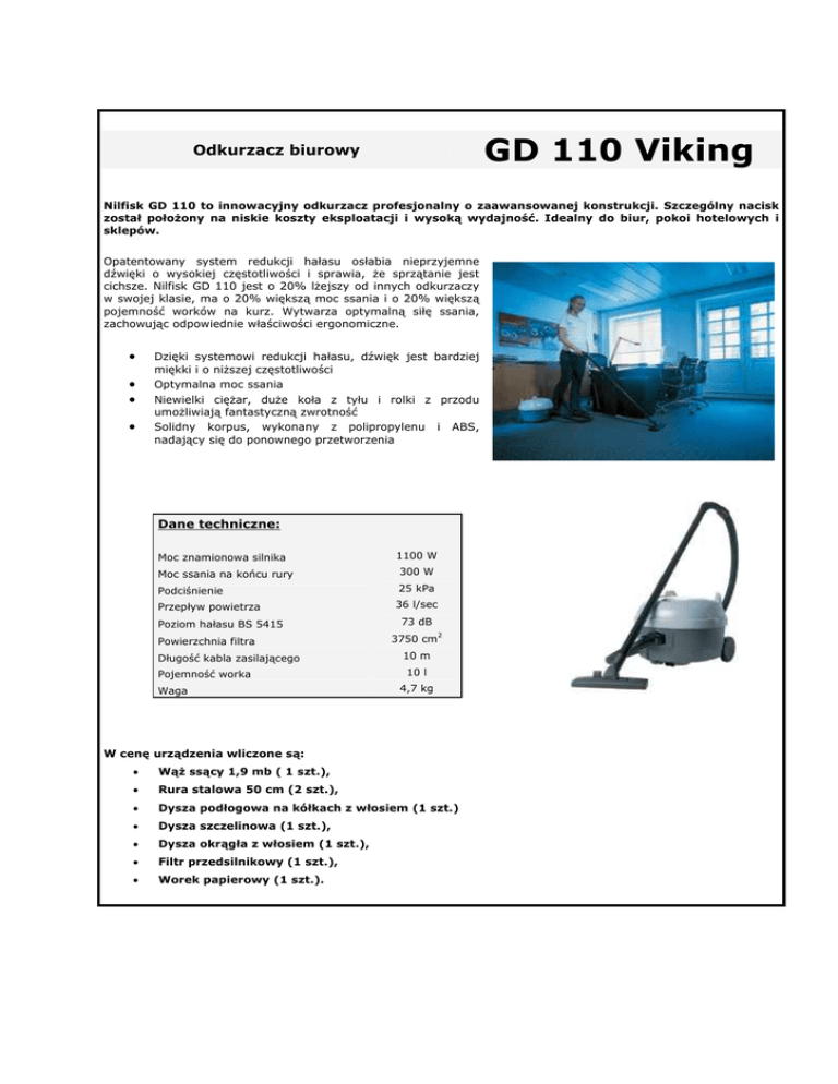 GD 110 Viking Odkurzacz biurowy Nilfisk GD 110 to innowacyjny odkurzacz profesjonalny o zaawansowanej konstrukcji. Szczególny nacisk został położony na niskie koszty eksploatacji i wysoką wydajność. Idealny do biur, pokoi hotelowych i sklepów. Opatentowany system redukcji hałasu osłabia nieprzyjemne dźwięki o wysokiej częstotliwości i sprawia, że sprzątanie jest cichsze. Nilfisk GD 110 jest o 20% lżejszy od innych odkurzaczy w swojej klasie, ma o 20% większą moc ssania i o 20% większą pojemność worków na kurz. Wytwarza optymalną siłę ssania, zachowując odpowiednie właściwości ergonomiczne. • • • • Dzięki systemowi redukcji hałasu, dźwięk jest bardziej miękki i o niższej częstotliwości Optymalna moc ssania Niewielki ciężar, duże koła z tyłu i rolki z przodu umożliwiają fantastyczną zwrotność Solidny korpus, wykonany z polipropylenu i ABS, nadający się do ponownego przetworzenia Dane techniczne: Moc znamionowa silnika 1100 W Moc ssania na końcu rury 300 W Podciśnienie 25 kPa Przepływ powietrza 36 l/sec Poziom hałasu BS 5415 Powierzchnia filtra Długość kabla zasilającego Pojemność worka Waga 73 dB 3750 cm2 10 m 10 l 4,7 kg W cenę urządzenia wliczone są: • Wąż ssący 1,9 mb ( 1 szt.), • Rura stalowa 50 cm (2 szt.), • Dysza podłogowa na kółkach z włosiem (1 szt.) • Dysza szczelinowa (1 szt.), • Dysza okrągła z włosiem (1 szt.), • Filtr przedsilnikowy (1 szt.), • Worek papierowy (1 szt.).