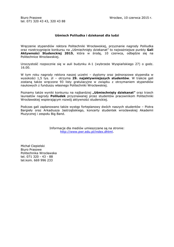 Biuro Prasowe Wrocław, 10 czerwca 2015 r. tel. 071 320 43 43, 320