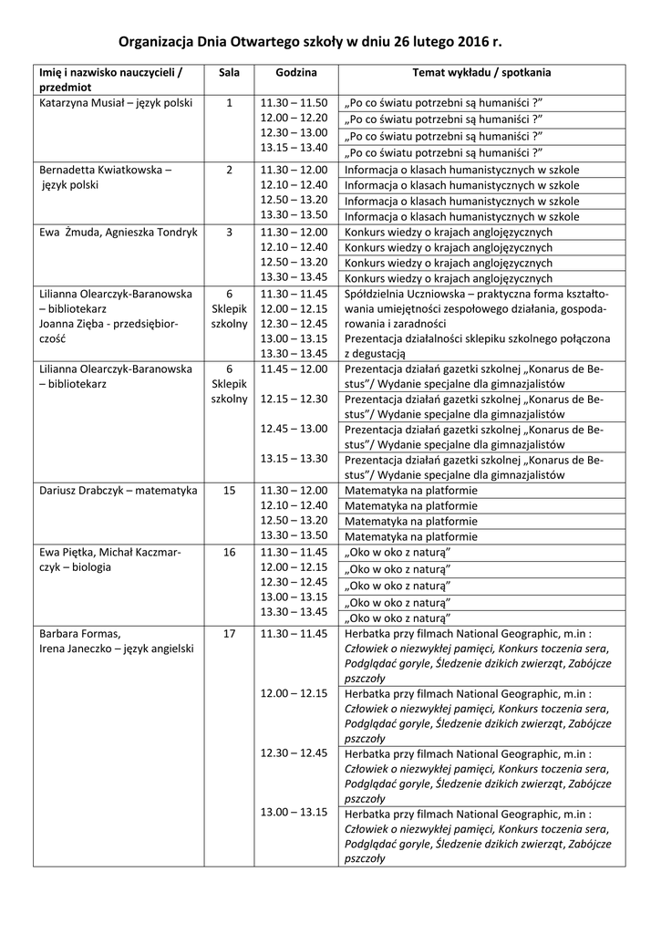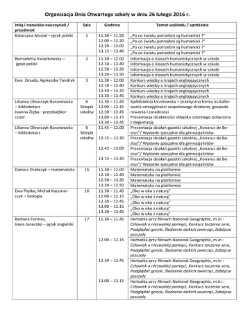 Organizacja Dnia Otwartego szkoły w dniu 26 lutego 2016 r. Imię i nazwisko nauczycieli / przedmiot Katarzyna Musiał – język polski Sala Godzina 1 11.30 – 11.50 12.00 – 12.20 12.30 – 13.00 13.15 – 13.40 Bernadetta Kwiatkowska – język polski 2 Ewa Żmuda, Agnieszka Tondryk 3 Lilianna Olearczyk-Baranowska – bibliotekarz Joanna Zięba - przedsiębiorczość 6 Sklepik szkolny Lilianna Olearczyk-Baranowska – bibliotekarz 6 Sklepik szkolny 11.30 – 12.00 12.10 – 12.40 12.50 – 13.20 13.30 – 13.50 11.30 – 12.00 12.10 – 12.40 12.50 – 13.20 13.30 – 13.45 11.30 – 11.45 12.00 – 12.15 12.30 – 12.45 13.00 – 13.15 13.30 – 13.45 11.45 – 12.00 12.15 – 12.30 12.45 – 13.00 13.15 – 13.30 Dariusz Drabczyk – matematyka 15 Ewa Piętka, Michał Kaczmarczyk – biologia 16 11.30 – 12.00 12.10 – 12.40 12.50 – 13.20 13.30 – 13.50 11.30 – 11.45 12.00 – 12.15 12.30 – 12.45 13.00 – 13.15 13.30 – 13.45 Barbara Formas, Irena Janeczko – język angielski 17 11.30 – 11.45 12.00 – 12.15 12.30 – 12.45 13.00 – 13.15 Temat wykładu / spotkania „Po co światu potrzebni są humaniści ?” „Po co światu potrzebni są humaniści ?” „Po co światu potrzebni są humaniści ?” „Po co światu potrzebni są humaniści ?” Informacja o klasach humanistycznych w szkole Informacja o klasach humanistycznych w szkole Informacja o klasach humanistycznych w szkole Informacja o klasach humanistycznych w szkole Konkurs wiedzy o krajach anglojęzycznych Konkurs wiedzy o krajach anglojęzycznych Konkurs wiedzy o krajach anglojęzycznych Konkurs wiedzy o krajach anglojęzycznych Spółdzielnia Uczniowska – praktyczna forma kształtowania umiejętności zespołowego działania, gospodarowania i zaradności Prezentacja działalności sklepiku szkolnego połączona z degustacją Prezentacja działań gazetki szkolnej „Konarus de Bestus”/ Wydanie specjalne dla gimnazjalistów Prezentacja działań gazetki szkolnej „Konarus de Bestus”/ Wydanie specjalne dla gimnazjalistów Prezentacja działań gazetki szkolnej „Konarus de Bestus”/ Wydanie specjalne dla gimnazjalistów Prezentacja działań gazetki szkolnej „Konarus de Bestus”/ Wydanie specjalne dla gimnazjalistów Matematyka na platformie Matematyka na platformie Matematyka na platformie Matematyka na platformie „Oko w oko z naturą” „Oko w oko z naturą” „Oko w oko z naturą” „Oko w oko z naturą” „Oko w oko z naturą” Herbatka przy filmach National Geographic, m.in : Człowiek o niezwykłej pamięci, Konkurs toczenia sera, Podglądać goryle, Śledzenie dzikich zwierząt, Zabójcze pszczoły Herbatka przy filmach National Geographic, m.in : Człowiek o niezwykłej pamięci, Konkurs toczenia sera, Podglądać goryle, Śledzenie dzikich zwierząt, Zabójcze pszczoły Herbatka przy filmach National Geographic, m.in : Człowiek o niezwykłej pamięci, Konkurs toczenia sera, Podglądać goryle, Śledzenie dzikich zwierząt, Zabójcze pszczoły Herbatka przy filmach National Geographic, m.in : Człowiek o niezwykłej pamięci, Konkurs toczenia sera, Podglądać goryle, Śledzenie dzikich zwierząt, Zabójcze pszczoły 13.30 – 13.45 Piotr Pyrdoł – matematyka 18 11.30 – 12.00 12.10 – 12.40 12.50 – 13.20 13.30 – 13.50 Olga Jarubasz – Kloc – język angielski 28 11.30 – 11.45 12.00 – 12.15 12.30 – 12.45 13.00 – 13.15 13.30 – 13.45 Jerzy Majkut – geografia 29 Danuta Kowalik – język francuski, język hiszpański 30 11.30 – 12.00 12.10 – 12.40 12.50 – 13.20 13.30 – 13.45 11.30 – 12.00 12.10 – 12.40 12.50 – 13.20 13.30 – 13.45 Sławomir Morys – fizyka, informatyka 31 Marta Królikowska – Hardek – język niemiecki Jolanta i Witold Pająk – matematyka 34 Marta Drabczyk – język francuski 40b Elżbieta Tymińska, Iwona Grunwald, Sławomir Podgórski – historia, wiedza o społeczeństwie Janusz Toczek – język polski 41 Joanna Formas – j. polski 44 Bogumiła Bugajska – j. niemiecki 45 40 11.30 – 12.00 12.10 – 12.40 12.50 – 13.20 13.30 – 13.45 12.00 – 12.50 13.00 – 13.50 11.30 – 12.00 12.10 – 12.40 12.50 – 13.20 13.30 – 13.50 11.30 – 12.00 12.10 – 12.40 12.50 – 13.20 13.30 – 13.45 11.30 – 12.00 12.50 – 13.20 42 11.30 – 12.00 12.10 – 12.40 12.50 – 13.20 13.30 – 13.45 11.30 – 11.50 12.00 – 12.20 13.00 - 13.20 13.30 – 13.50 11.30 – 12.00 12.10 – 12.40 12.50 – 13.20 13.30 – 13.45 Herbatka przy filmach National Geographic, m.in : Człowiek o niezwykłej pamięci, Konkurs toczenia sera, Podglądać goryle, Śledzenie dzikich zwierząt, Zabójcze pszczoły „ Czy pieniądze mogą zabić?” „ Czy pieniądze mogą zabić?” „ Czy pieniądze mogą zabić?” „ Czy pieniądze mogą zabić?” Poznajmy się – zajęcia w laboratorium językowym Poznajmy się – zajęcia w laboratorium językowym Poznajmy się – zajęcia w laboratorium językowym Poznajmy się – zajęcia w laboratorium językowym Poznajmy się – zajęcia w laboratorium językowym Quiz geograficzny dla gimnazjalistów Quiz geograficzny dla gimnazjalistów Quiz geograficzny dla gimnazjalistów Quiz geograficzny dla gimnazjalistów „500 mln. ludzi na świecie mówi w j. hiszpańskim. A Ty?” „500 mln. ludzi na świecie mówi w j. hiszpańskim. A Ty?” „500 mln. ludzi na świecie mówi w j. hiszpańskim. A Ty?” „500 mln. ludzi na świecie mówi w j. hiszpańskim. A Ty?” Fizyczne zjawiska z daleka i bliska Fizyczne zjawiska z daleka i bliska Fizyczne zjawiska z daleka i bliska Fizyczne zjawiska z daleka i bliska Quiz o krajach niemieckojęzycznych Quiz o krajach niemieckojęzycznych „ W naszej szkole był rekord Guinnessa” „ W naszej szkole był rekord Guinnessa” „ W naszej szkole był rekord Guinnessa” „ W naszej szkole był rekord Guinnessa” Śniadanie po francusku Śniadanie po francusku Śniadanie po francusku Śniadanie po francusku Konkurs „Bohaterowie Naszej Szko