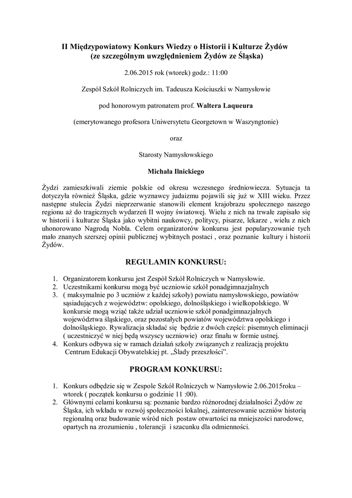 II Międzypowiatowy Konkurs Wiedzy o Historii i Kulturze Żydów (ze szczególnym uwzględnieniem Żydów ze Śląska) 2.06.2015 rok (wtorek) godz.: 11:00 Zespół Szkół Rolniczych im. Tadeusza Kościuszki w Namysłowie pod honorowym patronatem prof. Waltera Laqueura (emerytowanego profesora Uniwersytetu Georgetown w Waszyngtonie) oraz Starosty Namysłowskiego Michała Ilnickiego Żydzi zamieszkiwali ziemie polskie od okresu wczesnego średniowiecza. Sytuacja ta dotyczyła również Śląska, gdzie wyznawcy judaizmu pojawili się już w XIII wieku. Przez następne stulecia Żydzi nieprzerwanie stanowili element krajobrazu społecznego naszego regionu aż do tragicznych wydarzeń II wojny światowej. Wielu z nich na trwałe zapisało się w historii i kulturze Śląska jako wybitni naukowcy, politycy, pisarze, lekarze , wielu z nich uhonorowano Nagrodą Nobla. Celem organizatorów konkursu jest popularyzowanie tych mało znanych szerszej opinii publicznej wybitnych postaci , oraz poznanie kultury i historii Żydów. REGULAMIN KONKURSU: 1. Organizatorem konkursu jest Zespół Szkół Rolniczych w Namysłowie. 2. Uczestnikami konkursu mogą być uczniowie szkół ponadgimnazjalnych 3. ( maksymalnie po 3 uczniów z każdej szkoły) powiatu namysłowskiego, powiatów sąsiadujących z województw: opolskiego, dolnośląskiego i wielkopolskiego. W konkursie mogą wziąć także udział uczniowie szkół ponadgimnazjalnych województwa śląskiego, oraz pozostałych powiatów województwa opolskiego i dolnośląskiego. Rywalizacja składać się będzie z dwóch części: pisemnych eliminacji ( uczestniczyć w niej będą wszyscy uczniowie) oraz finału w formie ustnej. 4. Konkurs odbywa się w ramach działań szkoły związanych z realizacją projektu Centrum Edukacji Obywatelskiej pt. „Ślady przeszłości”. PROGRAM KONKURSU: 1. Konkurs odbędzie się w Zespole Szkół Rolniczych w Namysłowie 2.06.2015roku – wtorek ( początek konkursu o godzinie 11 :00). 2. Głównymi celami konkursu są: poznanie bardzo różnorodnej działalności Żydów ze Śląska, ich wkładu w rozwój społeczności lokalnej, zainteresowanie uczniów historią regionalną oraz budowanie wśród nich postaw otwartości na mniejszości narodowe, opartych na zrozumieniu , tolerancji i szacunku dla odmienności. TERMINARZ KONKURSU: 1. Zgłoszenia uczestników ( nazwa szkoły, imiona i nazwiska uczniów, personalia opiekuna) należy przesłać na adres mailowy organizatora - ZSR W Namysłowie do 27 maja 2015 roku ( środa) : [email protected] 2. Adres do korespondencji : Zespół Szkół Rolniczych im. Tadeusza Kościuszki w Namysłowie, ul. Pułaskiego 3 , 46-100 Namysłów tel. (77) 410-04-32 z dopiskiem : Konkurs o Historii i Kulturze Żydów. 3. Osobami odpowiedzialnymi za przeprowadzenia konkursu są : mgr Andrzej Michta i mgr Tomasz Soja. . LITERATURA: 1. Borkowski Maciej, Kirmiel Andrzej, Włodarczyk Tamara, Śladami Żydów- Dolny Śląsk, Opolszczyzna, Ziemia Lubuska, Warszawa 2008. 2. Greiner Piotr, Nobliści śląscy, Gliwice 1999.(tylko nobliści wyznania mojżeszowego: K. Bloch, M. Born, P.Ehrlich, F. Haber, R. Selten, O. Stern,). 3. Łagiewski Maciej, Macewy mówią, Wrocław 1991. 4. Zestaw pytań dotyczących konkursu wraz z odpowiedziami ze strony ZSR w Namysłowie: http://www.nam.home.pl/zsr/index.php ( pytania i odpowiedzi znajdują się poniżej) Serdecznie zapraszamy ! Pytania i odpowiedzi do II Międzypowiatowego Konkursu o Kulturze i Historii Żydów Uwaga: z książki Macieja Borkowskiego, Andrzeja Kirmiela i Tamary Włodarczyk „Śladami Żydów: Dolny Śląsk, Opolszczyzna, Ziemia Lubuska” prosimy o przygotowanie uczniów jedynie z historii Żydów z następujących miejscowości: Brzeg, Kluczbork, Miejsce, Namysłów, Oleśnica, Oława, Opole, Pokój, Wołczyn, Wrocław.( oraz ze wstępu i słownika na końcu książki) 1. Jaką nazwę nosi Święto Pojednania? 2. Jak nazywa się żydowski siedmioramienny świecznik? 3. Rytualny obrzęd inicjacji, któremu poddawani są żydowscy chłopcy powyżej trzynastego roku życia to ................................................................ 4. Autor „Sztukmistrza z Lublina”, laureat literackiej Nagrody Nobla piszący w języku jidisz? 5. Wielki skrzypek wirtuoz i kompozytor żyjący w latach 1835 – 1880? 6. Jaki tytuł nosi film oparty na dramatycznych przeżyciach Władysława Szpilmana w latach drugiej wojny światowej? 7. Żydowski Nowy Rok to święto o nazwie .................... 8. Pierwszym Żydem, który pozostawił relację po pobycie w Polsce Mieszka I latem 965 lub 966 roku był .................................... 9. Pierwszy przywilej zwany statutem kaliskim nadał Żydom w 1264 roku książę ................. 10. W 1579 roku Stefan Batory powołał do życia centralną reprezentację Żydów Korony i Litwy. Był to .................................................. 11. Jak nazywał się mistyczny ruch powstały wśród Żydów polskich w XVIII wieku stworzony przez Izraela ben Elia? 12. Na jakie dwa odłamy dzieliła się ludność żydowska w Europie? 13. Jak nazywał się język Żydów aszkenazyjskich? 14. Jak nazywał się wielki pisarz żydowski urodzony w Kutnie żyjący w latach 1880 1957? 15. Był prototypem postaci Jankiela z „Pana Tadeusza”, cymbalistą, niezrównanym wykonawcą mazurków i polonezów. 16. Bruno Schultz (1892 – 1942) malarz i pisarz zamordowany przez hitlerowców w getcie w Drohobyczu był autorem dwóch słynnych książek. Wymień tytuł jednej z nich. 17. Czym jest aron ha – kodesz? 18. W kwietniu bieżącego roku obchodzono uroczyście rocznicę powstania w getcie warszawskim. Która to rocznica? 19. Jak nazywa się świątynia żydowska? 20. Profesor Paweł Śpiewak stoi na czele instytucji zajmującej się historią Żydów w Polsce, zwłaszcza okresem zagłady przez hitlerowskie Niemcy (1939-1945). Jak nazywa się ta instytucja i gdzie znajduje się jej siedziba? 21. Jaki dz