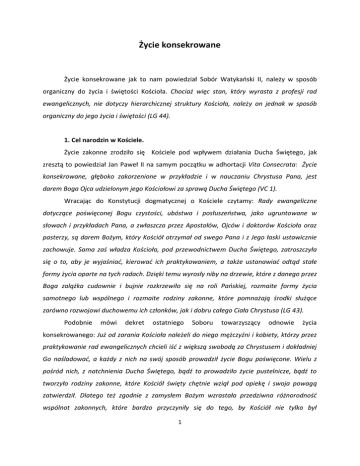 Życie konsekrowane Życie konsekrowane jak to nam powiedział Sobór Watykański II, należy w sposób organiczny do życia i świętości Kościoła. Chociaż więc stan, który wyrasta z profesji rad ewangelicznych, nie dotyczy hierarchicznej struktury Kościoła, należy on jednak w sposób organiczny do jego życia i świętości (LG 44). 1. Cel narodzin w Kościele. Życie zakonne zrodziło się Kościele pod wpływem działania Ducha Świętego, jak zresztą to powiedział Jan Paweł II na samym początku w adhortacji Vita Consecrata: Życie konsekrowane, głęboko zakorzenione w przykładzie i w nauczaniu Chrystusa Pana, jest darem Boga Ojca udzielonym jego Kościołowi za sprawą Ducha Świętego (VC 1). Wracając do Konstytucji dogmatycznej o Kościele czytamy: Rady ewangeliczne dotyczące poświęconej Bogu czystości, ubóstwa i posłuszeństwa, jako ugruntowane w słowach i przykładach Pana, a zwłaszcza przez Apostołów, Ojców i doktorów Kościoła oraz pasterzy, są darem Bożym, który Kościół otrzymał od swego Pana i z Jego łaski ustawicznie zachowuje. Sama zaś władza Kościoła, pod przewodnictwem Ducha Świętego, zatroszczyła się o to, aby je wyjaśniać, kierować ich praktykowaniem, a także ustanawiać odtąd stałe formy życia oparte na tych radach. Dzięki temu wyrosły niby na drzewie, które z danego przez Boga zalążka cudownie i bujnie rozkrzewiło się na roli Pańskiej, rozmaite formy życia samotnego lub wspólnego i rozmaite rodziny zakonne, które pomnażają środki służące zarówno rozwojowi duchowemu ich członków, jak i dobru całego Ciała Chrystusa (LG 43). Podobnie mówi dekret ostatniego Soboru towarzyszący odnowie życia konsekrowanego: Już od zarania Kościoła należeli do niego mężczyźni i kobiety, którzy przez praktykowanie rad ewangelicznych chcieli iść z większą swobodą za Chrystusem i dokładniej Go naśladować, a każdy z nich na swój sposób prowadził życie Bogu poświęcone. Wielu z pośród nich, z natchnienia Ducha Świętego, bądź to prowadziło życie pustelnicze, bądź to tworzyło rodziny zakonne, które Kościół święty chętnie wziął pod opiekę i swoja powagą zatwierdził. Dlatego też zgodnie z zamysłem Bożym wzrastała przedziwna różnorodność wspólnot zakonnych, które bardzo przyczyniły się do tego, by Kościół nie tylko był 1 przysposobiony do każdego dobrego czynu (por. 2 Tm 3,17), i gotowy do wykonywania posługi dla budowania Ciała Chrystusowego (por. Ef 4,12), lecz także, by okazał się przyozdobiony różnorakimi darami swych dzieci, jak oblubienica zdobna w klejnoty dla swego męża (por. Ap 21,2), i by przez niego stała się jawna wieloraka w przejawach mądrość Boga (por. Ef 3,10) ( PC 1). Papież Jan Paweł II w adhortacji Vita Consecrata także nawiązując do Konstytucji Dogmatycznej o Kościele Soboru Watykańskiego II pisze: Jakże nie wspomnieć z wdzięcznością wobec Ducha Świętego o wielości historycznych form życia konsekrowanego przez niego wzbudzanych i nadal obecnych w tkance Kościoła. Można je porównać do drzewa o wielu gałęziach, które tkwi korzeniami w Ewangelii i przynosi obfite owoce w każdej epoce życia Kościoła. Jakież to niezwykłe bogactwo! Ja sam na zakończenie Synodu pragnąłem zwrócić uwagę na ten stały element historii Kościoła: na rzeszę założycieli i założycielek, świętych mężczyzn i kobiet, którzy wybrali Chrystusa, idąc droga radykalizmu ewangelicznego i braterskiej służby – przede wszystkim ubogim i opuszczonym. Właśnie ta służba pozwala dostrzec szczególnie wyraziście, że życie konsekrowane objawia jedność przykazania miłości – nierozerwalną więź między miłością Boga a miłością bliźniego VC 5). Z kolei Jan Paweł II dotykając genezy życia konsekrowanego mówi o jego początkach na Wschodzie i Zachodzie: Już w pierwszych wiekach Kościoła byli ludzie, którzy czuli się powołani do naśladowania Słowa Wcielonego, które przyjęło postać sługi, i postanowili pójść za Nim, wypełniając w sposób swoisty i radykalny – przez profesję życia monastycznego – wymogi płynące z chrzcielnego uczestnictwa w paschalnej tajemnicy Jego śmierci i zmartwychwstania. W ten sposób stali się „niosącymi Krzyż” (staurophoroi) i starali się być „niosącymi Ducha” (pneumatophoroi) – ludźmi prawdziwie duchowymi, będącymi ukrytym zaczynem historii przez modlitwę uwielbienia i nieustanne orędownictwo, udzielanie porad ascetycznych i dzieła miłosierdzia. (…) Także na Zachodzie od pierwszych stuleci istnienia Kościoła praktykowano życie monastyczne i powstawały bardzo różnorodne jego formy, należące zarówno do tradycji cenobickiej, jak i eremickiej. Monastycyzm w swojej obecnej formie, odwołującej się zwłaszcza do św. Benedykta, jest spadkobiercą wielkiej rzeszy mężczyzn i kobiet, którzy porzuciwszy życie w świecie, szukali Boga i Jemu się poświęcili, niczego nie przedkładając nad miłość Chrystusa (VC 6). 2 Prefekt Kongregacji ds. życia zakonnego w swoim przemówieniu do Wyższych Przełożonych zakonnych powiedział że życie zakonne wywodzi się ze świętości naszych Założycieli. A więc początek życia konsekrowanego to nic innego jak świętość tzn. pełnia życia w Chrystusie Jezusie. Założyciele mieli Bożą intuicję chcąc odpowiedzieć na konkretne potrzeby Kościoła. Początek zakonów to świętość, ale konsekwentna w codziennej realizacji apostolskiego posłannictwa (por. Abp Rode Frnac, Rzym 11.05.2004r.). 2. Na czym polega jego istota? Istotowe elementy życia konsekrowanego. Istotę życia konsekrowanego dobrze określa Konstytucja Dogmatyczna o Kościele Soboru Watykańskiego II mówiąc: Przez śluby albo inne święte więzy, natura zbliżone do ślubów, którymi wierny zobowiązuje się do praktykowania trzech wymienionych rad ewangelicznych, oddaje się on całkowicie na własno