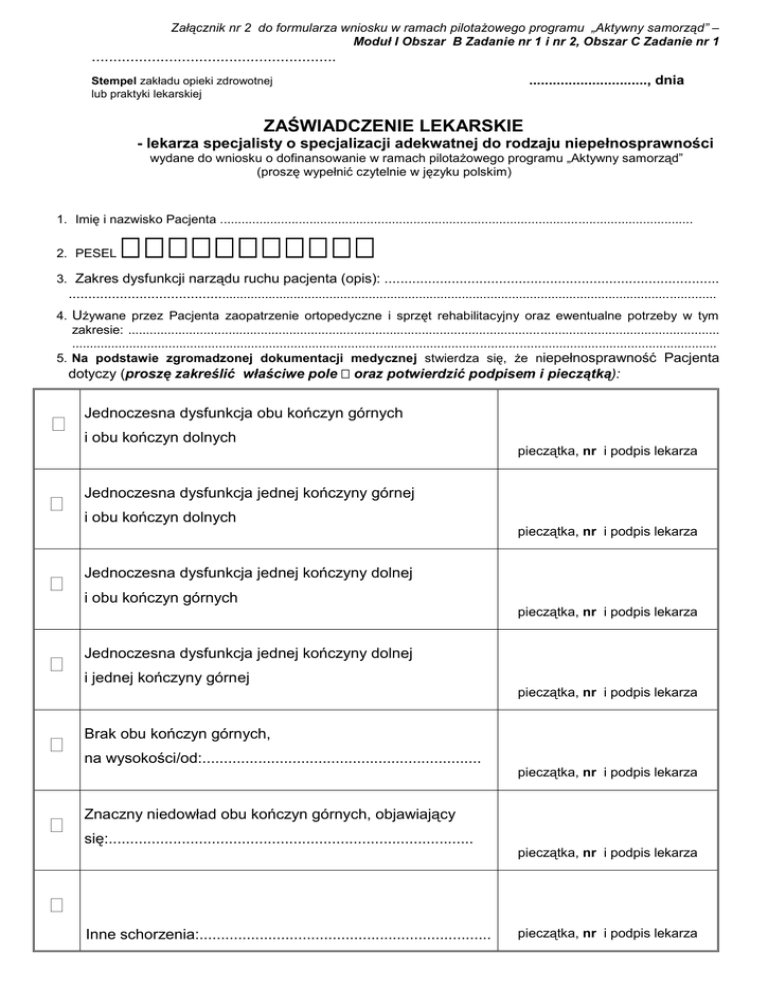 Załącznik nr 2 do formularza wniosku w ramach pilotażowego programu „Aktywny samorząd” – Moduł I Obszar B Zadanie nr 1 i nr 2, Obszar C Zadanie nr 1 ......................................................... Stempel zakładu opieki zdrowotnej lub praktyki lekarskiej .............................., dnia ZAŚWIADCZENIE LEKARSKIE - lekarza specjalisty o specjalizacji adekwatnej do rodzaju niepełnosprawności wydane do wniosku o dofinansowanie w ramach pilotażowego programu „Aktywny samorząd” (proszę wypełnić czytelnie w języku polskim) 1. Imię i nazwisko Pacjenta .................................................................................................................................... 2. PESEL 3. Zakres dysfunkcji narządu ruchu pacjenta (opis): ..................................................................................... ................................................................................................................................................................................. 4. Używane przez Pacjenta zaopatrzenie ortopedyczne i sprzęt rehabilitacyjny oraz ewentualne potrzeby w tym zakresie: ..................................................................................................................................................................... .................................................................................................................................................................................... 5. Na podstawie zgromadzonej dokumentacji medycznej stwierdza się, że niepełnosprawność Pacjenta dotyczy (proszę zakreślić właściwe pole oraz potwierdzić podpisem i pieczątką): Jednoczesna dysfunkcja obu kończyn górnych i obu kończyn dolnych pieczątka, nr i podpis lekarza Jednoczesna dysfunkcja jednej kończyny górnej i obu kończyn dolnych pieczątka, nr i podpis lekarza Jednoczesna dysfunkcja jednej kończyny dolnej i obu kończyn górnych pieczątka, nr i podpis lekarza Jednoczesna dysfunkcja jednej kończyny dolnej i jednej kończyny górnej pieczątka, nr i podpis lekarza Brak obu kończyn górnych, na wysokości/od:................................................................. pieczątka, nr i podpis lekarza Znaczny niedowład obu kończyn górnych, objawiający się:..................................................................................... pieczątka, nr i podpis lekarza Inne schorzenia:.................................................................... pieczątka, nr i podpis lekarza 6. Ponadto (pole obowiązkowe w przypadku Pacjenta ubiegającego się o dofinansowanie w ramach obszaru C programu) - na podstawie zgromadzonej dokumentacji medycznej stwierdza się, że: proszę zakreślić właściwe pola 1. Pacjent może poruszać się na wózku inwalidzkim o napędzie ręcznym: tak nie 2. Korzystanie z wózka o napędzie elektrycznym jest niewskazane, gdyż może spowodować wstrzymanie lub pogorszenie procesu rehabilitacji lub wpłynie niekorzystnie na sprawność kończyn górnych: tak nie 3. Przeciwwskazania do korzystania z wózka o napędzie elektrycznym (np. utraty przytomności, epilepsja): .................................................................. ............................................................................................................................ ............................................ ............................... brak przeciwwskazań pieczątka, nr i podpis lekarza Dotyczy wyłącznie Wnioskodawców ubiegających się o zwiększenie kwoty dofinansowania na zakup wózka inwalidzkiego o napędzie elektrycznym Pacjent z uwagi na ograniczenia funkcjonalne, stan i zakres dysfunkcji narządu ruchu powodującej niepełnosprawność wymaga zakupu wózka inwalidzkiego o napędzie elektrycznym z ponadstandardowym wyposażeniem, w tym: (proszę zakreślić właściwe pola ) niestandardowe sterowniki umożliwiające sterowanie wózkiem za pomocą jedynie władnych części ciała jak np.: ręki, palca, brody, stopy, warg lub wdechu i wydechu powietrza itp. urządzenia umożliwiające prowadzenie wózka także przez osobę towarzyszącą (hamulec, sterownik itp.) niestandardowe siedzisko (np. z windą podnoszącą, rehabilitacyjne, zapewniające maksymalną stabilizację, przeciwodleżynowe, itp.) specjalne, regulowane (w tym elektrycznie i w różnych płaszczyznach): podnóżki, podłokietniki lub oparcia nadgarstków kliny zapobiegające zsuwaniu się Pacjenta z wózka lub podpórki boczne, peloty piersiowe zagłówek stabilizujący głowę i szyję (w kształcie litery U) specjalne pasy bezpieczeństwa (np. dwupunktowe zapinane na biodrach, czteropunktowe) taki sposób, aby wózek był indywidualnie dopasowany do sylwetki Pacjenta (np. w przypadku niestandardowego wzrostu czy wagi Pacjenta) inne elementy i urządzenia (np. umożliwiające podłączenia joysticka wózka do komputera i posługiwanie się nim jak myszką), jakie: ........................................, dnia .............. (miejscowość ) (data) ............................................... pieczątka, nr i podpis lekarza
