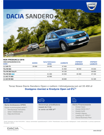 2 ROK PRODUKCJI 2016 CENA KATALOGOWA W ZŁ SILNIK ACCESS Seria limitowana OPEN LAUREATE STEPWAY AMBIANCE STEPWAY LAUREATE 1.2 16V 75 29 900 34 450 37 450 TCe 90 S&S - - 41 950 40 950 44 650 TCe 90 S&S Easy-R - - 44 150 - 46 850 TCe 90 S&S - 41 450 44 450 43 450 47 150 1.5 dCi 75 S&S - 42 900 - - - 1.5 dCi 90 S&S - - 48 400 - 52 100 Teraz Nowa Dacia Sandero Open z radiem i klimatyzacją już od 35 450 zł Dostępna również w Kredycie Open od 0%(1) Seria limitowana OPEN cenie(2): Opcje w promocyjnej o klimatyzacja manualna o lakier metalizowany o felgi aluminiowe Gwarancja przedłużona nawet do 5 lat w cenie od 499 zł(3) Dacia Finansowanie o o o o o o Kredyt Open Kredyt 50/50 0%(4) Kredyt 4x25 Kredyt Ulgowy Leasing od 102%(5) Dacia Business Plan Cennik obowiązuje od dnia 04.03.2016r. i dotyczy samochodów wyprodukowanych w 2016r. Prezentowane ceny są cenami katalogowymi. Liczba samochodów w promocji ograniczona. Szczegóły w salonie. CENA KATALOGOWA 1.2 16V 75 TCe 90 S&S LPG 1.5 dCi 75 S&S 34 450 zł 41 450 zł 42 900 zł PODSTAWOWE WYPOSAŻENIE SERII LIMITOWANEJ OPEN = ACCES + Zderzaki w kolorze nadwozia Światła przeciwmgłowe Zewnętrzne słupki drzwi w kolorze czarnym Centralny zamek drzwi zdalnie sterowany falami radiowymi Elektrycznie podnoszone szyby przednie Dacia Plug&Radio (radioodtwarzacz z dużym wyświetlaczem, CD MP3, Bluetooth®, wejście USB/jack w panelu radia, pilot do sterowania przy kierownicy), Chromowane obramowania dysz nawiewu powietrza, zegarów i loga w kierownicy Oświetlenie bagażnika Badge na drzwiach przednich WYPOSAŻENIE OPCJONALNE SERII LIMITOWANEJ OPEN: Oferowane w promocyjnej cenie: o Klimatyzacja manualna o Obręcze kół ze stopu metali lekkich 15” wzór AQUILA o Nowy metalizowany kolor nadwozia, dostępny wyłącznie dla serii limitowanej OPEN - Brązowy Tourmaline Pozostałe opcje: o Koło zapasowe* o Metalizowane kolory nadwozia (inne niż Brązowy Tourmaline) * Niedostępne dla wersji z fabryczną instalacją LPG. CENA KATALOGOWA STEPWAY AMBIANCE TCe 90 S&S TCe 90 S&S LPG 40 950 zł 43 450 zł STEPWAY LAUREATE TCe 90 S&S TCe 90 S&S Easy-R TCe 90 S&S 1.5 dCi 90 S&S 44 650 zł 46 850 zł 47 150 zł 52 100 zł PODSTAWOWE WYPOSAŻENIE WERSJI STEPWAY AMBIANCE = ACCES + • • • • • • • • • • • • • • Dwukolorowe relingi dachowe (kolor czarny / matowy chrom) Przednia i tylna osłona podwozia w kolorze matowego chromu Czarne osłony nadkoli Dwukolorowy zderzak przedni (czarny / w kolorze nadwozia) Zwiększony prześwit Stalowe obręcze kół 16” wzór Oasis Światła przeciwmgłowe Obudowy lusterek bocznych w kolorze nadwozia Naklejki Stepway na przednich drzwiach Specyficzna tapicerka z napisem Stepway na przednich siedzeniach Centralny zamek drzwi zdanie sterowany falami radiowymi Elektrycznie podnoszone szyby przednie Chromowane obramowania dysz nawiewu powietrza, zegarów, loga w kierownicy Oświetlenie bagażnika PODSTAWOWE WYPOSAŻENIE WERSJI STEPWAY LAUREATE = STEPWAY AMBIANCE + • • • • • • • • • • • Elementy osłony chłodnicy w kolorze matowego chromu Lusterka boczne podgrzewane i regulowane elektrycznie Klimatyzacja manualna Dacia Plug&Radio (radioodtwarzacz z dużym wyświetlaczem, CD MP3, Bluetooth ®, wejście USB/jack w panelu radia, pilot do sterowania przy kierownicy)** Komputer pokładowy*** Regulator i ogranicznik prędkości Kierownica i gałka dźwigni zmiany biegów pokryte skórą Kolumna kierownicy regulowana na wysokość Fotel kierowcy z regulacją wysokości Przednie pasy bezpieczeństwa regulowane na wysokość Wewnętrzne uchwyty do zamykania drzwi przednich **Niedostępne menu w języku polskim. ***Niedostępny dla wersji z fabryczną instalacją LPG. ACCEES Seria limitowana OPEN LAUREATE STEPWAY AMBIANCE STEPWAY LAUREATE WYGLĄD ZEWNĘTRZNY Przedni zderza k czarny w kolorze nadwozia w kolorze nadwozia Tyl ny zderza k czarny w kolorze nadwozia Zewnętrzne kl a mi drzwi czarne czarne w kolorze nadwozia w kolorze nadwozia w kolorze nadwozia ● Obudowy zewnętrznych l us terek bocznych Sta l owe obręcze kół 15˝ czarne czarne ● ● dwukolorowy dwukolorowy (czarny / w kolorze (czarny / w kolorze nadwozia) nadwozia) w kolorze w kolorze nadwozia nadwozia czarne czarne w kolorze nadwozia w kolorze nadwozia - ● - - - ● - /- 505 / - - /1 010 - /- - /- Look Stepwa y: przedni a i tyl na os łona podwozi a w kol orze ma towego chromu, dwukol orowe rel i ngi da chowe (cza rne / ma towy chrom), na kl ejki Stepwa y na przedni ch drzwi a ch, cza rne os łony na dkol i , zwi ęks zony prześ wi t - - - ● ● Cza rne obudowy refl ektorów z przodu ● ● ● ● ● Zewnętrzne s łupki drzwi w kol orze cza rnym - ● - - - Sta l owe obręcze kół 16’’ wzór Oa s i s Obręcze kół ze s topu meta l i l ekki ch 15˝ wzór AQUILA /EMPREINTE Ba dge na drzwi a ch przedni ch - ● - - - La ki er meta l i zowa ny (i nny ni ż Brązowy Tourma l i ne) - 1700 1700 1700 1700 La ki er meta l i zowa ny Brązowy TOURMALINE - 850 - - - Ozdobne wykończeni e kons ol i centra l nej czarne czarne szaro-beżowe / błyszczący metal szaro-beżowe / błyszczący metal szaro-beżowe / błyszczący metal Obra mowa ni a na wi ewów czarne chromowane chromowane chromowane chromowane Obra mowa ni a zega rów czarne chromowane chromowane chromowane chromowane Obra mowa ni a chromowa nego l ogo na ki erowni cy czarne chromowane chromowane chromowane chromowane - szaro-beżowa / błyszczący metal szaro-beżowa / błyszczący metal szaro-beżowa / błyszczący metal SIEDZENIA I WYSTRÓJ WNĘTRZA Ws ta wka na ki erowni cy Ki erowni ca i ga łka dźwi gni zmi a ny bi egów pokryte s kórą Wewnętrzne kl a mki drzwi - - 310 - ● czarne czarne czarne czarne czarne Wewnętrzne uchwyty drzwi w kol orze s za ro-beżowym (błys zczący meta l ) - - ● - ● Tyl na ka na pa s kła da na i dzi el ona w ukła dzi e 1/3 - 2/3 ● ● ● ● ● 3 tyl ne za główki (1 ś rodkowy ws uwa ny w opa rci e) 