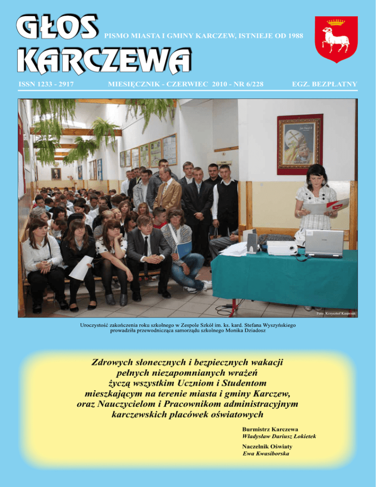 PISMO MIASTA I GMINY KARCZEW, ISTNIEJE OD 1988 ISSN 1233 - 2917 MIESIĘCZNIK - CZERWIEC 2010 - NR 6/228 EGZ. BEZPŁATNY Zdrowych słonecznych i bezpiecznych wakacji pełnych niezapomnianych wrażeń życzą wszystkim Uczniom i Studentom mieszkającym na terenie miasta i gminy Karczew, oraz Nauczycielom i Pracownikom administracyjnym karczewskich placówek oświatowych Burmistrz Karczewa Władysław Dariusz Łokietek Naczelnik Oświaty Ewa Kwasiborska czerwiec 2010 1 Wyborcza statystyka J uż pierwsza tura wyborów prezydenckich wskazała preferencje wyborcze w gminie Karczew. Zgodnie na piątym miejscu znalazł się kandydat ludowców, który zdołał przekonać do siebie zaledwie 187 wyborców (2.33%). Warto zaznaczyć, że Waldemar Pawlak przegrał z Napieralskim we wszystkich obwodach wyborczych. W samym Karczewie Pawlaka wyprzedzili także Andrzej Olechowski oraz Marek Jurek. Ogółem uprawnionych do głosowania było 12884 mieszkańców z czego z wyborczego prawa skorzystało 8107 osób, ważnie oddanych głosów było 8040. Ogólna frekwencja wyniosła 62,92%. Najwyższa frekwencja była w obwodzie wyborczym nr V - 69,48% oraz w obwodzie wyborczym nr IV - 69,17%, oba obwody obejmują osiedle Ługi. Wysoką frekwencję odnotowano w komisji wyborczej działającej w przedszkolu przy ul. Buczka, zgłosiło się tam do wyborów 68,18% uprawnionych do głosowania. Najniższą frekwencję w pierwszej turze wyborów odnotowano w Otwocku Wielkim, ale i tam frekwencja wyniosła 52,9%. W pierwszej turze wyborów w powiecie otwockim frekwencja wyniosła 64,49%, zaś najsłabszy wynik odnotowała gmina Kołbiel (58,02%), najlepszym wynikiem w powiecie mógł pochwalić się Józefów (70.01%). Warto podkreślić bardzo dobrą pracę komisji wyborczych, dzięki czemu pierwsza tura wyborów na terenie gminy Karczew przebiegała sprawnie i bez większych nieporozumień. Jedyne nieporozumienie było spowodowane przez przedstawicieli powiatowych komitetu wyborczego PIS, którzy nie wyposażyli swoich mężów zaufania w odpowiednie dokumenty. Druga tura była już tylko potwierdzeniem wyników z 20 czerwca. Jarosław Kaczyński, przy prawie zerowej kampanii z wcześniejszymi przewidywaniami wygrał kandydat PISu Jarosław Kaczyński. Zebrał on 3903 głosy, co stanowiło 48.54% ważnie oddanych głosów. Na drugim miejscu był Bronisław Komorowski, na którego głosowało 2639 wyborców, czyli 32.82% ważnie oddanych głosów. Przed wyborami zakładano, że na trzecim miejscu w gminie Karczew będzie kandydat PSLu Waldemar Pawlak, ale tak się nie stało. Na trzecim miejscu, zgodnie z publikowanymi sondażami, uplasował się Grzegorz Napieralski z wynikiem 839 głosów czyli 10.44%. Czwartym w kolejności był Janusz Korwin Mikke, na którego głosowało 215 wyborców (2.67%) i dopiero prowadzonej na terenie gminy Karczew przez zwolenników swojego przeciwnika, pokonał Bronisława Komorowskiego dość znacznie zbierając 4685 głosów, gdy kontrkandydat otrzymał poparcie 3252 wyborców. W drugiej turze wyborów frekwencja była jeszcze wyższa niż w turze pierwszej i wyniosła 63,3%. Ponownie w obu obwodach na osiedlu Ługi frekwencja była najwyższa, choć nie tak wysoka jak w turze pierwszej i wyniosła 68,6% w obwodzie IV oraz 68,2% w obwodzie V. Tym razem najniższa frekwencja była w obwodzie VI z siedzibą Komisji Wyborczej w Szkole Podstawowej w Glinkach (54,4%).(red) 2 czerwiec 2010 Zakończenie roku szkolnego W tym roku, w ostatnim dniu szkolnym, towarzyszyliśmy, jako redakcja, uczniom i nauczycielom karczewskiej szkoły średniej. W uroczystości wziął udział Burmistrz Karczewa Władysław Dariusz Łokietek oraz Naczelnik Oświaty Urzędu Miejskiego w Karczewie Ewa Kwasiborska. Ważnym momentem uroczystego zakończenia roku szkolnego, była prezentacja nagrodzonego, w konkursie powiatowym, filmu poświęconego tragedii katyńskiej. Film ten zrealizowały uczennice Liceum Ogólnokształcącego im. ks. kard. Stefana Wyszyńskiego, Paulina Rafał i Monika Dziadosz. Redaktor „Głosu Karczewa” Krzysztof Kasprzak, który jako członek Warszawskiej Rodziny Katyńskiej został po projekcji filmu poproszony o zabranie głosu podkreślił, że o zbrodni katyńskiej pamięć powinna być wieczna, aby podobnych tragedii już na świecie nigdy nie było. Młodzieży oraz nauczycielom, życzenia słonecznych i bezpiecznych wakacji złożył burmistrz Władysław Dariusz Łokietek, podziękował on także gronu nauczycielskiemu oraz dyrekcji szkoły za bardzo dobrą pracę dydaktyczną i wychowawczą. Zgodnie z tradycją, na zakończenie roku szkolnego, najlepsi uczniowie otrzymali nagrody i wyróżnienia. Szczególnymi nagrodami były te, które zostały wręczone za aktywną działalność podczas akcji powodziowych. Taką nagrodę otrzymał między innymi uczeń Dariusz Olszewski. Nagrodę wręczył mu Burmistrz Karczewa. Uroczystość zakończenia roku szkolnego w Zespole Szkół im. ks. kardynała Stefana Wyszyńskiego w Karczewie po raz kolejny pokazała, że szkoła boryka się z pewnymi trudnościami lokalowymi. Brak sali gimnastycznej, gdzie oprócz zajęć wychowania fizycznego mogłyby się odbywać uroczystości szkolne jest dotkliwy. Zgromadzeni na uroczystości zakończenia roku szkolnego uczniowie wypełnili bardzo szczelnie szkolny korytarz znacznie utrudniając wszelką nim komunikację. Szkoła jednak na salę gimnastyczną będzie musiała poczekać, na razie w ramach inwestycji oświatowych wykonywane jest ogrodzenie boiska szkolnego. (red) D wa razy mieszkańcy Gminy Karczew, a wraz z nimi służby miejskie, stawały na wałach wiślanych by bronić dobytku przed niebezpieczeństwem powodzi. Dzisiaj nikt nie jest w stanie podać dokładnie ile osób broniło wiosek nadwiślańskich przed zalaniem, nikt nie robił list obecności, bo przecież i tak wszyscy wiedzieli, że każdy, kto tylko mógł, zgłosił się do akcji ratunkowej. Dzisiaj możemy jedynie policzyć spr