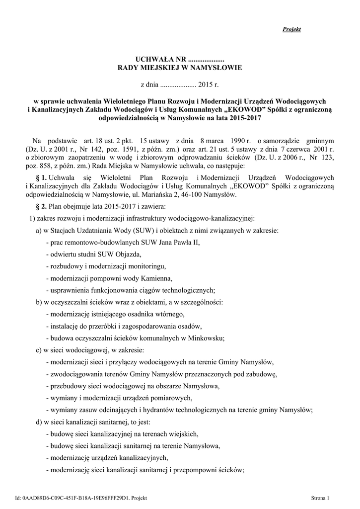 Projekt UCHWAŁA NR .................... RADY MIEJSKIEJ W NAMYSŁOWIE z dnia .................... 2015 r. w sprawie uchwalenia Wieloletniego Planu Rozwoju i Modernizacji Urządzeń Wodociągowych i Kanalizacyjnych Zakładu Wodociągów i Usług Komunalnych „EKOWOD” Spółki z ograniczoną odpowiedzialnością w Namysłowie na lata 2015-2017 Na podstawie art. 18 ust. 2 pkt. 15 ustawy z dnia 8 marca 1990 r. o samorządzie gminnym (Dz. U. z 2001 r., Nr 142, poz. 1591, z późn. zm.) oraz art. 21 ust. 5 ustawy z dnia 7 czerwca 2001 r. o zbiorowym zaopatrzeniu w wodę i zbiorowym odprowadzaniu ścieków (Dz. U. z 2006 r., Nr 123, poz. 858, z późn. zm.) Rada Miejska w Namysłowie uchwala, co następuje: § 1. Uchwala się Wieloletni Plan Rozwoju i Modernizacji Urządzeń Wodociągowych i Kanalizacyjnych dla Zakładu Wodociągów i Usług Komunalnych „EKOWOD” Spółki z ograniczoną odpowiedzialnością w Namysłowie, ul. Mariańska 2, 46-100 Namysłów. § 2. Plan obejmuje lata 2015-2017 i zawiera: 1) zakres rozwoju i modernizacji infrastruktury wodociągowo-kanalizacyjnej: a) w Stacjach Uzdatniania Wody (SUW) i obiektach z nimi związanych w zakresie: - prac remontowo-budowlanych SUW Jana Pawła II, - odwiertu studni SUW Objazda, - rozbudowy i modernizacji monitoringu, - modernizacji pompowni wody Kamienna, - usprawnienia funkcjonowania ciągów technologicznych; b) w oczyszczalni ścieków wraz z obiektami, a w szczególności: - modernizację istniejącego osadnika wtórnego, - instalację do przeróbki i zagospodarowania osadów, - budowa oczyszczalni ścieków komunalnych w Minkowsku; c) w sieci wodociągowej, w zakresie: - modernizacji sieci i przyłączy wodociągowych na terenie Gminy Namysłów, - zwodociągowania terenów Gminy Namysłów przeznaczonych pod zabudowę, - przebudowy sieci wodociągowej na obszarze Namysłowa, - wymiany i modernizacji urządzeń pomiarowych, - wymiany zasuw odcinających i hydrantów technologicznych na terenie gminy Namysłów; d) w sieci kanalizacji sanitarnej, to jest: - budowę sieci kanalizacyjnej na terenach wiejskich, - budowę sieci kanalizacji sanitarnej na terenie Namysłowa, - modernizację urządzeń kanalizacyjnych, - modernizację sieci kanalizacji sanitarnej i przepompowni ścieków; Id: 0AAD89D6-C09C-451F-B18A-19E96FFF29D1. Projekt Strona 1 2) zadania realizowane w zakresie Funduszu Spójności, co do których stanowi się, że: a) w Wieloletnim Planie Rozwoju i Modernizacji Urządzeń Wodociągowych i Kanalizacyjnych cześć zadań została zapisana wariantowo, gdyż mogą zostać zrealizowane w ramach środków pomocowych Funduszu Spójności, b) w ramach Funduszu Spójności realizowana będzie rozbudowa oczyszczalni ścieków oraz budowa sieci kanalizacji sanitarnej na terenie Gminy Namysłów i Gminy Wilków, c) beneficjentem końcowym po zrealizowaniu wyżej wymienionych zadań będzie „EKOWOD” Spółka z o.o. w Namysłowie. § 3. Przedsięwzięcia rozwojowo-modernizacyjne w poszczególnych planowanych nakładów finansowych zawiera załącznik. latach z uwzględnieniem § 4. Wykonanie uchwały powierza się Burmistrzowi Namysłowa. § 5. Traci moc uchwała Nr XV/134/08 Rady Miejskiej w Namysłowie z dnia 14 lutego 2008 roku w sprawie uchwalenia Wieloletniego Planu Rozwoju i Modernizacji Urządzeń Wodociągowych i Urządzeń Kanalizacyjnych Zakładu Wodociągów i Usług Komunalnych „EKOWOD” Spółki z ograniczoną odpowiedzialnością w Namysłowie na lata 2008-2010, zmieniona uchwałą Nr XXV/245/09 Rady Miejskiej w Namysłowie z dnia 5 lutego 2009 r., uchwałą Nr XXX/293/09 Rady Miejskiej w Namysłów z dnia 18 sierpnia 2009 r., uchwałą Nr XXXIV/333/10 Rady Miejskiej w Namysłowie z dnia 28 stycznia 2010 r., uchwałą Nr V/37/11 Rady Miejskiej w Namysłowie z dnia 10 marca 2011 r., uchwałą Nr XII/128/12 Rady Miejskiej w Namysłowie z dnia 1 marca 2012 r., uchwałą Nr XIX/228/13 Rady Miejskiej w Namysłowie z dnia 24 stycznia 2013 r. i uchwałą Nr XXV/312/14 Rady Miejskiej w Namysłowie z dnia 27 marca 2014 r. § 6. Uchwała wchodzi w życie z dniem podjęcia. Przewodniczący Rady Sylwester Zabielny Id: 0AAD89D6-C09C-451F-B18A-19E96FFF29D1. Projekt Strona 2 Załącznik do uchwały Nr ……………….. Rady Miejskiej w Namysłowie z dnia ……………….. r. WIELOLETNI PLAN ROZWOJU I MODERNIZACJI URZĄDZEŃ WODOCIĄGOWYCH I KANALIZACYJNYCH NA LATA 2015-2017 Zakładu Wodociągów i Usług Komunalnych „EKOWOD” Spółka z o.o. ul. Mariańska 2, 46-100 Namysłów Walne Zgromadzenie Wspólników z dnia 15 stycznia 2015 r. Id: 0AAD89D6-C09C-451F-B18A-19E96FFF29D1. Projekt Strona 3 1. INFRASTRUKTURA SYSTEMU ZAOPATRZENIA W WODĘ I ODPROWADZANIA ŚCIEKÓW Zakład Wodociągów i Usług Komunalnych „EKOWOD” Spółka z o.o. świadczy usługi m. in. w zakresie zaopatrzenia w wodę. Działalnością swoją obejmuje obszar gmin Namysłów, Wilków, Domaszowice, Świerczów i Pokój. 1) Stacje Uzdatniania Wody Spółka na terenie gminy Namysłów eksploatuje 10 studni głębinowych, które ujmują wodę podziemną. Proces jej uzdatniania odbywa się na dwóch Stacjach Uzdatniania Wody: a) Stacja Uzdatniania Wody „Jana Pawła II” - woda ujmowana jest w sposób naprzemienny z 7 studni głębinowych. Zawiera ona ponadnormatywne ilości żelaza, zatem wymaga uzdatniania – woda jest napowietrzana i filtrowana na filtrach otwartych, gdzie następuje wytrącanie związków manganu i żelaza. Tak uzdatniona woda gromadzona jest w „małym” zbiorniku, skąd przepompowuje się ją do zbiornika wody czystej i dalej do sieci wodociągowej. Pobór wód podziemnych dla celów zaopatrzenia w wodę miasta Namysłów na ujęciu „Namysłów – ul. Jana Pawła II” za pomocą studni wierconych, oznaczonych numerami 3a, 4a, 5a, 7, 10R, 11R, 12R w ilości: Qmaxrok = 1 174 333 m3/rok, Qśrd = 3440 m3/d (śr. przepustowość Stacji Uzdatniania Wody – 3440 m3/d), Qmaxh = 266 m3/h. Wydajność studni z ujęcia SUW 