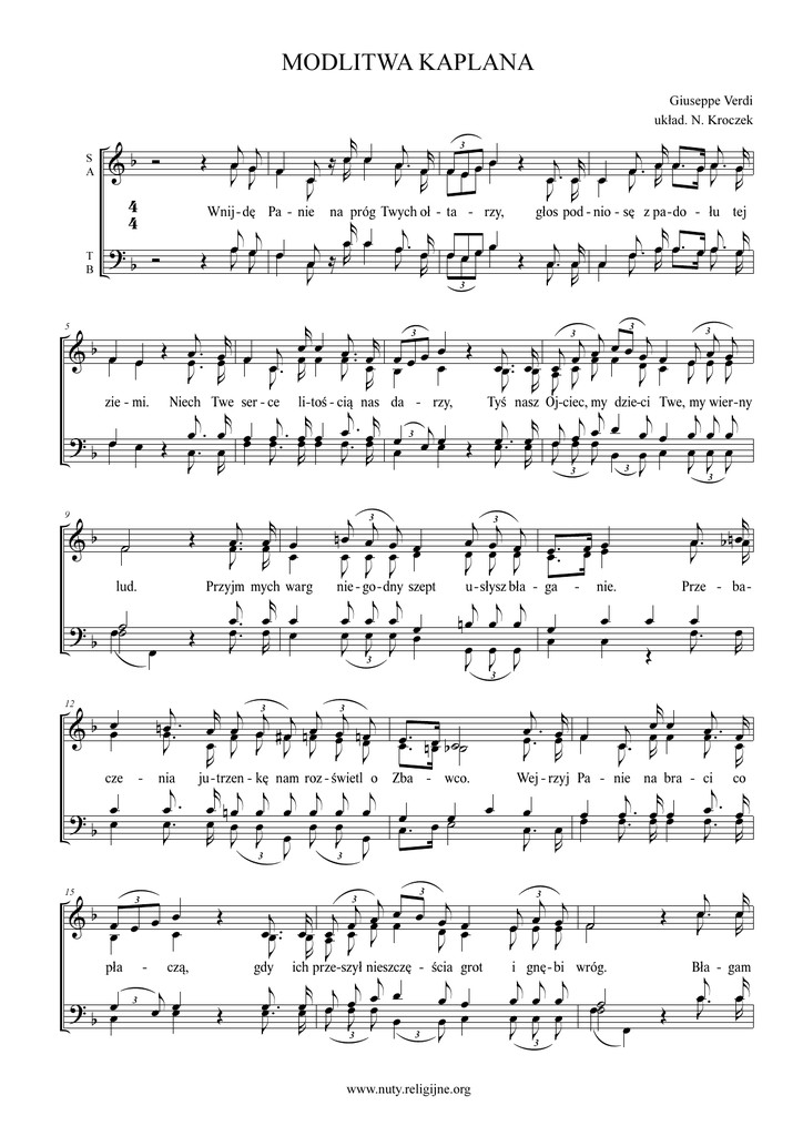 MODLITWA KAPLANA S A T B 5 r 3 j j œr œ . œj. r œ Œ j ≈ R œ œ . œr œ œ œ œ Œ j r œ œ J R œ œ . œ œ Jœ . R J R J J R Wnij - dę Pa - nie na próg Twych oł - ta - rzy, głos pod - nio - sę z pa - do - łu tej r j j j j œr œ . œj. r j r œ œ œ j œR œ œ . œr œ œ œ œ Œ J J Œ œ . œ œ Jœ . R œ J œR J R œ ≈ J J R 3 j j œ œ œ J J &b Ó ? 4 4 b Ó j & b œ œ Œ œœ .. J j œ ? œ œ Œ œ.. b J zie - mi. 9 &b b ˙ j nœ œ J j œ œ J - œ b œ &b œ œ œ œ œ œ 3 j œ œ J 3 r j 3j j j 3j j œ œœ œ # œ n œœ œœ n œ œ J J J J J œ J R nia ju - trzen - kę nam roz - świetl o r j j j j j j j œ . œ nœ œ œ œ œ œ œ. œ œ œ œ œ J R J J œ J J œ J J 3 3 3 pła j œ œ J 3 Œ czą, j œ œœ j r j œœ .. œœ œœ J R J 3 j œ œ J j œ œœ œ J j œ œ œ œ J j œœ J 3 j œœ J 3 j nœ œ J Zba - wco. œ œ œ˙ œ. jœ 3 j œœ œ œ œ œ œ œ J J j œ œ œ œ J ich prze-szył nieszczę - ścia grot 3 j œœ œœ . . J u - słysz bła - ga j œ œ J 3 www.nuty.religijne.org j œ œ œ œ J œ r j œ . b n œœ J R œœ œœ - nie. œ œ j r œœ . œœ œ J. R œœ .. n œœ b ˙˙ j r j œj œj œ œœ . . œœ œ œ œ J R J J3 J œ gdy Œ 3 3 j j j j j œ j œ œ œ œœ Œ œj . œr œj œœ œœ œ œ œœ œœ œ œœ œœ œ œ. œ œ J J J J J J R J J da - rzy, Tyś nasz Oj-ciec, my dzie-ci Twe, my wier - ny j j j j œj œ j r j j j œ œ œ œ œ œ 3 œ œœ Œ œœ . . œœ œ œœ œ œ J R J J J œ 3 œJ œ Jœ œJ œJ 3 3 3 nie - go - dny szept j n œœ . . J cze œ b œ j r œœ . œœ œ œ J. R Œ œ & b œœ ? j r œœ .. œœ œ J R œ Przyjm mych warg œ˙˙ 15 r j œ œœ œœ . œ J. R Œ 12 ? r œ œ œj. r œ œ œ . œœ J R R li - toś - cią nas r œj. r œœ œœ œ . œœ J R R r œœ œ j œ. R J Niech Twe ser - ce lud. ? Giuseppe Verdi układ. N. Kroczek Prze - ba - œ œœ J. Œ r œ j œ œœ œ. R J œ R j œœ . . J r œœ R j œœ . œœr J. R Wej - rzyj Pa - nie na bra - ci co j œ. J r œ R j œ. J r œ R œ œ œ. œ œ J R j r œœ . . œœ œœ J R j œ J j œœ J j œœ ˙ J j œ œ J j œ œ J j œ œ˙˙ œ œ J 3 Œ i gnę - bi wróg. 3 Bła - gam Œ 3 r 3 œœ œœ œœ n œœ œj n œ œ œ ‰ 3j j j ‰ j ≈ r j ‰ j ≈ r Œ œj. œr œ œ œ œ œ œ œ œ œ œ œ œ œ œ œ œ œ œ œ œœ œ œ œ œ œ œ œ R J J R JJ J J R J J R Pa - nie za bie - dną m€ zie mię, spoj - rzyj na nią i przy - słoń już u - cha, Twe - go j r œœ œœ .. œœ œœ œœ n œœ œj n œ œ œ ‰ j j j j r n œj œj œr œ œ Œ j r ? b œ œ . œ œ œ œœ œ œœ œ3 œ œœœ œ œ œœ n œœ ‰ œœ ≈ œœ ‰ ≈ œ œ. œ œ œ . œ œ J R 3 J J J R œJ Jœ Rœ 3 J spoj - rzyj 3 3 j r 22 3 j 3 œ œ œ œ œ j j . r œ j j j œ œ œ œ œ œ œ . œ œ n œœ œœ œœ œ œ ‰ œ œ œ ‰ œ ≈ œ œ ‰ œ œœ œj . Œ j r &b J R œ œ œ œ œ œ œ œ œ œœ œ œ J œ œ JJ J J R J J J. R gnie - wu i ka - ry zdejm brze - mię, niech Twe Ser - ce tych mo - dłów wy - słu - cha. Wszak Ty j r j r œœ œœ .. œœ œœ œœ œœ œj n œ œ œ ‰ j j j j r n œj œ œj œ œ . œ œ ? œ œ . œ œ œ œœ œ œœ œ œ œœœ œ œ œœ œ ‰ œ ≈ œ n œ œ œ œ ‰ œ œ œ œ Œ œJ . œ b œ J R J J R J J R J 3 3 3 J 26 j r j r j r j r j r . . b œ œ œ ‰ œ œ œ r b œ œ œ j j b œ œ œ œ . . & œ œ . œ œ œ . œ ˙˙ œ œ œ œ . œ œ. œ œ ˙ œ . . œœ . œ œ œ J R J R J R J R J R J J R j 18 œ œ . & b œ œJ . MODLITWA KAPLANA 2 r œ œ œ œ R r œ j œ œœ œ J. R j œ. œ. J ży - łeś ? œ b œ 30 &b œ j œ. œ. J j r œœ . . œœ œœ J R j œœ . . J j j œ œ. œ ‰ œ. J J - le i 3 r œœ œ œ œ œœ œ R j tur - ła œ. œ œ œ. œ œ J R go - sław o Chry - ste ? œœ b r œ ˙ œ ˙ R na ziem - skim pa - do - 3 Œ r œ œ œ œ R j œ. œ. J j r j œœ .. œœ œœ J R J czom, r œ œ œ œ R ro - zu - miesz nasz ból j œœ J 3 > Po - błor œ œ œ œ œ œ œ ˙ œ. œ J R R j œ. œ. J i j œœ J j œœ J nie - do - lę. j œœ J 3 r j j œj œj œj œœ œ œœ œ R J J J œJ œJ 3 j r j & b œ ‰ œœ .. œœ œœ J R J j œ œœ kres. -gal ˙ &b œ gorz j r bœ . œ œ œ. œ bœ J R Wej - rzyj Pa - nie j # œj. œr œ ? œœ ‰ œ . œ œ b J J R 36 j r œœ . . œœ ˙œ J R na j œœ . . J Œ œ ?b œ ki mych bra-ci los, los na gorz -ki mych gorz - ki œ nœ œ œ π œ œ œj œj œj j j ‰ œj. œr œ œ œ œ œ 3 œ 3 œœ œ œ. œ œ J J3 J J R J J j r b œ œœ π œœ . œœ œœ ‰ J. R œ J J głos bła-gal - nej mod - li - twy głos. gal - nej j j œ nœ œœ œ œ 3 3 j œ œ œ œ J œ œ œj œj œj j j ‰ œj . œr œ œ. œœ œ œ œ œ œ 3 œœ œ J R J J3 J 3 J J - nej mo - dli - twy głos - j œ J niech o - ba - czą mi - ło - ści Twej blask 3 33 j œœ œœ J bra - ci los, j œ bœ œ œ 3 J j œœ . . J j r œ. œ w œ . œ ˙.w J R O - każ nam zmi - ło www.nuty.religijne.org wa j œ œ J 3 œ bła ten bła j r bœ . œ œ. œ J R œœ Œ Ó nie. j œ œ J j r œœ . . œœ J R niech Cię wzru - szy - j œœ J i niesz - część niech Cię wzru - szy j # œj. œr œ œœ J ‰ Jœ . Rœ œ r œœ ww R j œ œ J j œœ J 3 œ œ Œ Ó œ
