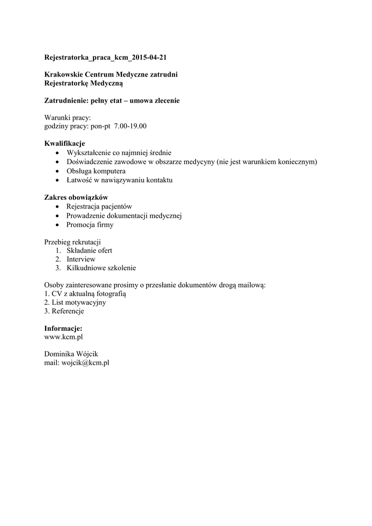 Rejestratorka_praca_kcm_2015-04-21 Krakowskie Centrum Medyczne zatrudni Rejestratorkę Medyczną Zatrudnienie: pełny etat – umowa zlecenie Warunki pracy: godziny pracy: pon-pt 7.00-19.00 Kwalifikacje Wykształcenie co najmniej średnie Doświadczenie zawodowe w obszarze medycyny (nie jest warunkiem koniecznym) Obsługa komputera Łatwość w nawiązywaniu kontaktu Zakres obowiązków Rejestracja pacjentów Prowadzenie dokumentacji medycznej Promocja firmy Przebieg rekrutacji 1. Składanie ofert 2. Interview 3. Kilkudniowe szkolenie Osoby zainteresowane prosimy o przesłanie dokumentów drogą mailową: 1. CV z aktualną fotografią 2. List motywacyjny 3. Referencje Informacje: www.kcm.pl Dominika Wójcik mail: [email protected]