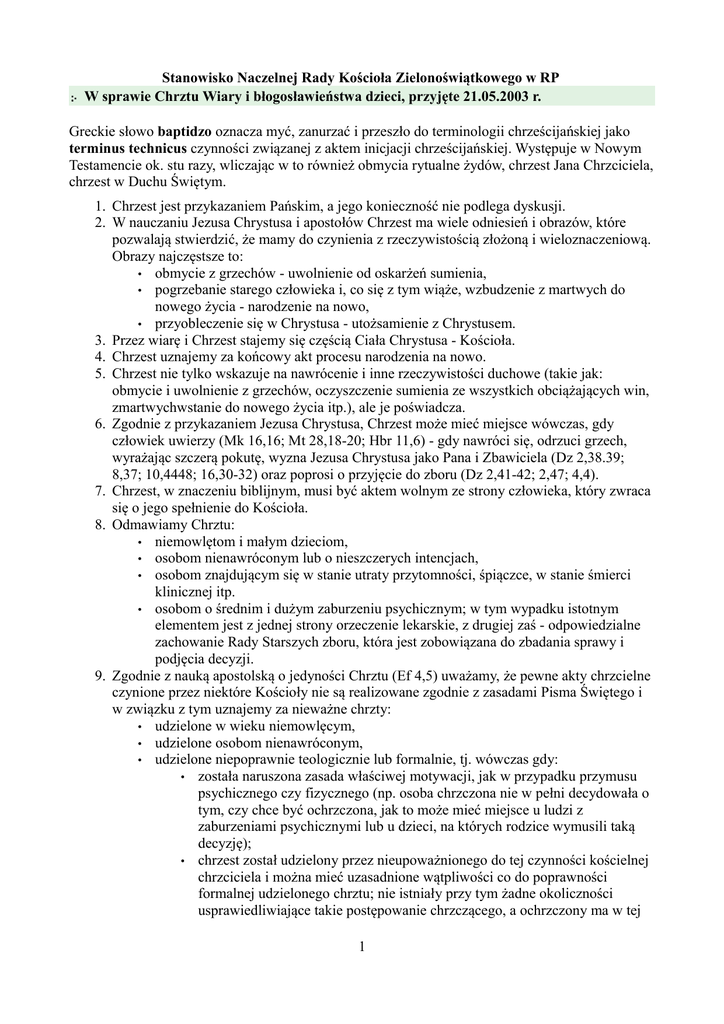 Stanowisko Naczelnej Rady Kościoła Zielonoświątkowego w RP W sprawie Chrztu Wiary i błogosławieństwa dzieci, przyjęte 21.05.2003 r. Greckie słowo baptidzo oznacza myć, zanurzać i przeszło do terminologii chrześcijańskiej jako terminus technicus czynności związanej z aktem inicjacji chrześcijańskiej. Występuje w Nowym Testamencie ok. stu razy, wliczając w to również obmycia rytualne żydów, chrzest Jana Chrzciciela, chrzest w Duchu Świętym. 1. Chrzest jest przykazaniem Pańskim, a jego konieczność nie podlega dyskusji. 2. W nauczaniu Jezusa Chrystusa i apostołów Chrzest ma wiele odniesień i obrazów, które pozwalają stwierdzić, że mamy do czynienia z rzeczywistością złożoną i wieloznaczeniową. Obrazy najczęstsze to: • obmycie z grzechów - uwolnienie od oskarżeń sumienia, • pogrzebanie starego człowieka i, co się z tym wiąże, wzbudzenie z martwych do nowego życia - narodzenie na nowo, • przyobleczenie się w Chrystusa - utożsamienie z Chrystusem. 3. Przez wiarę i Chrzest stajemy się częścią Ciała Chrystusa - Kościoła. 4. Chrzest uznajemy za końcowy akt procesu narodzenia na nowo. 5. Chrzest nie tylko wskazuje na nawrócenie i inne rzeczywistości duchowe (takie jak: obmycie i uwolnienie z grzechów, oczyszczenie sumienia ze wszystkich obciążających win, zmartwychwstanie do nowego życia itp.), ale je poświadcza. 6. Zgodnie z przykazaniem Jezusa Chrystusa, Chrzest może mieć miejsce wówczas, gdy człowiek uwierzy (Mk 16,16; Mt 28,18-20; Hbr 11,6) - gdy nawróci się, odrzuci grzech, wyrażając szczerą pokutę, wyzna Jezusa Chrystusa jako Pana i Zbawiciela (Dz 2,38.39; 8,37; 10,4448; 16,30-32) oraz poprosi o przyjęcie do zboru (Dz 2,41-42; 2,47; 4,4). 7. Chrzest, w znaczeniu biblijnym, musi być aktem wolnym ze strony człowieka, który zwraca się o jego spełnienie do Kościoła. 8. Odmawiamy Chrztu: • niemowlętom i małym dzieciom, • osobom nienawróconym lub o nieszczerych intencjach, • osobom znajdującym się w stanie utraty przytomności, śpiączce, w stanie śmierci klinicznej itp. • osobom o średnim i dużym zaburzeniu psychicznym; w tym wypadku istotnym elementem jest z jednej strony orzeczenie lekarskie, z drugiej zaś - odpowiedzialne zachowanie Rady Starszych zboru, która jest zobowiązana do zbadania sprawy i podjęcia decyzji. 9. Zgodnie z nauką apostolską o jedyności Chrztu (Ef 4,5) uważamy, że pewne akty chrzcielne czynione przez niektóre Kościoły nie są realizowane zgodnie z zasadami Pisma Świętego i w związku z tym uznajemy za nieważne chrzty: • udzielone w wieku niemowlęcym, • udzielone osobom nienawróconym, • udzielone niepoprawnie teologicznie lub formalnie, tj. wówczas gdy: • została naruszona zasada właściwej motywacji, jak w przypadku przymusu psychicznego czy fizycznego (np. osoba chrzczona nie w pełni decydowała o tym, czy chce być ochrzczona, jak to może mieć miejsce u ludzi z zaburzeniami psychicznymi lub u dzieci, na których rodzice wymusili taką decyzję); • chrzest został udzielony przez nieupoważnionego do tej czynności kościelnej chrzciciela i można mieć uzasadnione wątpliwości co do poprawności formalnej udzielonego chrztu; nie istniały przy tym żadne okoliczności usprawiedliwiające takie postępowanie chrzczącego, a ochrzczony ma w tej 1 • • kwestii wątpliwości. W tym wypadku rozstrzygająca jest decyzja Rady Starszych; materia lub forma chrztu nie zostały zachowane; mamy do czynienia z udzieleniem go przez osoby o przekonaniach antytrynitarnych. W takich sytuacjach wymagane jest udzielenie Chrztu. Nie jest to jednak chrzest ponowny, gdyż poprzedni nie spełniał znamion Chrztu i w tej sytuacji uznać go należy raczej za akt zbliżony do Chrztu, ale nim niebędący. Zaleca się, aby decyzję o powtórzeniu Chrztu pastorzy i Rady Starszych podejmowały ze szczególną rozwagą. 10.Ostateczna odpowiedzialność za decyzję udzielenia Chrztu spoczywa na Radzie Starszych, która w myśl Prawa Wewnętrznego Kościoła jest upoważniona do przyjmowania nowych członków do zboru. 11.Katechumeni poniżej 16 roku życia pragnący przyjąć Chrzest muszą mieć zgodę rodziców lub innych opiekunów prawnych. 12.Materią Chrztu jest woda. 13.Dla ważności Chrztu nie ma znaczenia, czy jest on dokonywany w rzece, morzu, jeziorze, w innych zbiornikach naturalnych, czy też w zbiornikach sztucznych, takich jak baseny i baptysteria. Istotne jest jednak, aby zbiornik wodny nie deprecjonował powagi Chrztu. Ze względu na świętość Słowa Bożego zaleca się zwrócenie uwagi na otoczenie, w jakim Chrzest jest dokonywany. 14.Do formy Chrztu zaliczyć należy: złożenie wyznania wiary przez katechumena, wezwanie Imienia Bożego i akt zanurzenia dokonany przez ordynowanego duchownego. 15.Przed wezwaniem Imienia Bożego i zanurzeniem, katechumen powinien złożyć wyznanie wiary, odpowiadając na trzy pytania chrzciciela, na przykład: • Bracie/Siostro [imię], czy wierzysz, że Jezus Chrystus jest Synem Bożym? • Czy wierzysz, że On zmarł za twoje grzechy i zmartwychwstał dla twojego usprawiedliwienia? • Czy pragniesz być ochrzczony i przyrzekasz służyć wiernie Jezusowi we wspólnocie Jego Kościoła przez całe twoje życie? Chrzciciel wypowiada formułę chrzcielną w brzmieniu: Na podstawie twojego wyznania wiary i pragnienia Chrztu - chrzczę ciebie w Imię Ojca i Syna, i Ducha Świętego. 16.Nie praktykujemy Chrztu w formule ograniczonej tylko do Imienia Pana Jezusa Chrystusa. Stwierdzamy, że Księga Dziejów Apostolskich podaje jedynie opisy Chrztu, a nie formułę chrzcielną. 17.Zaleca się, żeby chrzciciel ubrany był zgodnie z powagą chwili. Najlepszym strojem na tę okazję jest toga lub inny ubiór duchownego. 18.Zaleca się, żeby katechumen ubrany był w specjalne szaty (zwyczajowo koloru białego). Należy także zwrócić uwagę, aby przestrzegać zasad skromności i nie dopuścić do skąpego lu