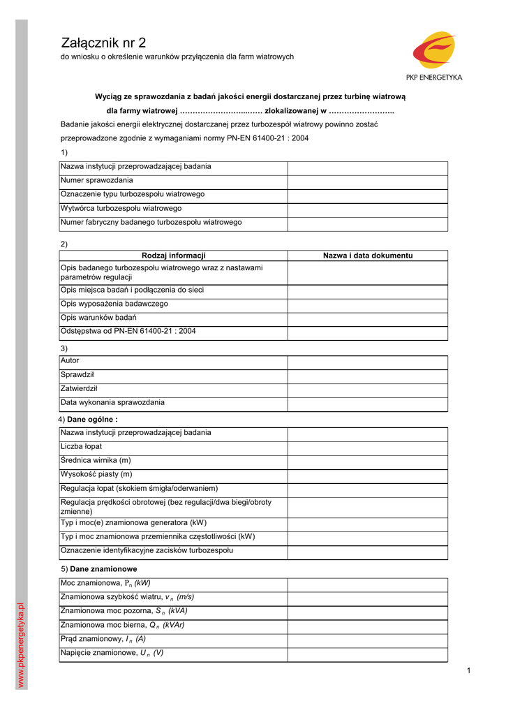 Załącznik nr 2 do wniosku o określenie warunków przyłączenia dla farm wiatrowych Wyciąg ze sprawozdania z badań jakości energii dostarczanej przez turbinę wiatrową dla farmy wiatrowej ……………………...…… zlokalizowanej w …………………….. Badanie jakości energii elektrycznej dostarczanej przez turbozespół wiatrowy powinno zostać przeprowadzone zgodnie z wymaganiami normy PN-EN 61400-21 : 2004 1) Nazwa instytucji przeprowadzającej badania Numer sprawozdania Oznaczenie typu turbozespołu wiatrowego Wytwórca turbozespołu wiatrowego Numer fabryczny badanego turbozespołu wiatrowego 2) Rodzaj informacji Nazwa i data dokumentu Opis badanego turbozespołu wiatrowego wraz z nastawami parametrów regulacji Opis miejsca badań i podłączenia do sieci Opis wyposażenia badawczego Opis warunków badań Odstępstwa od PN-EN 61400-21 : 2004 3) Autor Sprawdził Zatwierdził Data wykonania sprawozdania 4) Dane ogólne : Nazwa instytucji przeprowadzającej badania Liczba łopat Średnica wirnika (m) Wysokość piasty (m) Regulacja łopat (skokiem śmigła/oderwaniem) Regulacja prędkości obrotowej (bez regulacji/dwa biegi/obroty zmienne) Typ i moc(e) znamionowa generatora (kW) Typ i moc znamionowa przemiennika częstotliwości (kW) Oznaczenie identyfikacyjne zacisków turbozespołu 5) Dane znamionowe Moc znamionowa, Pn (kW) www.pkpenergetyka.pl Znamionowa szybkość wiatru, v n (m/s) Znamionowa moc pozorna, S n (kVA) Znamionowa moc bierna, Q n (kVAr) Prąd znamionowy, I n (A) Napięcie znamionowe, U n (V) 1 6) Moc czynna Moc maksymalna dopuszczalna P mc kW Moc średnia 0,2- sekundowa P 0,2-sec kW Moc średnia 1 - minutowa P 1-min kW Moc średnia 10 - miutowa P 10-min kW 7) Moc bierna Moc czynna (%Pn) Moc czynna (kW) Moc bierna (kVAr) ---------------------------------------10 20 30 40 50 60 70 80 90 100 8) Szacunkowa moc bierna przy mocy czynnej P mc (kVAr) Szacunkowa moc bierna przy mocy czynnej P m (kVAr) Szacunkowa moc bierna przy mocy czynnej P 0,2 (kVAr) 9) Wahania napięcia i Praca ciągła Kąt fazowy i impedancji sieci, Ψ k (deg) 30 Średnioroczna szybkość wiatru, v a (m/s) 50 70 85 Wskaźnik migotania światła, c (W k , v a ) 6 7,5 8,5 10 10) Procesy łączeniowe Rodzaj łączenia Uruchomienie przy rozruchowej szybkości wiatru Maksymalna liczba łączeń, N 10 Maksymalna liczba łączeń, N 120 Kąt fazowy impedancji sieci, Ψ k (deg) 30 50 70 85 Skokowy wskaźnik migotania światła, K f (Ψ k ) Wskaźnik zmiany napięcia, k u (Ψ k ) www.pkpenergetyka.pl 11) Rodzaj łączenia Uruchomienie przy znamionowej szybkości wiatru Maksymalna liczba łączeń, N 10 Maksymalna liczba łączeń, N 120 Kąt fazowy impedancji sieci, Ψ k (deg) 30 50 70 85 Skokowy wskaźnik migotania światła, K f (Ψ k ) Wskaźnik zmiany napięcia, k u (Ψ k ) 2 12) Rodzaj łączenia Najbardziej niekorzystny przypadek łączenia pomiędzy generatorami Maksymalna liczba łączeń, N 10 Maksymalna liczba łączeń, N 120 Kąt fazowy impedancji sieci, Ψ k (deg) 30 50 70 85 Rząd Moc wyjściowa Harmoniczna pradu Skokowy wskaźnik migotania światła, Kf (Ψk) Wskaźnik zmiany napięcia, ku (Ψ k ) 13) Harmoniczne Rząd Moc wyjściowa Harmoniczna prądu (% I n ) (kW) (kW) 2 3 4 5 6 7 8 9 10 11 12 13 14 15 16 17 18 19 20 21 22 23 24 25 26 27 28 29 30 31 32 33 34 35 36 37 38 39 40 41 42 43 44 45 46 47 48 49 (% I n ) 50 Maksymalna wartość całkowitego współczynnika odkształcenia harmonicznego (% I n ) www.pkpenergetyka.pl Moc wyjściowa, przy której całkowity współczynnik odkształcenia harmonicznego osiąga wartość maksymalną (kW) K i= ……………………………… Miejscowość IMAX IW ……………… ………………………….. Data Pieczęć i podpis osoby upoważnionej 3