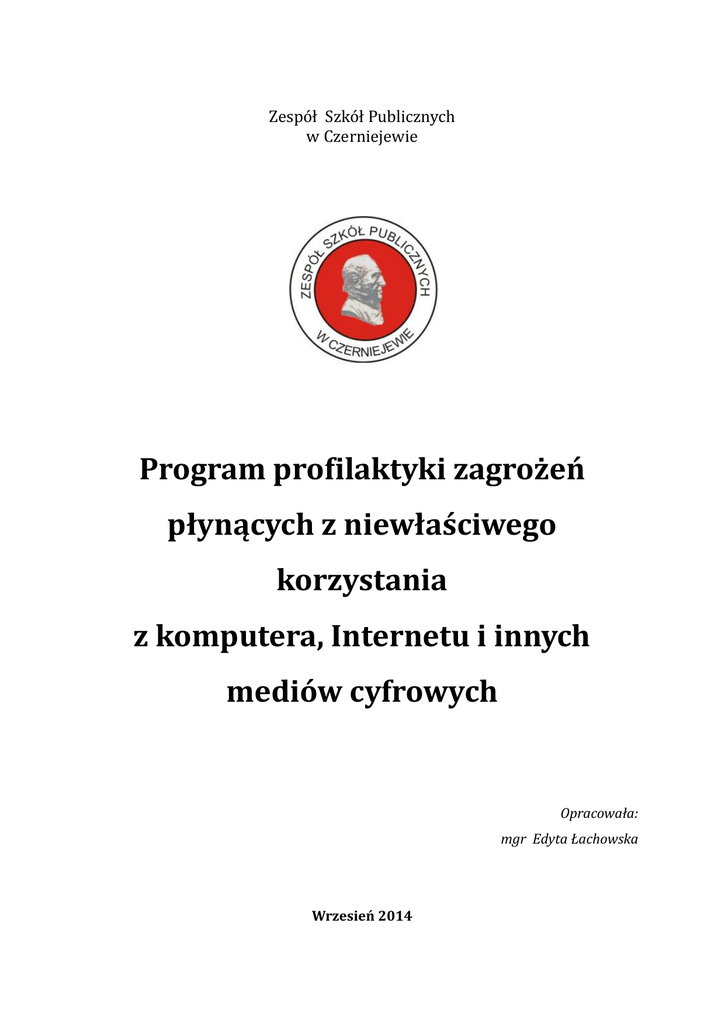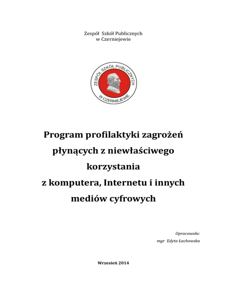 Zespół Szkół Publicznych w Czerniejewie Program profilaktyki zagrożeń płynących z niewłaściwego korzystania z komputera, Internetu i innych mediów cyfrowych Opracowała: mgr Edyta Łachowska Wrzesień 2014 Program profilaktyki zagrożeń płynących z niewłaściwego korzystania z komputera, Internetu i innych mediów cyfrowych jest jednym z elementów Szkolnego Programu Profilaktycznego na rok szkolny 2014/2015 realizowanego w Zespole Szkół Publicznych w Czerniejewie. Podstawą do opracowania tegoż programu był Raport z diagnozy ryzyka uzależnienia od komputera, Internetu i innych mediów cyfrowych, który powstał w oparciu o wyniki badań ankietowych przeprowadzonych wśród uczniów naszej szkoły oraz ich rodziców (badania przeprowadzono w kwietniu i maju 2013 r.). Analiza ankiet pozwoliła stwierdzić, iż problem nadmiernego korzystania z mediów cyfrowych dotyczy: 10% uczniów klas I-III szkoły podstawowej, 17% uczniów klas IV-VI szkoły podstawowej oraz aż 24% uczniów klas I-III gimnazjum. Uzależnienie od komputera bądź kompulsywne korzystanie z Internetu za pośrednictwem innych urządzeń cyfrowych (np. telefonów komórkowych, tabletów) często wiąże się z szeregiem innych zagrożeń komputerowo-sieciowych takich jak np. cyberbullying (cyberprzemoc np. prześladowanie, podszywanie się, cybernękanie, etc), dostęp do treści szkodliwych, przestępstwa i oszustwa internetowe, uwodzenie w sieci (tzw. grooming), itp. Niniejszy program ma za zadanie zmniejszyć skalę ryzyka wystąpienia w/w problemów wśród uczniów naszej szkoły oraz przygotować ich do świadomego uczestnictwa w życiu społeczeństwa informacyjno-komunikacyjnego. Celem priorytetowym jest również zapoznanie uczniów ze sposobami reagowania na powyższe zagrożenia oraz zaprezentowanie osób i podmiotów, u których mogą szukać wsparcia i pomocy w przypadku wystąpienia jakichkolwiek cyberzagrożeń. I) Profilaktyka zagrożeń komputerowo-sieciowych Rozwój nowoczesnych technologii daje współczesnemu człowiekowi nieograniczone możliwości komunikacyjno-informacyjne, edukacyjne i rozrywkowe. Narzędzia elektroniczne takie jak komputer, telefon komórkowy czy Internet funkcjonują już niemal we wszystkich dziedzinach ludzkiego życia i niejako przenoszą je do innej rzeczywistości określanej mianem świata wirtualnego bądź cyberprzestrzeni. I to właśnie owa „cyberprzestrzeń”, jak zauważa dr J. Ropski – pedagog i psycholog pracujący w Akademii Wychowania Fizycznego w Katowicach, „wywiera znaczący wpływ na postawy ludzi, zwłaszcza ludzi młodych, którzy 2 podążają ku dorosłości”1. Technologie elektroniczne i cyfrowe są dla współczesnych dzieci i nastolatków głównym źródłem wiedzy oraz sposobem komunikowania się i spędzania czasu wolnego, co sprawia, iż właśnie ta grupa społeczna jest najbardziej narażona na szereg niebezpieczeństw wynikających z nieracjonalnego korzystania z technologii cyberprzestrzennych. Dlatego też wyzwaniem współczesnego świata wydaje się być podjęcie skutecznych działań zmierzających do zapobiegania i eliminowania cyberzagrożeń. Aby maksymalnie zniwelować ryzyko negatywnego oddziaływania mediów na współczesnych nastolatków, istotne jest systematyczne i wielotorowe wdrażanie działań profilaktycznoedukacyjnych. W tej kwestii konieczna jest współpraca wielu podmiotów: rodziny, szkoły, środowiska lokalnego, służby zdrowia, a także mediów. Młody człowiek powinien być edukowany medialnie tzn. uczyć się świadomego i racjonalnego korzystania ze współczesnych mediów. Powinien zdawać sobie sprawę z tego, „że mimo swej potęgi mass media są tylko narzędziami współczesnego człowieka, [a] ich wartość i użyteczność dla człowieka zależą od sposobu, w jaki je wykorzystuje”2. Rozwijanie wśród dzieci i młodzieży krytycznej postawy wobec mediów cyfrowych z pewnością uchroni je przed wpadnięciem w sidła nałogu komputerowo-sieciowego, którego przezwyciężenie jest możliwe tylko dzięki poddaniu się skomplikowanym i długotrwałym terapiom leczniczym. II) Czym jest profilaktyka? By móc w sposób świadomy mówić o profilaktyce, konieczne jest zgłębienie istoty tego pojęcia. Encyklopedia Popularna PWN definiuje pojęcie profilaktyki jako „wszelką działalność zapobiegającą zjawiskom szkodliwym: chorobom, wypadkom; przestępczości itd., przez zwalczanie przyczyn…”. Podobną definicję możemy odnaleźć w Słowniku wyrazów obcych i trudnych, według którego profilaktyka to „zapobieganie chorobom lub niepożądanym zjawiskom społecznym, wypadkom, itd.”, a profilaktyczny (od gr. prophylaktikós – ‘zapobiegawczy’) – „służący profilaktyce”3. Profilaktyka winna więc być rozumiana jako szereg zabiegów mających na celu wcześniejsze eliminowanie bądź ograniczanie zjawisk powszechnie postrzeganych jako szkodliwe i niepożądane. Jak słusznie zauważa doktor E. Kozdrowicz z Zakładu Problemów Społecznych Dziecka i Rodziny 1 Ropski J.: Elektroniczne uzależnienia współczesnej młodzieży, [w:] Bębas S., Plis J., Bednarek J. (red.): Patologie w cyberświecie, Radom 2012. 2 Andrzejewska A.: Uzależnienie od komputera i Internetu nową formą patologii społecznej, [w:] Bębas S. (red.): Oblicza patologii społecznych, Radom 2011. 3 Markowski A., Pawelec R.: Słownik wyrazów obcych i trudnych, Warszawa 2001. 3 Uniwersytetu Warszawskiego: „profilaktyka to proces wspierający zdrowie psychiczne i fizyczne poprzez pomoc i towarzyszenie uczniowi w zdobywaniu wiedzy o zagrożeniach dla zdrowia oraz w nabywaniu umiejętności przeciwdziałania tym zagrożeniom”4. Natomiast zdaniem dr hab. K. Zabłockiego – pracownika Instytutu Psychologii UKSW5 w Warszawie, termin profilaktyka ewoluuje w dwóch kierunkach: destrukcyjnym i konstruktywnym. „Destrukcyjne (negatywne) znaczenie obejmuje działania ukierunkowane na likwidowa