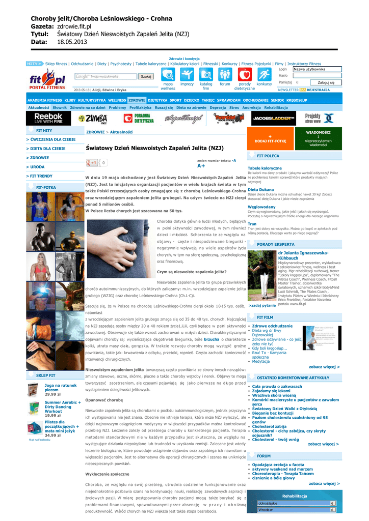 Choroby jelit/Choroba Leniowskiego Crohna Gazeta: zdrowie.fit.pl Tytu³: wiatowy Dzieñ Nieswoistych Zapaleñ Jelita (NZJ) Data: 18.05.2013 Zdrowie i kondycja Sklep fitness | Odchudzanie | Diety | Psychotesty | Tabele kaloryczne | Kalkulatory kalorii | Fitnesski | Konkursy | Fitness Pojedynki | Filmy | Instruktorzy Fitness Login 2013-05-18 | Alicji, Edwina i Eryka Nazwa użytkownika Hasło Szukaj mapa wellness imprezy katalog firm forum porady konkursy dietetyczne Pamiętaj c d e f g NEWSLETTER Zaloguj się REJESTRACJA AKADEMIA FITNESS KLUBY KULTURYSTYKA WELLNESS ZDROWIE DIETETYKA SPORT DZIECKO TANIEC SPRAWDZAM ODCHUDZANIE SENIOR KRĘGOSŁUP Aktualności Słownik Zdrowie na co dzień Problemy Profilaktyka Ruszaj się FIT HITY Dieta na zdrowie Depresja Stres Anoreksja Rehabilitacja ZDROWIE > Aktualności + > ĆWICZENIA DLA CIEBIE > DIETA DLA CIEBIE DODAJ FIT-FOTKĘ Światowy Dzień Nieswoistych Zapaleń Jelita (NZJ) FIT POLECA > ZDROWIE zmien rozmiar tekstu 0 FIT-FOTKA -A A+ > URODA > FIT TRENDY WIADOMOŚCI 1 nieprzeczytanych wiadomości Tabele kaloryczne Ile kalorii ma dany produkt i jaką ma wartość o dżywczą? Policz W dniu 19 maja obchodzony jest Światowy Dzień Nieswoistych Zapaleń Jelita ile pochłaniasz kalorii i sprawdź które produkty mają ich (NZJ). Jest to inicjatywa organizacji pacjentów w wielu krajach świata w tym najwięcej także Polski zrzeszających osoby zmagające się z chorobą Leśniowskiego-Crohna Dieta Dukana Dzięki diecie Dukana można schudnąć nawet 30 kg! Zobacz oraz wrzodziejącym zapaleniem jelita grubegoi. Na cały m świecie na NZJ cierpi stosować dietę Dukana i jakie niesie zagrożenia ponad 5 milionów osóbii. Węglowodany W Polsce liczba chorych jest szacowana na 50 tys. Czym są węglowodany, jakie jeść i jakich się wystrzegać. Poczytaj o najważniejszym źródle energii dla naszego organizmu Choroba dotyka głównie ludzi młodych, będących Tran w p ełni aktywności zawodowej, w tym również Tran jest dobry na wszystko. Można go kupić w aptekach pod dzieci i młodzież. Schorzenia te ze względu na różną postacią. Dlaczego warto po niego sięgnąć? o b j a w y - częste i niespodziewane biegunki - PORADY EKSPERTA negatywnie wpływają n a w i e l e a s p e k t ó w życia dr Jolanta IgnaszewskaKühbauch chorych, w tym na sferę społeczną, psychologiczną oraz finansową. Międzynarodowy prezenter, wykładowca i szkoleniowiec fitness, wellness i best aging. Mgr rehabilitacji ruchowej, trener Czym są nieswoiste zapalenia jelita? "Szkoły kręgosłupa", dyplomowany "The Pilates Coach", Wellness Coach, Fitball Nieswoiste zapalenia jelita to grupa przewlekłych Master Trainer, absolwentka światowych, uznanych szkół Body&Mind chorób autoimmunizacyjnych, do których zaliczamy: m.in. wrzodziejące zapalenie jelita Lucii Schmidt, The Pilates Coach , grubego (WZJG) oraz chorobę Leśniowskiego-Crohna (Ch.L-C)i. Instytutu Pilates w Wiedniu i Ideokinezy Erica Franklina, Redaktor Naczelna portalu www.fit.pl Szacuje się, że w Polsce na chorobę Leśniowskiego-Crohna cierpi około 1 0-15 tys. osób, >zadaj pytanie natomiast FIT FILM z wrzodziejącym zapaleniem jelita grubego zmaga się od 35 do 40 tys. chorych. Najczęściej na NZJ zapadają osoby między 20 a 40 rokiem życia1,ii,iii, czyli będące w pełni aktywności • Zdrowe odchudzanie • Dieta wg dr Ewy zawodowej. Obserwuje się także wzrost zachorowań u małych dzieci. Charakterystycznymi Dąbrowskiej objawami choroby są: wycieńczając a długotrwała biegunka, bóle brzucha o charakterze • Zdrowe odżywianie - co jeść, żeby nie tyć kolki, utrata masy ciała, gorączka. W trakcie rozwoju choroby mogą wystąpić groźne • Gdy boli kręgosłup... powikłania, takie jak: krwawienia z odbytu, przetoki, ropnie6. Często zachodzi konieczność • Rzuć To - Kampania społeczna interwencji chirurgicznych. • Medytacja zobacz więcej > Nieswoistym zapaleniom jelita towarzyszą często powikłania ze strony innych narządów: SKLEP FIT Joga na ratunek plecom 29.99 zł Summer Aerobic + Dirty Dancing Workout 19.99 zł Pilates dla początkujących + mata mini jeżyk 34.99 zł fit.pl na Facebooku zmiany stawowe, oczne, skórne, płucne a także choroby wątroby i nerek. Objawy te mogą towarzyszyć zaostrzeniom, ale czasami pojawiają się j a k o p i e r w s z e n a długo przed wystąpieniem dolegliwości jelitowych. Opanować chorobę OSTATNIO KOMENTOWANE ARTYKUŁY • • • • Nieswoiste zapalenia jelita są chorobami o podłożu autoimmunologicznym, jednak przyczyna • • ich występowania nie jest znana. Obecnie nie istnieje terapia, która może NZJ wyleczyć, ale • dzięki najnowszym osiągnięciom medycyny w większości przypadków można kontrolować • przebieg NZJ. Leczenie zależy od przebiegu choroby u konkretnego pacjenta. Terapia • metodami standardowymi nie w każdym przypadku jest skuteczna, ze względ u n a • występujące działania niepożądane lub trudności w uzyskaniu remisji. Zalecane jest wtedy Cała prawda o zakwasach Zajadamy się lekami Wrażliwa skóra wiosną Komórki macierzyste u pacjentów z zawałem serca Światowy Dzień Walki z Otyłością Bieganie bez kontuzji Poziom cholesterolu uzależniony od 95 genów Cholesterol zabija Cholesterol - cichy zabójca, czy skryty sojusznik? Cholesterol - twój wróg zobacz więcej > leczenie biologiczne, które powoduje ustąpienie objawów oraz zapobiega ich nawrotom u FORUM większości pacjentów. Jest to alternatywa dla operacji chirurgicznych i szansa na uniknięcie niebezpiecznych powikłań. Wykluczenie społeczne Choroba, ze względu na swój przebieg, utrudnia codzienne funkcjonowanie oraz • • • • Opadająca erekcja u faceta aktywny weekend nad morzem Choreoterapia - Terapia Tańcem cisnienie a bóle głowy zobacz więcej > niejednokrotnie pozbawia szans na kontynuację nauki, realizację zawodowych aspiracji i Rehabilitacja życiowych pasji. W miarę postępowan
