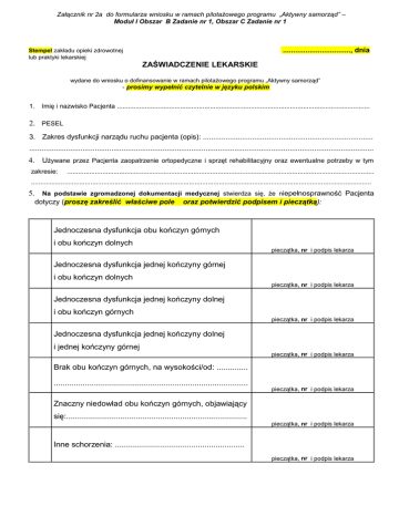 Załącznik nr 2a do formularza wniosku w ramach pilotażowego programu „Aktywny samorząd” – Moduł I Obszar B Zadanie nr 1, Obszar C Zadanie nr 1 ................................., dnia Stempel zakładu opieki zdrowotnej lub praktyki lekarskiej ZAŚWIADCZENIE LEKARSKIE wydane do wniosku o dofinansowanie w ramach pilotażowego programu „Aktywny samorząd” - prosimy wypełnić czytelnie w języku polskim 1. Imię i nazwisko Pacjenta ........................................................................................................................................ 2. PESEL 3. Zakres dysfunkcji narządu ruchu pacjenta (opis): ................................................................................... ........................................................................................................................................................................ 4. Używane przez Pacjenta zaopatrzenie ortopedyczne i sprzęt rehabilitacyjny oraz ewentualne potrzeby w tym zakresie: ..................................................................................................................................................................... ....................................................................................................................................................................................... 5. Na podstawie zgromadzonej dokumentacji medycznej stwierdza się, że niepełnosprawność Pacjenta dotyczy (proszę zakreślić właściwe pole oraz potwierdzić podpisem i pieczątką): Jednoczesna dysfunkcja obu kończyn górnych i obu kończyn dolnych pieczątka, nr i podpis lekarza Jednoczesna dysfunkcja jednej kończyny górnej i obu kończyn dolnych pieczątka, nr i podpis lekarza Jednoczesna dysfunkcja jednej kończyny dolnej i obu kończyn górnych pieczątka, nr i podpis lekarza Jednoczesna dysfunkcja jednej kończyny dolnej i jednej kończyny górnej pieczątka, nr i podpis lekarza Brak obu kończyn górnych, na wysokości/od: .............. ....................................................................................... pieczątka, nr i podpis lekarza Znaczny niedowład obu kończyn górnych, objawiający się:................................................................................. pieczątka, nr i podpis lekarza Inne schorzenia: .......................................................... pieczątka, nr i podpis lekarza Załącznik nr 2a do formularza wniosku w ramach pilotażowego programu „Aktywny samorząd” – Moduł I Obszar B Zadanie nr 1, Obszar C Zadanie nr 1 Str. 2 załącznika nr 2a do formularza wniosku – dotyczy formularzy wniosków – Moduł I Obszar C Zadanie nr 1 6. Ponadto (pole obowiązkowe w przypadku Pacjenta ubiegającego się o dofinansowanie w ramach obszaru C programu) - na podstawie zgromadzonej dokumentacji medycznej stwierdza się, że: proszę zakreślić właściwe pola 1. Pacjent może poruszać się na wózku inwalidzkim o napędzie ręcznym: tak nie 2. Korzystanie z wózka o napędzie elektrycznym jest niewskazane, gdyż może spowodować wstrzymanie lub pogorszenie procesu rehabilitacji lub wpłynie niekorzystnie na sprawność kończyn górnych: tak nie 3. Przeciwwskazania do korzystania z wózka o napędzie elektrycznym (np. utraty przytomności, epilepsja): .............................................................................................. ....................................................................................................................................... ............................................ ............................... brak przeciwwskazań pieczątka, nr i podpis lekarza Dotyczy wyłącznie Wnioskodawców ubiegających się o zwiększenie kwoty dofinansowania na zakup wózka inwalidzkiego o napędzie elektrycznym Pacjent z uwagi na ograniczenia funkcjonalne, stan i zakres dysfunkcji narządu ruchu powodującej niepełnosprawność wymaga zakupu wózka inwalidzkiego o napędzie elektrycznym z ponadstandardowym wyposażeniem, w tym: (proszę zakreślić właściwe pola ) niestandardowe sterowniki umożliwiające sterowanie wózkiem za pomocą jedynie władnych części ciała jak np.: ręki, palca, brody, stopy, warg lub wdechu i wydechu powietrza itp. urządzenia umożliwiające prowadzenie wózka także przez osobę towarzyszącą (hamulec, sterownik itp.) niestandardowe siedzisko (np. z windą podnoszącą, rehabilitacyjne, zapewniające maksymalną stabilizację, przeciwodleżynowe, itp.) specjalne, regulowane (w tym elektrycznie i w różnych płaszczyznach): podnóżki, podłokietniki lub oparcia nadgarstków kliny zapobiegające zsuwaniu się Pacjenta z wózka lub podpórki boczne, peloty piersiowe zagłówek stabilizujący głowę i szyję (w kształcie litery U) specjalne pasy bezpieczeństwa (np. dwupunktowe zapinane na biodrach, czteropunktowe) taki sposób, aby wózek był indywidualnie dopasowany do sylwetki Pacjenta (np. w przypadku niestandardowego wzrostu czy wagi Pacjenta) inne elementy i urządzenia (np. umożliwiające podłączenia joysticka wózka do komputera i posługiwanie się nim jak myszką), jakie: ........................................, dnia .............. (miejscowość ) (data) ............................................... pieczątka, nr i podpis lekarza Załącznik nr 2a do formularza wniosku w ramach pilotażowego programu „Aktywny samorząd” – Moduł I Obszar B Zadanie nr 1, Obszar C Zadanie nr 1 Str. 3 załącznika nr 2a do formularza wniosku – dotyczy formularzy wniosków – Moduł I Obszar C Zadanie nr 3 i 4 .............................., dnia Stempel zakładu opieki zdrowotnej lub praktyki lekarskiej ZAŚWIADCZENIE LEKARSKIE wydane do wniosku o dofinansowanie w ramach pilotażowego programu „Aktywny samorząd” - prosimy wypełnić czytelnie w języku polskim 1. Imię i nazwisko Pacjenta .................................................................................................
