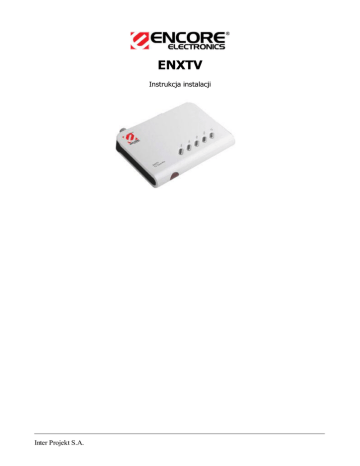 ENXTV Instrukcja instalacji Inter Projekt S.A. Spis treści 1. 2. 3. 4. 5. 6. 7. Wprowadzenie Zawartość opakowania Opis urządzenia Połączenie kabli Wstępna konfiguracja Opis Pilota zdalnego sterowania Opis Menu ekranowego 1. Wprowadzenie Encore ENXTV jest samodzielnym urządzeniem typu TV tuner , służącym do odbioru telewizji kablowej jak i antenowej przy pomocy zwykłego monitora CRT lub LCD. Urządzenie jest bogato wyposażone w wejścia / wyjścia TV oraz AUDIO. Do tunera można podłączyć cyfrowe urządzenia video wyposażone w wyjścia SVIDEO (nowszego typu magnetowidy, odtwarzacze DVD, kamery cyfrowe, satelitarne tunery cyfrowe), standardowe analogowe urządzenia VIDEO , wyposażone w wyjścia VIDEO OUT (magnetowidy, odtwarzacze, starsze kamery VHS, satelitarne tunery analogowe), komputer PC oraz inne urządzenia pracujące w standardzie VGA. 2. Zawartość opakowania • • • • • • • Urządzenie ENXTV Pilot zdalnego sterowania 2 x Bateria AAA Zasilacz sieciowy Kabel VGA-In dla trybu PIP kabel 3,5 mm stereo jack Instrukcja użytkownika 3. Opis urządzenia • • • • • Maksymalna rozdzielczość 1440x900 (SXGA). Najlepszym ustawieniem jest 1024x768 z odświeżaniem 75 Hz, co daje najlepszą wydajność i dynamikę obrazu dla 15' monitora LCD Funkcja PIP daje użytkownikowi możliwość oglądania TV podczas pracy na komputerze. W tym trybie okno z obrazem TV może być umieszczone w dowolnym miejscu na ekranie monitora. Podgląd TV umożliwia jednoczesne oglądanie do 16 kanałów (4,9,16 ramek) Zaawansowana redukcja szumów Adaptive 3D, umożliwia znaczne podniesienie jakości obrazu dzięki funkcji „adaptive de-interlacing” oraz „adaptive Luma/Chroma enhranced” Mnogość wyjść i wejść czyni to urządzenie bardzo funkcjonalnym 4. Połączenie kabli 1- zasilanie 5V DC 1 A. 2- VGA OUT - 15-pin D-Sub do podłączenia monitora LCD/CRT 3- VGA IN - 8-pin mini Din do podłączenia z gniazdem D-Sub komputera 15-pinowym 4 – Audio Out - wyjście sygnału dźwiękowego do głośników 5- Audio IN - wejście dźwięku z komputera (Line-In w karcie muzycznej) 6- Video Out – Chinch do podłączenia zewnętrznego urządzenia odbierającego obraz 7- RF – Podłączenie anteny telewizyjnej 8- S-Video In – 5-pin -dla źródła obrazu S-VHS do podłączenia DVD, Kamery Video i innych 9- Video In – Chinch – Wejscie kompozytowe do podłączenia Obrazu z DVD, kamery lub innego źródła. 10,11 - Audio In – Chinch Analogowe wejście dzwięku. 5. Wstępna konfiguracja ENXTV może być używany niezależnie od komputera dla trybu pełnoekranowego. Aby wykorzystać możliwości oglądania obrazu z tunera w oknie należy wykonać poniższe kroki. 1. Dla zwiększenia wydajności zaleca sie ustawienie wyświetlania w rozdzielczości na monitorze komputera 1024x768 z odświeżaniem 75 Hz. 2. W celu zmiany ustawień ekranu, kliknij prawym przyciskiem myszki tło pulpitu następnie naciśnij przycisk na samym dole menu „Właściwości”, gdy pojawi sie okno takie jak widoczne na obrazku obok, prosze wybrać zakładke „Ustawienia”. 3. Następnie suwakiem ustawić rozdzielczość „1024 na 768 pikseli” 4. Kliknąć przycisk „Zaawansowane” i przejść do zakładki „Monitor”. 5. Ustawić odświeżanie 75 Hz , następnie kliknąć „Zastosuj” i „OK” 6. W oknie zmiany rozdzielczości kliknąć „OK” 7. Rozdzielczość pulpitu zostanie zmieniona 6. Opis Pilota zdalnego sterowania Power – włączenie/ wyłaczenie urządzenia MUTE – wyciszenie dźwięku PC/TV – przełączenie między trybem pełnoekranowym a podglądem TV w oknie PICTURE – Zmiana ustawień obrazu MODE – W trybie PIP(podglądu) zmienia rozmiar ramki TV W trybie FullScreen zmienia rozdzielczość ekranu SOUND – ustawienia dźwięku SYSTEM – zmiana ustawień systemu TV Multi-Display – Włącza jednocześnie do 16 kanałów PIP – przejście w tryb Podglądu TV/AV – wybór źródła EXIT – wyjście z aktualnego menu CH+ - Kanał w góre CH- - kanał w dół VOL+ - zwiększa siłe głosu VOL- - zmniejsza siłe głosu MENU – w trybie TV wyświetla menu ekranowe, w trybie PIP, daje możliwość zmiany położenia okna podglądu OSD – Wy/Wył na-ekranowy tekst 0~9 – zmiana programów 7. Opis menu ekranowego Po pojawieniu się menu ekranowego nalezy używać przycisków CH+ / CHdo poruszania się po elementach, w celu wybrania konkretnego elementu menu wciśnij przycisk VOL+ / VOL-. Menu TUNE pozwala na ustawienie programów wyświetlanych na poszczególnych kanałach, dla których możemy określić częstotliwość programu ręcznie lub wybrać Automatyczne skanowanie całego pasma. Current CH – numer aktualnie edytowanego kanału Skip – opcja ta powoduje ominięcie wyświetlania aktualnego kanału przy przeglądaniu CH+/-. Fine Tunung – Dostrojenie sygnału Auto Scan – automatyczne wyszukiwanie programów Manual Scan – ręcznea zmiana częstotliwości W zakładce PIC dostępne są opcje: PICTURE – można zmienić ustawienia koloru oraz jakości wyświetlanego obrazu. SOUND – zmiana ustawień dźwięku ADVANCED SETTING – rozszerzone ustawienia min. Redukcja szumów, ilości jednocześnie wyświetlanych kanałów w trybie Multi-Display. Zakładka SYS i dostępne opcje: TV System - ustawienia systemu PAL Blue Screen – ustawia niebieską tapete gdy niema sygnału Video Source – zmiana pomiędzy TV/AV/SV źródłami sygnału Display Scale – zmiana proporcji obrazu Resolution – zmiana rozdzielczości Display Type – rodzaj podłączonego Monitora RESET – powrót do ustawień fabrycznych