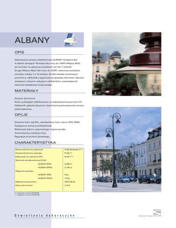 ALBANY OPIS Dekoracyjna oprawa oświetleniowa ALBANY dostępna jest w dwóch wersjach. Pierwsza dla mocy do 150W (Albany Midi) do montażu na zalecanej wysokości od 4 do 7 metrów. Druga (Albany Maxi) dla mocy do 250W i zalecanej wysokości montażu miedzy 7 a 10 metrem. Źródło światła montowane poziomo w odbłyśniku (ograniczenie zjawiska olśnienia). Oprawa dostepna z różnymi rodzajami odbłyśników, pozwalajacych dowolnie kształtować bryłę światła. MATERIAŁY Korpus: aluminium. Klosz: poliwęglan stabilizowany na oddziaływanie promieni UV. Odbłyśnik: głęboko tłoczone i chemicznie polerowane aluminium, jednoczęściowy. OPCJE Dowolny kolor wg RAL, standardowo kolor czarny (RAL 9005) Dostępna w wersji przewieszkowej Możliwość doboru optymalnego rozsyłu światła Automatyczna redukcja mocy Regulacja strumienia świetlnego CHARAKTERYSTYKA Szczelność komory optycznej: IP 66 (Sealsafe®)(*) Szczelność komory osprzętu: IP 44 (*) Odporność na uderzenie (PC): IK 08 (**) Oporność aerodynamiczna (CxS): - ALBANY MIDI: 0,098 m2 - ALBANY MAXI: 0,136 m2 - ALBANY MIDI: 8 kg Waga bez osprzętu: - ALBANY MAXI: 10 kg Napięcie znamionowe: 230 V/50 Hz Klasa ochronności: I lub II (*) zgodnie z normą EN 60598 (**) zgodnie z normą EN 50102 O ś w i e t l e n i e d e k o r a c y j n e Schréder Product ALBANY 1. Spun aluminium body 7. 1. Obudowa aluminiowa. 2. Coextruded polycarbonate protector 1. 3. Sealsafe® optical assembly (IP66) 2. Klosz wykonany z poliwęglanu (antywandal). 4. Disconnectable control gear plate 3. Odbłyśnik pełny wykonany z tłoczonego aluminium, 5. 5. Hinge komora lampy zabezpieczona systemem Sealsafe IP 66. 6. 1/4-turn screws to open and close the luminaire 4. Rozłączalna płytka z układem zasilającym. 7. Suspended mounting 4. 5. Zawias. 6. Śruby zamykające i otwierające oprawę. 3. 7. Układ montażowy na wysięgnik lub przewieszkę. 6. 2. WYMIARY ŹRÓDŁA ŚWIATŁA – RODZAJE ODBŁYŚNIKÓW Tabela mocy i odbłyśników Rodzaj źródła światła Kompaktowa lampa 1200 ALBANY MAXI 1564 50W (T) 50W (T) - lampa 70W (T) - Lampa metalohalogenkowa (MH) 1170 50W (T) 100W (T) 50W (T) 70W (T) 100W (T) 100W (T) 100W (T) 150W (T) 150W (T) 150W (T) - 250W (T) - 80W (E ) - 80W (E ) 80W (E ) - 80W (E ) - - - 70W (T) - - 100W (T)) - - - 150W (T) 250W (T) 150W (T) - Kompaktowa lampa 70W (T) - 70W (T) metalohalogenkowa 150W (T) - 150W (T) (CDM-T) T= źródła światła tubularne E= źródła światła elipsoidalne *dostępne inne typy odbłyśników (na zapytanie) Schréder Polska Sp. z o.o. ul. Prosta 69, 00-838 Warszawa Tel.: + 48 22 444 12 12 do 14, Fax : + 48 22 444 12 15 [email protected] www.schreder.com.pl Członek Schréder Group GIE 100W (T) Wysokoprężna 150W- (T) MONTAŻ 1312 100W (T) Lampa rtęciowa ALBANY - MIDI 1627 sodowa (SDW) sodowa (HPS) ALBANY - MAXI Rodzaj odbłyśnika * ALBANY MIDI