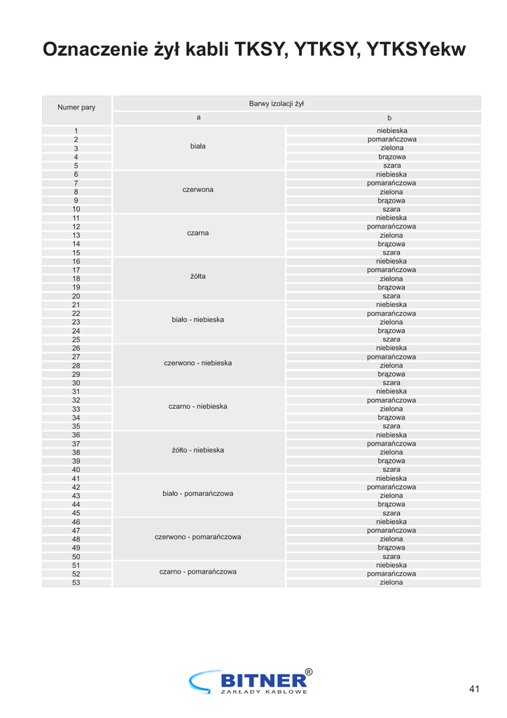Oznaczenie żył kabli TKSY, YTKSY, YTKSYekw