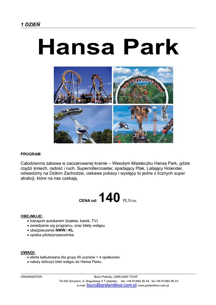 1 DZIEŃ Hansa Park PROGRAM: Całodzienna zabawa w zaczarowanej krainie – Wesołym Miasteczku Hansa Park, gdzie rządzi śmiech, radość i ruch. Superrollercoaster, spadający Ptak, Latający Holender, odwiedziny na Dzikim Zachodzie, ciekawe pokazy i występy to jedne z licznych super atrakcji, które na nas czekają. CENA od: 140 PLN/os. OBEJMUJE: transport autokarem (toaleta, barek, TV) zwiedzanie wg programu, oraz bilety wstępu ubezpieczenie NWW i KL opieka pilota/przewodnika UWAGI: oferta kalkulowana dla grupy 45 uczniów + 4 opiekunów należy doliczyć bilet wstępu do Hansa Parku ORGANIZATOR: Biuro Podróży „GRELAND TOUR” 70-440 Szczecin, ul. Bogusława X 7 (deptak), e-mail: fax: +48 91/882 90 44 , tel.+48 91/882 90 43 [email protected]; www.grelandtour.com.pl