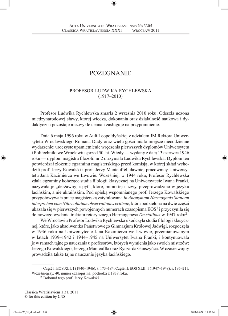 Acta Universitatis Wratislaviensis No 3305 Classica Wratislaviensia XXXI Wrocław 2011 Pożegnanie Profesor Ludwika Rychlewska (1917–2010) Profesor Ludwika Rychlewska zmarła 2 września 2010 roku. Odeszła uczona międzynarodowej sławy, której wiedza, dokonania oraz działalność naukowa i dydaktyczna pozostaje niezwykle cenna i zasługuje na przypomnienie. Dnia 6 maja 1996 roku w Auli Leopoldyńskiej z udziałem JM Rektora Uniwersytetu Wrocławskiego Romana Dudy oraz wielu gości miało miejsce niecodzienne wydarzenie: uroczyste upamiętnienie wręczenia pierwszych dyplomów Uniwersytetu i Politechniki we Wrocławiu sprzed 50 lat. Wtedy — wydany z datą 13 czerwca 1946 roku — dyplom magistra filozofii nr 2 otrzymała Ludwika Rychlewska. Dyplom ten potwierdzał złożenie egzaminu magisterskiego przed komisją, w której skład wchodzili prof. Jerzy Kowalski i prof. Jerzy Manteuffel, dawniej pracownicy Uniwersytetu Jana Kazimierza we Lwowie. Wcześniej, w 1944 roku, Profesor Rychlewska zdała egzaminy kończące studia filologii klasycznej na Uniwersytecie Iwana Franki, nazywała je „derżawnyj ispyt”, które, mimo tej nazwy, przeprowadzano w języku łacińskim, a nie ukraińskim. Pod opieką wspomnianego prof. Jerzego Kowalskiego przygotowywała pracę magisterską zatytułowaną In Anonymum Hermogenis Statuum interpretem cum Nilo collatum observationes criticae, która podzielona na dwie części ukazała się w pierwszych powojennych numerach czasopisma EOS1 i przyczyniła się do nowego wydania traktatu retorycznego Hermogenesa De statibus w 1947 roku2. We Wrocławiu Profesor Ludwika Rychlewska ukończyła studia filologii klasycznej, które, jako absolwentka Państwowego Gimnazjum Królowej Jadwigi, rozpoczęła w 1936 roku na Uniwersytecie Jana Kazimierza we Lwowie, przemianowanym w latach 1939–1942 i 1944–1945 na Uniwersytet Iwana Franki, i kontynuowała je w ramach tajnego nauczania u profesorów, których wymienia jako swoich mistrzów: Jerzego Kowalskiego, Jerzego Manteuffla oraz Ryszarda Ganszyńca. W czasie wojny prowadziła także tajne nauczanie języka łacińskiego. 1 Część I: EOS XLI, 1 (1940–1946), s. 173–184; Część II: EOS XLII, 1 (1947–1948), s. 195–211. Wcześniejszy, 40. numer czasopisma, pochodzi z 1939 roku. 2 Dokonał tego prof. Jerzy Kowalski. Classica Wratislaviensia 31, 2011 © for this edition by CNS ClassicaW_31_sklad.indb 159 2011-05-24 15:12:04 160 pożegnanie Życie naukowe Profesor Ludwiki Rychlewskiej związane było od 1945 roku z Uniwersytetem Wrocławskim. Wtedy przybyła do Wrocławia i wraz z kilkoma innymi pionierami urządzała pomieszczenia filologii klasycznej przy ulicy Szewskiej 49 oraz porządkowała i uzupełniała poniemiecki księgozbiór. Przez wiele lat pracy w Instytucie Filologii Klasycznej i Kultury Antycznej Uniwersytetu Wrocławskiego, otrzymała wszystkie stopnie i tytuły naukowe: magistra (1946), doktora filozofii (1951), doktora habilitowanego (1961), profesora nadzwyczajnego (1972) oraz profesora zwyczajnego (1983). Nie przerwała pracy naukowej także po przejściu na emeryturę w 1987 roku. Zainteresowania badawcze Profesor Ludwiki Rychlewskiej dotyczyły przede wszystkim literatury antycznej, zwłaszcza zachowanej fragmentarycznie, w której szczególne miejsce zajmowały epos oraz tragedia i komedia. Badania nad dziełem leksykografa Noniusza De compendiosa doctrina, uzupełniające wyniki badań światowych uczonych (między innymi Wallace’a Martina Lindsaya) stanowiły podstawę do przyznania jej tytułu doktora filozofii w 1951 roku. Dysertacja Quaestiones Nonianae została wkrótce opublikowana w serii Tragica II („Prace Wrocławskiego Towarzystwa Naukowego. Seria A” 54, 1954, s. 105–132). Uroczyste odnowienie doktoratu po 50 latach odbyło się 26 czerwca 2001 roku w Auli Leopoldyńskiej Uniwersytetu Wrocławskiego. W następnych latach ów autor — Noniusz — także pozostawał w kręgu zainteresowań Uczonej. Poświęcono mu kolejne artykuły De Lucretii exemplari a Nonio Marcello adhibito3, De Nonii comoediarum Naevianarum notitia4, a także w genewskich „Studi Noniani” z 1983 roku pracę zatytułowaną De Titinii memoria apud Nonium servata. Owocem zainteresowań literaturą rzymską zachowaną fragmentarycznie był także artykuł mówiący o tragedii Iphigenia Kwintusa Enniusza, która, jak udowodniła badaczka, była źródłem rzymskiej wersji mitu zawartej w poemacie De rerum natura Lukrecjusza (I 62–101)5. Poważna część dorobku naukowego Pani Profesor dotyczy innego autora rzymskiej komedii zachowanej fragmentarycznie, a mianowicie Turpiliusza Jako pierwszy ukazał się artykuł zatytułowany Turpiliusz i jego komedie, który był publikacją referatu wygłoszonego 21 września 1958 roku na posiedzeniu Komitetu Nauk o Kulturze Antycznej PAN6, następnie dwa inne artykuły także poświęcone były temu twórcy komedii rzymskiej7. Ukoronowaniem zainteresowań Profesor Ludwiki Rychlewskiej było wydanie krytyczne fragmentów komedii Turpiliusza wraz ze Wstępem i bogatym komentarzem: Turpilii comici fragmenta edidit, commentario critico et exegetico instruxit, 3 EOS LIV 2, 1964, s. 263–283. LVII 2, 1967/68, s. 203–210. 5 De Ennii Iphigenia, EOS XLIX, 1958, s. 71–81. 6 „Sprawozdania z Prac Naukowych Wydziału Nauk Społecznych PAN” 1960, s. 38–40. 7 Turpiliana, EOS LI 1, 1961, s. 85–88 oraz O Turpiliuszu słów kilka, „Meander” XIII, 1963, s. 375–391. 4 EOS Classica Wratislaviensia 31, 2011 © for this edition by CNS ClassicaW_31_sklad.indb 160 2011-05-24 15:12:04 Pożegnanie 161 quaestiones Turpilianas praemisit Ludovica Rychlewska, Wratislaviae 1962 („Prace Wrocławskiego Towarzystwa Naukowego. Seria A”, s. 1–108). Praca ta uzyskała wiele pochlebnych recenzji (Nino Scivoletto8, Ettore Paratore9 czy W.G. Arnott10) i stanowiła podstawę habilitacji Uczonej (16 października 1961 roku). O znaczeniu tej publikacji świadczy doskonale