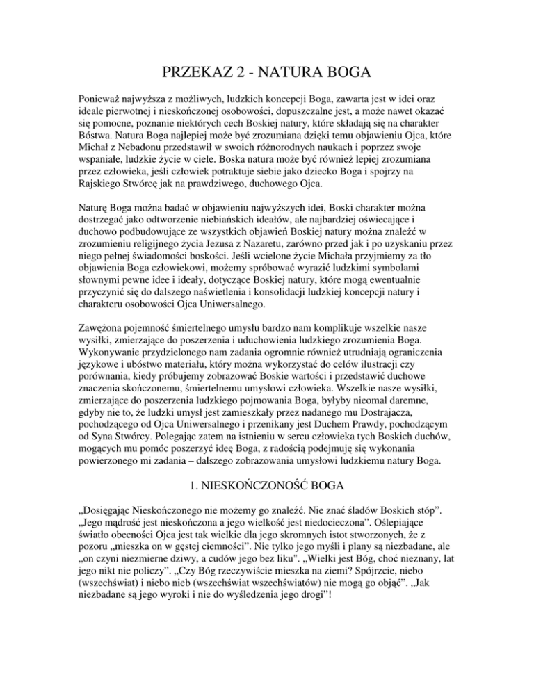 PRZEKAZ 2 - NATURA BOGA Ponieważ najwyższa z możliwych, ludzkich koncepcji Boga, zawarta jest w idei oraz ideale pierwotnej i nieskończonej osobowości, dopuszczalne jest, a może nawet okazać się pomocne, poznanie niektórych cech Boskiej natury, które składają się na charakter Bóstwa. Natura Boga najlepiej może być zrozumiana dzięki temu objawieniu Ojca, które Michał z Nebadonu przedstawił w swoich różnorodnych naukach i poprzez swoje wspaniałe, ludzkie życie w ciele. Boska natura może być również lepiej zrozumiana przez człowieka, jeśli człowiek potraktuje siebie jako dziecko Boga i spojrzy na Rajskiego Stwórcę jak na prawdziwego, duchowego Ojca. Naturę Boga można badać w objawieniu najwyższych idei, Boski charakter można dostrzegać jako odtworzenie niebiańskich ideałów, ale najbardziej oświecające i duchowo podbudowujące ze wszystkich objawień Boskiej natury można znaleźć w zrozumieniu religijnego życia Jezusa z Nazaretu, zarówno przed jak i po uzyskaniu przez niego pełnej świadomości boskości. Jeśli wcielone życie Michała przyjmiemy za tło objawienia Boga człowiekowi, możemy spróbować wyrazić ludzkimi symbolami słownymi pewne idee i ideały, dotyczące Boskiej natury, które mogą ewentualnie przyczynić się do dalszego naświetlenia i konsolidacji ludzkiej koncepcji natury i charakteru osobowości Ojca Uniwersalnego. Zawężona pojemność śmiertelnego umysłu bardzo nam komplikuje wszelkie nasze wysiłki, zmierzające do poszerzenia i uduchowienia ludzkiego zrozumienia Boga. Wykonywanie przydzielonego nam zadania ogromnie również utrudniają ograniczenia językowe i ubóstwo materiału, który można wykorzystać do celów ilustracji czy porównania, kiedy próbujemy zobrazować Boskie wartości i przedstawić duchowe znaczenia skończonemu, śmiertelnemu umysłowi człowieka. Wszelkie nasze wysiłki, zmierzające do poszerzenia ludzkiego pojmowania Boga, byłyby nieomal daremne, gdyby nie to, że ludzki umysł jest zamieszkały przez nadanego mu Dostrajacza, pochodzącego od Ojca Uniwersalnego i przenikany jest Duchem Prawdy, pochodzącym od Syna Stwórcy. Polegając zatem na istnieniu w sercu człowieka tych Boskich duchów, mogących mu pomóc poszerzyć ideę Boga, z radością podejmuję się wykonania powierzonego mi zadania – dalszego zobrazowania umysłowi ludzkiemu natury Boga. 1. NIESKOŃCZONOŚĆ BOGA „Dosięgając Nieskończonego nie możemy go znaleźć. Nie znać śladów Boskich stóp”. „Jego mądrość jest nieskończona a jego wielkość jest niedocieczona”. Oślepiające światło obecności Ojca jest tak wielkie dla jego skromnych istot stworzonych, że z pozoru „mieszka on w gęstej ciemności”. Nie tylko jego myśli i plany są niezbadane, ale „on czyni niezmierne dziwy, a cudów jego bez liku". „Wielki jest Bóg, choć nieznany, lat jego nikt nie policzy”. „Czy Bóg rzeczywiście mieszka na ziemi? Spójrzcie, niebo (wszechświat) i niebo nieb (wszechświat wszechświatów) nie mogą go objąć”. „Jak niezbadane są jego wyroki i nie do wyśledzenia jego drogi”! „Jest tylko jeden Bóg, Ojciec nieskończony, Stwórca, on wiary dochowuje”. „Boski Stwórca jest również Wszechświatowym Władcą, źródłem i przeznaczeniem dusz. Jest Najwyższą Duszą, Pierwotnym Umysłem i Bezgranicznym Duchem całego stworzenia”. „Wielki Władca nie popełnia błędów. Jest wspaniały w swym majestacie i chwale”. „Stwórca Bóg zupełnie nie ma lęku i wrogości. Jest nieśmiertelny, wieczny, samoistny, boski i łaskawy”. „Jak czysty i piękny, jak wnikliwy i niezgłębiony jest niebiański Protoplasta wszystkich rzeczy”! „Nieskończony najdoskonalszy jest w tym, że użycza siebie człowiekowi. On jest początkiem i końcem, Ojcem każdego dobrego i doskonałego celu”. „U Boga wszystkie rzeczy są możliwe; wieczny Stwórca jest przyczyną przyczyn”. Pomimo nieskończoności zdumiewających przejawów wiecznej i uniwersalnej osobowości Ojca, uświadamia on sobie w pełni zarówno swą nieskończoność jak i wieczność; zna on również dokładnie swą doskonałość i moc. Jest on jedyną istotą we wszechświecie, oprócz równorzędnych mu Boskich istot, która doznaje doskonałej, właściwej i kompletnej oceny samego siebie. Ojciec wytrwale i niezawodnie wychodzi naprzeciw rozlicznym wymaganiom, jakie stawiają przed nim zmiany, zachodzące od czasu do czasu w różnych częściach wszechświata nadrzędnego. Wielki Bóg zna i rozumie siebie, uświadamia sobie w sposób nieskończony wszystkie swoje podstawowe atrybuty doskonałości. Bóg nie jest kosmicznym przypadkiem, nie jest również wszechświatowym eksperymentatorem. Władcy Wszechświatów mogą ryzykować, Ojcowie Konstelacji mogą eksperymentować, głowy systemu mogą praktykować, ale Ojciec Uniwersalny widzi koniec od początku, a jego Boski plan i wieczny cel zawiera oraz obejmuje wszystkie eksperymenty i wszystkie przygody wszystkich podwładnych, w każdym świecie, systemie i konstelacji, w każdym wszechświecie jego rozległych domen. Żadna rzecz nie jest nowością dla Boga a żadne kosmiczne zdarzenie nigdy nie jest dlań niespodzianką; on zamieszkuje okrąg wieczności. Dni jego nie mają początku ani końca. Dla Boga nie ma ani przeszłości, ani teraźniejszości czy przyszłości; cały jego czas jest teraźniejszy w każdej danej chwili. On jest wielkim i jedynym JESTEM. Ojciec Uniwersalny jest absolutnie i bezwarunkowo nieskończony we wszystkich swych atrybutach i ten fakt, sam w sobie i sam z siebie, automatycznie wyklucza go ze wszystkich bezpośrednich, osobistych kontaktów ze skończonymi, materialnymi istotami jak i z innymi stworzonymi istotami inteligentnymi niższego poziomu. I we wszystkich takich przypadkach zarządzone zostały odpowiednie adaptacje, umożliwiające kontakt i komunikację z różnorodnymi jego istotami; po pierwsze, w osobowościach Ra