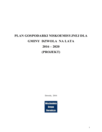 PLAN GOSPODARKI NISKOEMISYJNEJ DLA GMINY DZWOLA NA LATA 2016 – 2020 (PROJEKT) Dzwola, 2016 1 SPIS TREŚCI STR. 1. STRESZCZENIE........................................................................................................................................... 6 2. WSTĘP .......................................................................................................................................................... 9 2.1. WPROWADZENIE ................................................................................................................................ 9 2.2. CEL OPRACOWANIA ........................................................................................................................ 10 2.3. ZAKRES OPRACOWANIA ................................................................................................................ 10 2.4. UWARUNKOWANIA MIĘDZYNARODOWE, KRAJOWE, REGIONALNE I LOKALNE .......... 11 3. CHARAKTERYSTYKA GMINY DZWOLA ........................................................................................... 18 3.1. PODZIAŁ ADMINISTRACYJNY I POŁOŻENIE ............................................................................. 18 3.2. WARUNKI DEMOGRAFICZNE ........................................................................................................ 20 3.3. INFRASTRUKTURA SPOŁECZNA I TECHNICZNA ..................................................................... 20 3.4. INFRASTRUKTURA TECHNICZNA ................................................................................................ 22 3.5. ROLNICTWO I DZIAŁALNOŚĆ GOSPODARCZA......................................................................... 23 3.5. WARUNKI ŚRODOWISKOWE ......................................................................................................... 24 3.6. IDENTYFIKACJA PROBLEMÓW W ZAKRESIE NISKIEJ EMISJI W GMINIE DZWOLA ........ 27 3.7. DOTYCHCZASOWE DZIAŁANIA W ZAKRESIE LIKWIDACJI EMISJI ..................................... 30 4. WYNIKI BAZOWEJ INWENTARYZACJI EMISJI DWUTLENKU WĘGLA I INNYCH GAZÓW ..... 31 4.1 ZAŁOŻENIA METODYCZNE DO PRZYGOTOWANIA PLANU GOSPODARKI NISKOEMISYJNEJ (PGN) .............................................................................................................. 31 4.2. ŹRÓDŁA EMISJI NA TERENIE GMINY DZWOLA ....................................................................... 32 4.3. EMISJA POWIERZCHNIOWA W GMINIE DZWOLA ................................................................... 33 4.4. EMISJA LINIOWA (Z TRANSPORTU) W GMINIE DZWOLA ...................................................... 38 4.5. EMISJA Z WYKORZYSTANIA ENERGII ELEKTRYCZNEJ ......................................................... 42 4.6. STRUKTURA ZUŻYCIA ENERGII FINALNEJ I EMISJI CO2 ........................................................ 43 5. DZIAŁANIA I ŚRODKI ZAPLANOWANE NA CAŁY OKRES OBJĘTY PLANEM ............................ 45 2 5.1. ZAKRES DZIAŁAŃ NA SZCZEBLU GMINY.................................................................................. 46 5.2. TERMOMODERNIZACJA BUDYNKÓW STANOWIĄCYCH WŁASNOŚĆ GMINY .................. 46 5.3. ZAINTERESOWANIE SPOŁECZNOŚCI LOKALNEJ DZIAŁANIAMI NA RZECZ REDUKCJI EMISJI CO2 ....................................................................................................................................... 47 5.4. WYKORZYSTANIE ENERGII SŁONECZNEJ DO PRODUKCJI ENERGII ELEKTRYCZNEJ ... 48 5.5. WYKORZYSTANIE ENERGII SŁONECZNEJ DO PRODUKCJI ENERGII CIEPLNEJ ............... 50 5.6. KOTŁY NA BIOMASĘ ....................................................................................................................... 52 5.7. TRANSPORT I CIĄGNIKI ROLNICZE ............................................................................................. 53 5.8. WYMIANA OŚWIETLENIA ULICZNEGO ...................................................................................... 53 5.9. DZIAŁANIA KRÓTKOTERMINOWE ............................................................................................. 53 5.10. EFEKTY DZIAŁAŃ NA RZECZ OGRANICZANIA EMISJI ......................................................... 53 6. ASPEKTY ORGANIZACYJNE I FINANSOWE ...................................................................................... 58 6.1. ORGANIZACJA DZIAŁAŃ................................................................................................................ 58 6.2. ZASOBY LUDZKIE I DOŚWIADCZENIE ........................................................................................ 58 6.3. BUDŻET I ŹRÓDŁA FINANSOWANIA ........................................................................................... 59 6.4. STOSOWANIE SYSTEMU TZW. ZIELONYCH ZAMÓWIEŃ PUBLICZNYCH .......................... 59 6.5. HARMONOGRAM ZADANIOWO-CZASOWY ............................................................................... 60 7. MONITORING I OCENA .......................................................................................................................... 62 8. PODSUMOWANIE .................................................................................................................................... 63 9. BIBLIOGRAFIA ......................................................................................................................................... 64 10. ZAŁĄCZNIKI: .......................................................................................................................................... 65 3 SPIS RYSUNKÓW Rys. 3.1. Położenie Gminy Dzwola Rys. 3.2. Układ osadniczy i komunikacyjny Gminy Dzwola Rys. 3.3. Średnioroczne sumy usłonecznienia godz./rok dla reprezentatywnych rejonów Polski Rys. 3.4. Strefy energetyczne wiatru w Polsce Rys. 3.5. Zanieczyszczenia powietrza w województwie lubelskim Rys. 4.1. Struktura wiekowa budynków mieszkalnych Rys. 4.2. Struktura paliw wykorzystywanych na cele gr