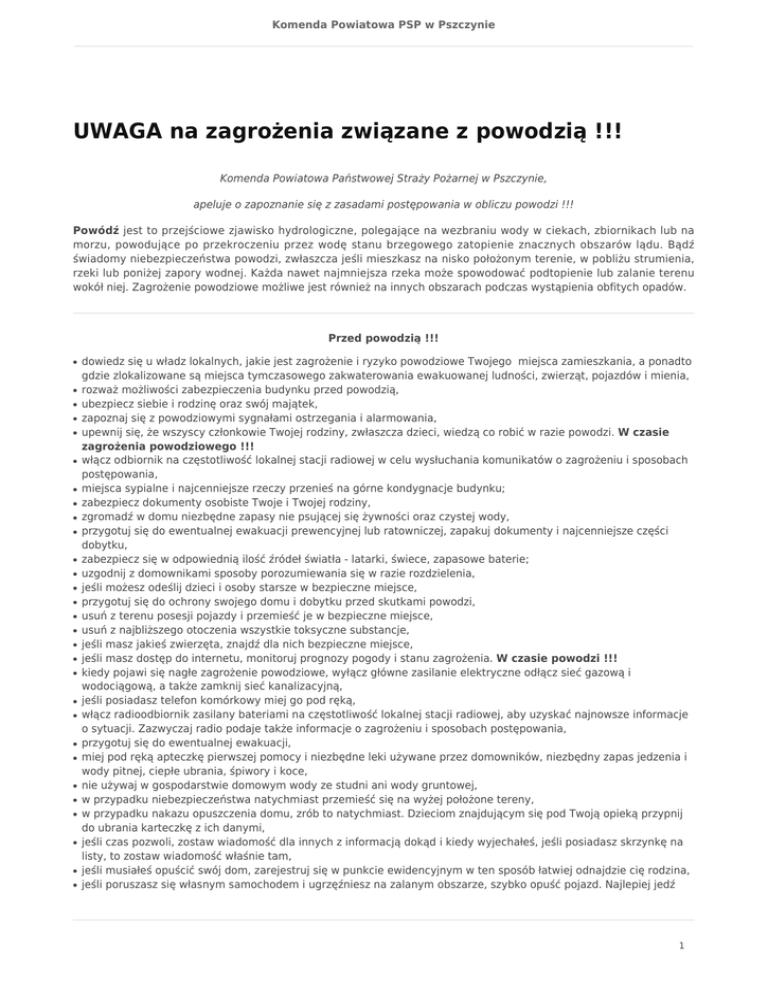 Komenda Powiatowa PSP w Pszczynie UWAGA na zagrożenia związane z powodzią !!! Komenda Powiatowa Państwowej Straży Pożarnej w Pszczynie, apeluje o zapoznanie się z zasadami postępowania w obliczu powodzi !!! Powódź jest to przejściowe zjawisko hydrologiczne, polegające na wezbraniu wody w ciekach, zbiornikach lub na morzu, powodujące po przekroczeniu przez wodę stanu brzegowego zatopienie znacznych obszarów lądu. Bądź świadomy niebezpieczeństwa powodzi, zwłaszcza jeśli mieszkasz na nisko położonym terenie, w pobliżu strumienia, rzeki lub poniżej zapory wodnej. Każda nawet najmniejsza rzeka może spowodować podtopienie lub zalanie terenu wokół niej. Zagrożenie powodziowe możliwe jest również na innych obszarach podczas wystąpienia obfitych opadów. Przed powodzią !!! ● ● ● ● ● ● ● ● ● ● ● ● ● ● ● ● ● ● ● ● ● ● ● ● ● ● ● ● ● dowiedz się u władz lokalnych, jakie jest zagrożenie i ryzyko powodziowe Twojego miejsca zamieszkania, a ponadto gdzie zlokalizowane są miejsca tymczasowego zakwaterowania ewakuowanej ludności, zwierząt, pojazdów i mienia, rozważ możliwości zabezpieczenia budynku przed powodzią, ubezpiecz siebie i rodzinę oraz swój majątek, zapoznaj się z powodziowymi sygnałami ostrzegania i alarmowania, upewnij się, że wszyscy członkowie Twojej rodziny, zwłaszcza dzieci, wiedzą co robić w razie powodzi. W czasie zagrożenia powodziowego !!! włącz odbiornik na częstotliwość lokalnej stacji radiowej w celu wysłuchania komunikatów o zagrożeniu i sposobach postępowania, miejsca sypialne i najcenniejsze rzeczy przenieś na górne kondygnacje budynku; zabezpiecz dokumenty osobiste Twoje i Twojej rodziny, zgromadź w domu niezbędne zapasy nie psującej się żywności oraz czystej wody, przygotuj się do ewentualnej ewakuacji prewencyjnej lub ratowniczej, zapakuj dokumenty i najcenniejsze części dobytku, zabezpiecz się w odpowiednią ilość źródeł światła - latarki, świece, zapasowe baterie; uzgodnij z domownikami sposoby porozumiewania się w razie rozdzielenia, jeśli możesz odeślij dzieci i osoby starsze w bezpieczne miejsce, przygotuj się do ochrony swojego domu i dobytku przed skutkami powodzi, usuń z terenu posesji pojazdy i przemieść je w bezpieczne miejsce, usuń z najbliższego otoczenia wszystkie toksyczne substancje, jeśli masz jakieś zwierzęta, znajdź dla nich bezpieczne miejsce, jeśli masz dostęp do internetu, monitoruj prognozy pogody i stanu zagrożenia. W czasie powodzi !!! kiedy pojawi się nagłe zagrożenie powodziowe, wyłącz główne zasilanie elektryczne odłącz sieć gazową i wodociągową, a także zamknij sieć kanalizacyjną, jeśli posiadasz telefon komórkowy miej go pod ręką, włącz radioodbiornik zasilany bateriami na częstotliwość lokalnej stacji radiowej, aby uzyskać najnowsze informacje o sytuacji. Zazwyczaj radio podaje także informacje o zagrożeniu i sposobach postępowania, przygotuj się do ewentualnej ewakuacji, miej pod ręką apteczkę pierwszej pomocy i niezbędne leki używane przez domowników, niezbędny zapas jedzenia i wody pitnej, ciepłe ubrania, śpiwory i koce, nie używaj w gospodarstwie domowym wody ze studni ani wody gruntowej, w przypadku niebezpieczeństwa natychmiast przemieść się na wyżej położone tereny, w przypadku nakazu opuszczenia domu, zrób to natychmiast. Dzieciom znajdującym się pod Twoją opieką przypnij do ubrania karteczkę z ich danymi, jeśli czas pozwoli, zostaw wiadomość dla innych z informacją dokąd i kiedy wyjechałeś, jeśli posiadasz skrzynkę na listy, to zostaw wiadomość właśnie tam, jeśli musiałeś opuścić swój dom, zarejestruj się w punkcie ewidencyjnym w ten sposób łatwiej odnajdzie cię rodzina, jeśli poruszasz się własnym samochodem i ugrzęźniesz na zalanym obszarze, szybko opuść pojazd. Najlepiej jedź 1 Komenda Powiatowa PSP w Pszczynie ● ● ● ● ● ● ● ● ● ● ● ● ● ● ● ● ● ● ● ● ● ● ● ● ● ● ● ● tylko drogami wyznaczonymi przez władze, jeżeli woda szybko się przemieszcza, nie chodź po zalanych obszarach, postaraj się nie panikować, bądź rozsądny, zachowaj trzeźwość umysłu, staraj się pomagać innym, w tym podmiotom ratowniczym. Po powodzi !!! słuchaj komunikatów radiowych i telewizyjnych, jak najdłużej pozostań poza zasięgiem wód powodziowych i zatorów lodowych, nie wracaj do domu dopóki władze nie ogłoszą, że jest to bezpieczne oraz nie zostanie przywrócone zaopatrzenie w podstawowe media, sprawdź konstrukcję i fundamenty swojego domu (pęknięcia lub inne uszkodzenia), sprawdź instalację elektryczną i gazową oraz inne media, jeśli to możliwe, przed przystąpieniem do usuwania skutków powodzi w Twoim domu zrób zdjęcia bądź zapis wideo zastanych uszkodzeń, w ramach możliwości włącz się do pomocy w usuwaniu skutków powodzi - zalane pomieszczenia zdezynfekuj, wywietrz, wysusz i odmaluj, wyrzuć całą żywność, która miała kontakt z wodą powodziową - spożywaj tylko wodę butelkowaną lub dowożonej beczkowozami przeznaczonymi dowody pitnej Pamiętaj !!! nie uszkadzaj wałów przeciwpowodziowych, nie przejeżdżaj przez wały, z wyjątkiem miejsc do tego przeznaczonych, nie uprawiaj gruntu przy wałach w odległości co najmniej 3m od wału, nie sadź drzew na wałach, nie uszkadzaj umocnień, nie stawiaj budynków, nie kop studni, sadzawek, dołów oraz rowów w odległości mniejszej niż 50 m od stopy wału. Telefony alarmowe !!! Europejski Numer Alarmowy 112. Państwowa Straż Pożarna 998, Pogotowie Ratunkowe 999, Policja 997, Straż Miejska 986, Wymachując w czasie powodzi kolorową flagą lub kawałkiem materiału, możesz prosić o pomoc !!! Flaga biała - chcesz opuścić miejsce w którym jesteś, Flaga czerwona - potrzebna pomoc medyczna, Flaga niebieska - prosisz o jedzenie i wodę. Znaki sygnalizacyjne 