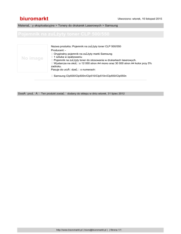 biuromarkt Utworzono: wtorek, 10 listopad 2015 MateriaĹ y eksploatacyjne > Tonery do drukarek Laserowych > Samsung Pojemnik na zuĹźyty toner CLP 500/550 Nazwa produktu: Pojemnik na zuĹźyty toner CLP 500/550 No image Producent: Oryginalny pojemnik na zuĹźyty marki Samsung 1 sztuka w opakowaniu Pojemnik na zuĹźyty toner do stosowania w drukarkach laserowych. Wystarcza na okoĹ o 12 000 stron A4 mono oraz 30 000 stron A4 kolor przy 5% zadruku. Pasuje do urzÄ dzeĹ o numerach: Samsung Clp500/Clp500n/Clp510/Clp510n/Clp550/Clp550n DostÄ pnoĹ Ä : Ten produkt zostaĹ dodany do sklepu w dniu wtorek, 31 lipiec 2012 http://www.biuromarkt.pl | [email protected] | | Strona 1/1