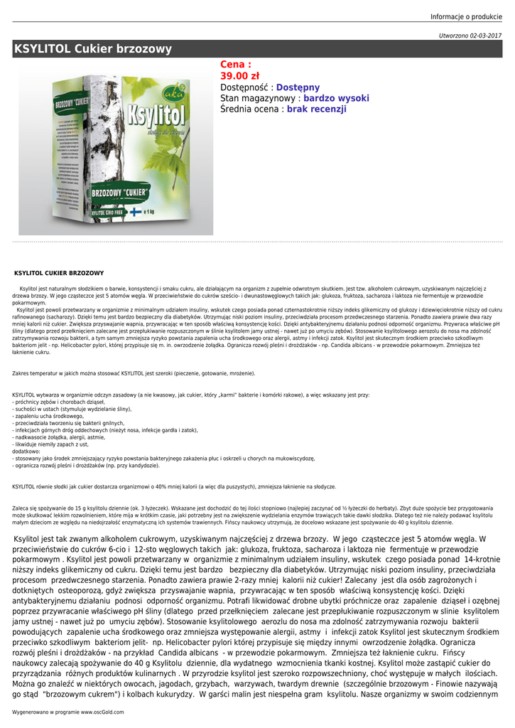Informacje o produkcie Utworzono 02-03-2017 KSYLITOL Cukier brzozowy Cena : 39.00 zł Dostępność : Dostępny Stan magazynowy : bardzo wysoki Średnia ocena : brak recenzji KSYLITOL CUKIER BRZOZOWY Ksylitol jest naturalnym słodzikiem o barwie, konsystencji i smaku cukru, ale działającym na organizm z zupełnie odwrotnym skutkiem. Jest tzw. alkoholem cukrowym, uzyskiwanym najczęściej z drzewa brzozy. W jego cząsteczce jest 5 atomów węgla. W przeciwieństwie do cukrów sześcio- i dwunastowęglowych takich jak: glukoza, fruktoza, sacharoza i laktoza nie fermentuje w przewodzie pokarmowym. Ksylitol jest powoli przetwarzany w organizmie z minimalnym udziałem insuliny, wskutek czego posiada ponad czternastokrotnie niższy indeks glikemiczny od glukozy i dziewięciokrotnie niższy od cukru rafinowanego (sacharozy). Dzięki temu jest bardzo bezpieczny dla diabetyków. Utrzymując niski poziom insuliny, przeciwdziała procesom przedwczesnego starzenia. Ponadto zawiera prawie dwa razy mniej kalorii niż cukier. Zwiększa przyswajanie wapnia, przywracając w ten sposób właściwą konsystencję kości. Dzięki antybakteryjnemu działaniu podnosi odporność organizmu. Przywraca właściwe pH śliny (dlatego przed przełknięciem zalecane jest przepłukiwanie rozpuszczonym w ślinie ksylitolem jamy ustnej - nawet już po umyciu zębów). Stosowanie ksylitolowego aerozolu do nosa ma zdolność zatrzymywania rozwoju bakterii, a tym samym zmniejsza ryzyko powstania zapalenia ucha środkowego oraz alergii, astmy i infekcji zatok. Ksylitol jest skutecznym środkiem przeciwko szkodliwym bakteriom jelit - np. Helicobacter pylori, której przypisuje się m. in. owrzodzenie żołądka. Ogranicza rozwój pleśni i drożdżaków - np. Candida albicans - w przewodzie pokarmowym. Zmniejsza też łaknienie cukru. Zakres temperatur w jakich można stosować KSYLITOL jest szeroki (pieczenie, gotowanie, mrożenie). KSYLITOL wytwarza w organizmie odczyn zasadowy (a nie kwasowy, jak cukier, który „karmi” bakterie i komórki rakowe), a więc wskazany jest przy: - próchnicy zębów i chorobach dziąseł, - suchości w ustach (stymuluje wydzielanie śliny), - zapaleniu ucha środkowego, - przeciwdziała tworzeniu się bakterii gnilnych, - infekcjach górnych dróg oddechowych (nieżyt nosa, infekcje gardła i zatok), - nadkwasocie żołądka, alergii, astmie, - likwiduje niemiły zapach z ust, dodatkowo: - stosowany jako środek zmniejszający ryzyko powstania bakteryjnego zakażenia płuc i oskrzeli u chorych na mukowiscydozę, - ogranicza rozwój pleśni i drożdżaków (np. przy kandydozie). KSYLITOL równie słodki jak cukier dostarcza organizmowi o 40% mniej kalorii (a więc dla puszystych), zmniejsza łaknienie na słodycze. Zaleca się spożywanie do 15 g ksylitolu dziennie (ok. 3 łyżeczek). Wskazane jest dochodzić do tej ilości stopniowo (najlepiej zaczynać od ½ łyżeczki do herbaty). Zbyt duże spożycie bez przygotowania może skutkować lekkim rozwolnieniem, które mija w krótkim czasie, jaki potrzebny jest na zwiększenie wydzielania enzymów trawiących takie dawki słodzika. Dlatego też nie należy podawać ksylitolu małym dzieciom ze względu na niedojrzałość enzymatyczną ich systemów trawiennych. Fińscy naukowcy utrzymują, że docelowo wskazane jest spożywanie do 40 g ksylitolu dziennie. Ksylitol jest tak zwanym alkoholem cukrowym, uzyskiwanym najczęściej z drzewa brzozy. W jego cząsteczce jest 5 atomów węgla. W przeciwieństwie do cukrów 6-cio i 12-sto węglowych takich jak: glukoza, fruktoza, sacharoza i laktoza nie fermentuje w przewodzie pokarmowym . Ksylitol jest powoli przetwarzany w organizmie z minimalnym udziałem insuliny, wskutek czego posiada ponad 14-krotnie niższy indeks glikemiczny od cukru. Dzięki temu jest bardzo bezpieczny dla diabetyków. Utrzymując niski poziom insuliny, przeciwdziała procesom przedwczesnego starzenia. Ponadto zawiera prawie 2-razy mniej kalorii niż cukier! Zalecany jest dla osób zagrożonych i dotkniętych osteoporozą, gdyż zwiększa przyswajanie wapnia, przywracając w ten sposób właściwą konsystencję kości. Dzięki antybakteryjnemu działaniu podnosi odporność organizmu. Potrafi likwidować drobne ubytki próchnicze oraz zapalenie dziąseł i ozębnej poprzez przywracanie właściwego pH śliny (dlatego przed przełknięciem zalecane jest przepłukiwanie rozpuszczonym w slinie ksylitolem jamy ustnej - nawet już po umyciu zębów). Stosowanie ksylitolowego aerozlu do nosa ma zdolność zatrzymywania rozwoju bakterii powodujących zapalenie ucha środkowego oraz zmniejsza występowanie alergii, astmy i infekcji zatok Ksylitol jest skutecznym środkiem przeciwko szkodliwym bakteriom jelit- np. Helicobacter pylori której przypisuje się między innymi owrzodzenie żołądka. Ogranicza rozwój pleśni i drożdżaków - na przykład Candida albicans - w przewodzie pokarmowym. Zmniejsza też łaknienie cukru. Fińscy naukowcy zalecają spożywanie do 40 g Ksylitolu dziennie, dla wydatnego wzmocnienia tkanki kostnej. Ksylitol może zastąpić cukier do przyrządzania różnych produktów kulinarnych . W przyrodzie ksylitol jest szeroko rozpowszechniony, choć występuje w małych ilościach. Można go znaleźć w niektórych owocach, jagodach, grzybach, warzywach, twardym drewnie (szczególnie brzozowym - Finowie nazywają go stąd "brzozowym cukrem") i kolbach kukurydzy. W garści malin jest niespełna gram ksylitolu. Nasze organizmy w swoim codziennym Wygenerowano w programie www.oscGold.com metabolizmie używają ksylitolu, produkując go w ilości 15 gramów z różnych źródeł pokarmu. Przez organizm ludzki ksylitol jest powoli stopniowo przyswajany, osiągając wartość kaloryczną niższą o 40% niż inne węglowodany. Z tych względów daje on w efekcie istotnie zmniejszone: wzrost poziomu glukozy we krwi oraz reakcję insulinową organizmu na wchłanianie glukozy (o przeszło 60% serum insuliny mniej w