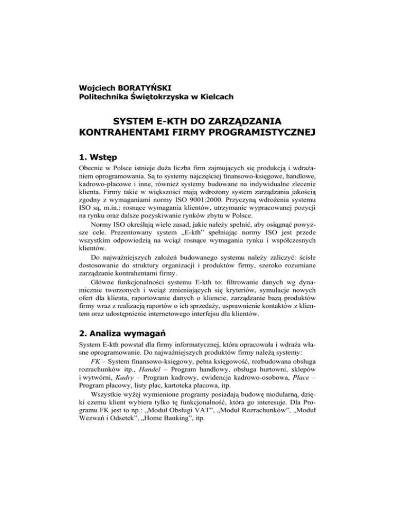 system e-kth do zarządzania kontrahentami firmy programistycznej