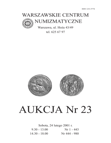 ISSN 1231-577X WARSZAWSKIE CENTRUM NUMIZMATYCZNE Warszawa, ul. Ho˝a 43/49 tel. 625 67 97 AUKCJA Nr 23 Sobota, 24 lutego 2001 r. 9.30 - 13.00 Nr 1 - 443 14.30 - 18.00 Nr 444 - 980 Miejsce aukcji i gie∏dy numizmatycznej Miejsce aukcji: Powszechny Bank Kredytowy ul. Nowogrodzka 50 I pi´tro - sala konferencyjna Miejsce gie∏dy numizmatycznej: IX Liceum Ogólnokszta∏càce im. Klementyny Hoffmanowej ul. Emilii Plater 29 Warszawskie Centrum Numizmatyczne ul. Ho˝a 43/49 WARSZAWSKIE CENTRUM NUMIZMATYCZNE Warszawa, ul. Ho˝a 43/49 tel. (0-22) 625 67 97 fax. (0-22) 625 69 47 http://www.wcn.pl e-mail: [email protected] AUKCJA Nr 23 Sobota, 24 lutego 2001 r. 9.30 - 13.00 Nr 1 - 443 14.30 - 18.00 Nr 444 - 980 MIEJSCE AUKCJI Powszechny Bank Kredytowy Warszawa, ul. Nowogrodzka 50 Przedmioty wystawione na aukcj´ b´dà udost´pnione do oglàdania z chwilà wydania katalogu aukcyjnego w biurze spó∏ki przy ulicy Ho˝ej 43/49 w Warszawie od 5 lutego do 23 lutego 2001 r. w godzinach od 10.00 do 18.00 oraz wyjàtkowo dla osób spoza Warszawy w dniu aukcji t.j. 24 lutego 2001 r. od godziny 8.30 w miejscu aukcji (Warszawa, ul. Nowogrodzka 50). Tabela stanów zachowania Polska St. Lustrz. Niemcy Polierte Platte (PP) Wielka Brytania Proof I Stempelglanz (Stgl) Uncirculated (Unc) II Vorzüglich (Vzgl) Extremely Fine (EF) III Sehr Schön (SS) Very Fine (VF) IV Schön (S) Fine (F) V Sehr Gut Very Good (VG) Opis przedmiotów, wycena i uk∏ad katalogu: Robert Buczak, Ryszard Kondrat, Jan W´c∏awski i Krystyna Zieliƒska Zdj´cia monet wykonali Kazimierz Ba∏akier i Hanna Kuszewska Sk∏ad komputerowy: Marek Kondrat i Daniel Maksymiuk Kolejnà Profesjonalnà Gie∏d´ Numizmatycznà, planujemy na niedziel´ 25 lutego 2001 w sali gimnastycznej Liceum Ogólnokszta∏càcego im. Klementyny Hoffmanowej w Warszawie, ul. Emilii Plater 29 w godzinach od 9.00 do 14.00. Kolejna 24 aukcja odb´dzie si´ 9.06.2001 r. Przedmioty na aukcj´ przyjmujemy stale w biurze spó∏ki ul. Ho˝a 43/49, Warszawa, w terminie do 13.04.2001 r. JesteÊmy obecni na wszystkich wi´kszych gie∏dach kolekcjonerskich w Polsce, gdzie równie˝ mo˝na przekazaç nam przedmioty na aukcj´. Wszelkie prawa zastrze˝one naÊwietlanie i druk: Semafic, Warszawa ul. Borzymowska 28 REGULAMIN AUKCJI Warszawskiego Centrum Numizmatycznego 1. Aukcja odbywa si´ na zlecenie i rachunek w∏aÊcicieli i w imieniu licytujàcych. 2. Warunkiem uczestniczenia w aukcji jest posiadanie katalogu oraz wykupienie numeru licytacyjnego stanowiàcego wadium. WCN mo˝e odstàpiç od ˝àdania wp∏acenia wadium. 3. Fakt przystàpienia do licytacji jest równoznaczny z akceptacjà niniejszego regulaminu. 4. Opisy w katalogu sà podane w dobrej wierze a autentycznoÊç przedmiotów jest zagwarantowana chyba, ˝e stwierdzono i˝ jest inaczej. 5. Ceny w katalogu sà cenami szacunkowymi a licytacja b´dzie si´ zaczynaç o 20% ni˝ej. 6. Udzia∏ w aukcji mo˝na braç równie˝ poprzez z∏o˝enie pisemnej oferty w WCN przes∏anej wraz z kopià dowodu wp∏aty wadium w wysokoÊci 25% ceny szacunkowej, dokonanej na konto WCN. 7. Uczestniczàcy w aukcji jest zobowiàzany po wygraniu przetargu op∏aciç wylicytowany przedmiot w z∏otych obiegowych lub czekiem potwierdzonym z gwarancjà zap∏aty. Klienci znani WCN mogà dokonaç op∏aty w terminie 3 dni od daty zakoƒczenia aukcji. Niedotrzymanie tego terminu spowoduje, ˝e WCN b´dzie pobieraç odsetki za ka˝dy dzieƒ zw∏oki. 8. Uczestniczàcy w aukcji b´dà traktowani tak jakby widzieli i studiowali stan przedmiotów. Wszelkie zastrze˝enia dotyczàce okreÊleƒ podanych w katalogu mogà byç przyjmowane przez WCN wy∏àcznie na piÊmie w dniach przeznaczonych na oglàdanie przedmiotów. Z chwilà rozpocz´cia aukcji reklamacje nie b´dà przez WCN uwzgl´dniane. 9. 10. Miejscem rozstrzygania wszelkich sporów jest Sàd Rejonowy dla miasta st. Warszawy. Aukcj´ prowadzi licytator w/g nast´pujàcych stopni przebicia: do 50 z∏ o 2 z∏ 50 z∏ — 200 z∏ o 5 z∏ 200 z∏ — 500 z∏ o 10 z∏ 500 z∏ — 2.000 z∏ o 20 z∏ o 50 z∏ od 2.000 z∏ — Zakoƒczenie licytacji nast´puje po trzykrotnym wywo∏aniu ceny i jej przybiciu. Do wylicytowanej ceny WCN dolicza 7% op∏aty aukcyjnej. W kwestiach wàtpliwych licytator ma prawo jeszcze raz wywo∏aç cen´. 11. Przedmioty wyprodukowane przed 9 maja 1945 roku mogà byç wywiezione za granic´ po uzyskaniu zezwolenia Ministerstwa Kultury i Sztuki. 12. Moc prawnà ma polski tekst regulaminu. 13. Wszelkie nale˝noÊci prosimy wp∏acaç na nasz rachunek: Warszawskie Centrum Numizmatyczne ul. Ho˝a 43/49 00-681 Warszawa Powszechny Bank Kredytowy SA IX Oddzia∏/Warszawa 11101040-401040204335 wp∏aty w z∏otych polskich 11101040-401040204348 wp∏aty w dolarach amerykaƒskich. TERMS OF AUCTION Warsaw Numismatic Centre 1. The auction is conducted on order and for the account of the proprietors and on the behalf of the bidders. 2. Only persons interested in the auction who are in the possession of the catalogue and who payed the registration card, that constitues a deposit, will be admitted. WCN can abandon requirements of deposit payment. 3. Bidding in the auction constitutes full acceptance by the bidder of the foregoing terms of sale. 4. The descriptions in the catalogue are set out in all good faith and authenticity of items is guaranted, if not otherwise stated. 5. Catalogue prices are our estimates, we shall start bidding at prices 20% lower. 6. Written orders are accepted on the condition of paying the deposit of 25% of estimates on the account of WCN. 7. The successful bidders present at the auction are obliged to make their payment immediately in current Polish zlotys or by the secured cheque. Purchaser known to WCN are due to make payment within 3 day after the end of the auction. Payment received after this date will be charged for every day of delay. 8. Bidders will be considerate as having seen the items. Any complains concerning the descripti