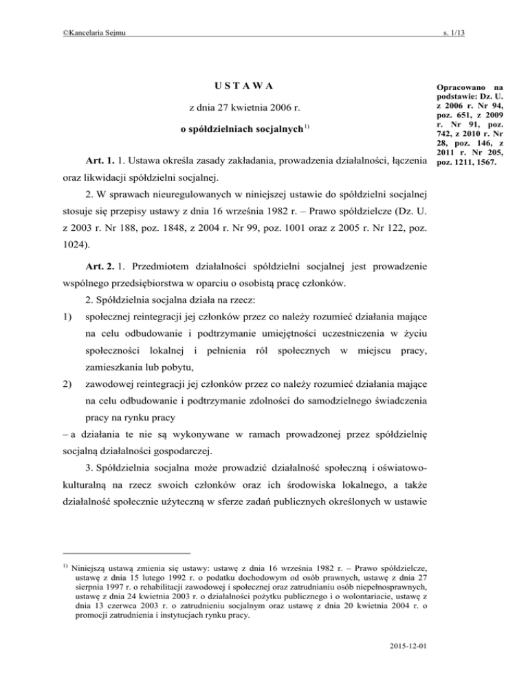 ©Kancelaria Sejmu s. 1/13 USTAWA z dnia 27 kwietnia 2006 r. o spółdzielniach socjalnych 1) Art. 1. 1. Ustawa określa zasady zakładania, prowadzenia działalności, łączenia oraz likwidacji spółdzielni socjalnej. 2. W sprawach nieuregulowanych w niniejszej ustawie do spółdzielni socjalnej stosuje się przepisy ustawy z dnia 16 września 1982 r. – Prawo spółdzielcze (Dz. U. z 2003 r. Nr 188, poz. 1848, z 2004 r. Nr 99, poz. 1001 oraz z 2005 r. Nr 122, poz. 1024). Art. 2. 1. Przedmiotem działalności spółdzielni socjalnej jest prowadzenie wspólnego przedsiębiorstwa w oparciu o osobistą pracę członków. 2. Spółdzielnia socjalna działa na rzecz: 1) społecznej reintegracji jej członków przez co należy rozumieć działania mające na celu odbudowanie i podtrzymanie umiejętności uczestniczenia w życiu społeczności lokalnej i pełnienia ról społecznych w miejscu pracy, zamieszkania lub pobytu, 2) zawodowej reintegracji jej członków przez co należy rozumieć działania mające na celu odbudowanie i podtrzymanie zdolności do samodzielnego świadczenia pracy na rynku pracy – a działania te nie są wykonywane w ramach prowadzonej przez spółdzielnię socjalną działalności gospodarczej. 3. Spółdzielnia socjalna może prowadzić działalność społeczną i oświatowokulturalną na rzecz swoich członków oraz ich środowiska lokalnego, a także działalność społecznie użyteczną w sferze zadań publicznych określonych w ustawie 1) Niniejszą ustawą zmienia się ustawy: ustawę z dnia 16 września 1982 r. – Prawo spółdzielcze, ustawę z dnia 15 lutego 1992 r. o podatku dochodowym od osób prawnych, ustawę z dnia 27 sierpnia 1997 r. o rehabilitacji zawodowej i społecznej oraz zatrudnianiu osób niepełnosprawnych, ustawę z dnia 24 kwietnia 2003 r. o działalności pożytku publicznego i o wolontariacie, ustawę z dnia 13 czerwca 2003 r. o zatrudnieniu socjalnym oraz ustawę z dnia 20 kwietnia 2004 r. o promocji zatrudnienia i instytucjach rynku pracy. 2015-12-01 Opracowano na podstawie: Dz. U. z 2006 r. Nr 94, poz. 651, z 2009 r. Nr 91, poz. 742, z 2010 r. Nr 28, poz. 146, z 2011 r. Nr 205, poz. 1211, 1567. ©Kancelaria Sejmu s. 2/13 z dnia 24 kwietnia 2003 r. o działalności pożytku publicznego i o wolontariacie (Dz. U. Nr 96, poz. 873, z późn. zm. 2)). Art. 3. Nazwa spółdzielni zawiera oznaczenie „Spółdzielnia Socjalna”. Art. 4. 1. Spółdzielnię socjalną mogą założyć: 1) osoby bezrobotne, w rozumieniu art. 2 ust. 1 pkt 2 ustawy z dnia 20 kwietnia 2004 r. o promocji zatrudnienia i instytucjach rynku pracy (Dz. U. Nr 99, poz. 1001, z późn. zm. 3)), 2) osoby, o których mowa w art. 2 pkt 1a i 1b ustawy z dnia 13 czerwca 2003 r. o zatrudnieniu socjalnym (Dz. U. z 2011 r. Nr 43, poz. 225, z późn. zm. 4)), 3) osoby niepełnosprawne, w rozumieniu ustawy z dnia 27 sierpnia 1997 r. o rehabilitacji zawodowej i społecznej oraz zatrudnianiu osób niepełnosprawnych (Dz. U. Nr 123, poz. 776, z późn. zm. 5)), 4) osoby do 30. roku życia oraz po ukończeniu 50. roku życia, posiadające status osoby poszukującej pracy, bez zatrudnienia w rozumieniu ustawy z dnia 20 kwietnia 2004 r. o promocji zatrudnienia i instytucjach rynku pracy – posiadające pełną zdolność do czynności prawnych. 2. Spółdzielnię socjalną mogą założyć także: 1) inne osoby niż wskazane w ust. 1, o ile liczba tych osób nie stanowi więcej niż 50% ogólnej liczby założycieli; 2) organizacje pozarządowe w rozumieniu przepisów o działalności pożytku publicznego i o wolontariacie lub jednostki samorządu terytorialnego; 3) kościelne osoby prawne. Zmiany wymienionej ustawy zostały ogłoszone w Dz. U. z 2004 r. Nr 64, poz. 593, Nr 116, poz. 1203 i Nr 210, poz. 2135 oraz z 2005 r. Nr 155, poz. 1298, Nr 169, poz. 1420, Nr 175, poz. 1462 i Nr 249, poz. 2104. 3) Zmiany wymienionej ustawy zostały ogłoszone w Dz. U. z 2004 r. Nr 273, poz. 2703 oraz z 2005 r. Nr 64, poz. 565, Nr 94, poz. 788, Nr 164, poz. 1366, Nr 175, poz. 1462 i Nr 267, poz. 2257. 4) Zmiany tekstu jednolitego wymienionej ustawy zostały ogłoszone w Dz. U. z 2011 r. Nr 205, poz. 1211 oraz z 2015 r. poz. 1220 i 1567. 5) Zmiany wymienionej ustawy zostały ogłoszone w Dz. U. z 1997 r. Nr 160, poz. 1082, z 1998 r. Nr 99, poz. 628, Nr 106, poz. 668, Nr 137, poz. 887, Nr 156, poz. 1019 i Nr 162, poz. 1118 i 1126, z 1999 r. Nr 49, poz. 486, Nr 90, poz. 1001, Nr 95, poz. 1101 i Nr 111, poz. 1280, z 2000 r. Nr 48, poz. 550 i Nr 119, poz. 1249, z 2001 r. Nr 39, poz. 459, Nr 100, poz. 1080, Nr 125, poz. 1368, Nr 129, poz. 1444 i Nr 154, poz. 1792 i 1800, z 2002 r. Nr 169, poz. 1387, Nr 200, poz. 1679 i 1683 i Nr 241, poz. 2074, z 2003 r. Nr 7, poz. 79, Nr 90, poz. 844, Nr 223, poz. 2217 i Nr 228, poz. 2262, z 2004 r. Nr 96, poz. 959, Nr 99, poz. 1001 i Nr 240, poz. 2407, z 2005 r. Nr 44, poz. 422, Nr 132, poz. 1110, Nr 163, poz. 1362, Nr 164, poz. 1366 i Nr 167, poz. 1398 oraz z 2006 r. Nr 63, poz. 440. 2) 2015-12-01 ©Kancelaria Sejmu s. 3/13 Art. 5. 1. Liczba założycieli spółdzielni socjalnej nie może być mniejsza niż pięć, jeżeli założycielami są osoby fizyczne, i dwa, jeżeli założycielami są osoby prawne. 2. Spółdzielnia socjalna liczy nie mniej niż pięciu i nie więcej niż pięćdziesięciu członków, z zastrzeżeniem ust. 3. 3. Spółdzielnia socjalna, która powstała w wyniku przekształcenia spółdzielni inwalidów lub spółdzielni niewidomych może liczyć więcej niż pięćdziesięciu członków. 4. Członkostwo w spółdzielni socjalnej mogą nabyć osoby, o których mowa w art. 4 ust. 1, w tym osoby posiadające ograniczoną zdolność do czynności prawnych. 5. Członkostwo w spółdzielni socjalnej mogą nabyć także inne osoby niż wskazane w art. 4 ust. 1 i ust. 2 pkt 1, jeżeli ich praca na rzecz spółdzielni socjalnej wymaga szczególnych kwalifikacji, których nie posiadają pozostali członkowie tej spółdzielni. 6. Liczba osób, o kt